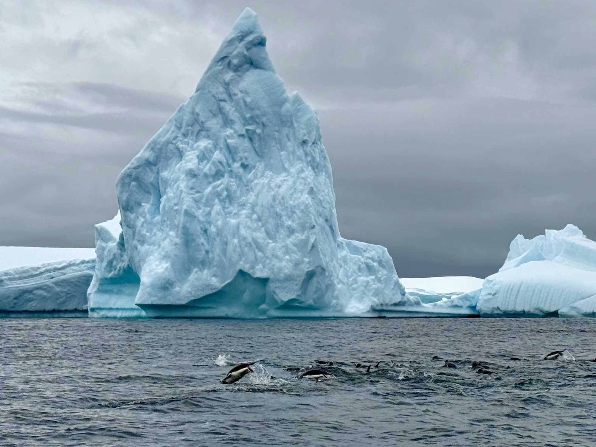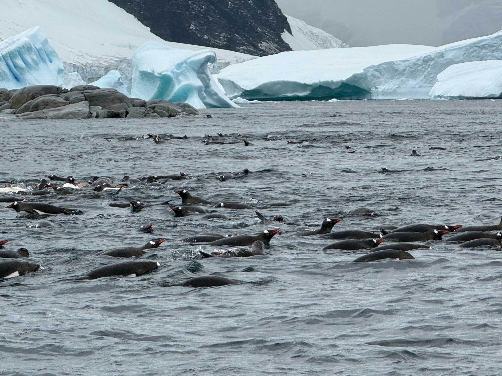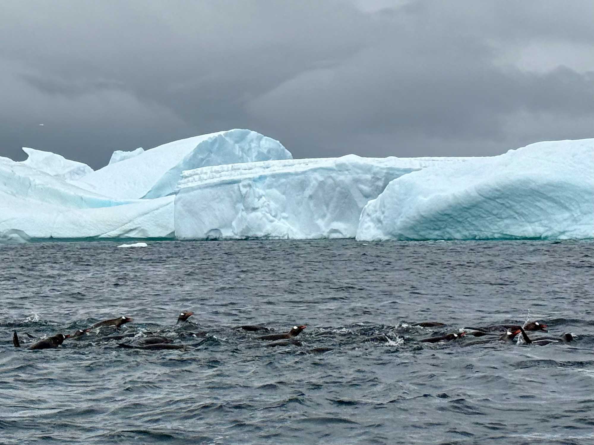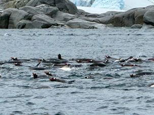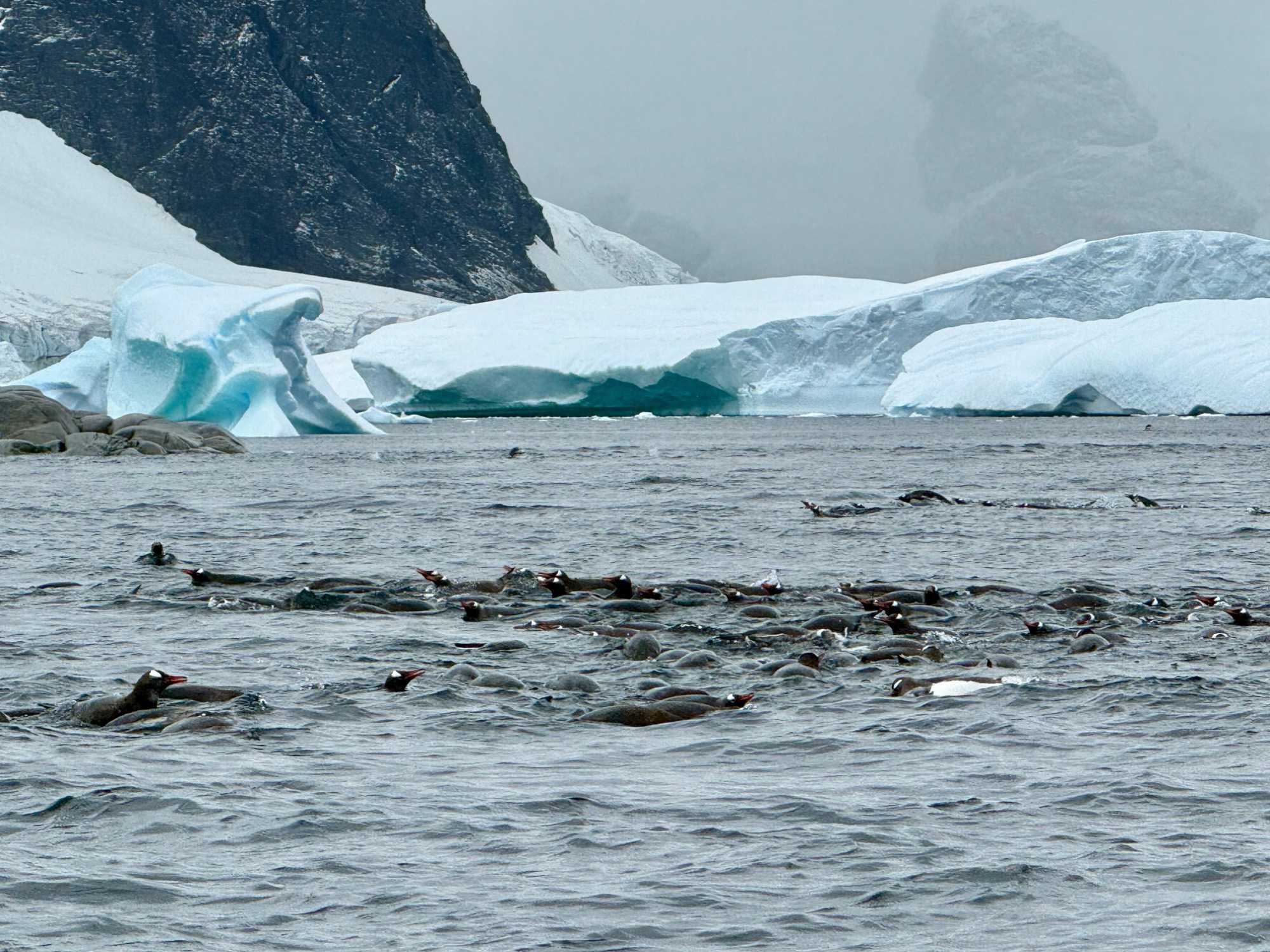 Je n’avais jamais entendu cette expression auparavant, et pourtant, quelle image parfaite! Un radeau de manchots, c’est un immense groupe de manchots réunis à la surface de l’eau, partant ensemble à la pêche. Ils plongent à tour de rôle, surgissent, replongent… des centaines de manchots, vivants, dynamiques, partout autour de nous.