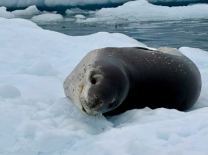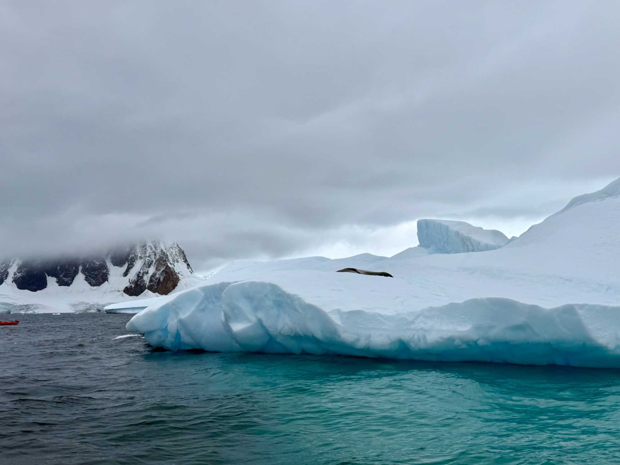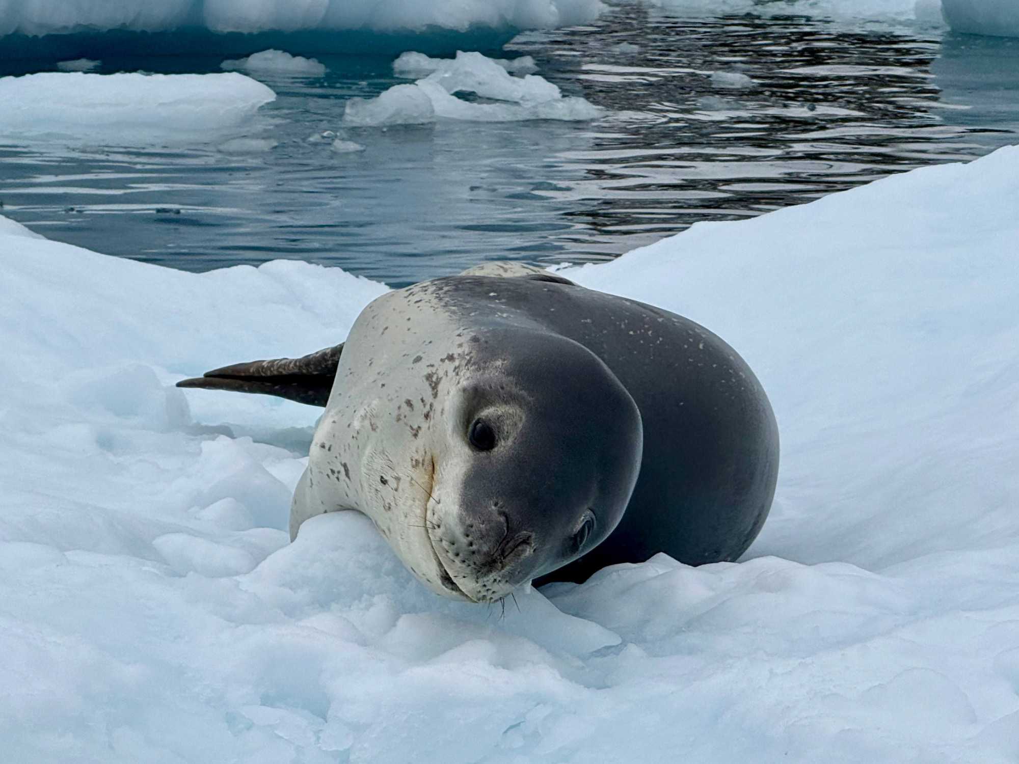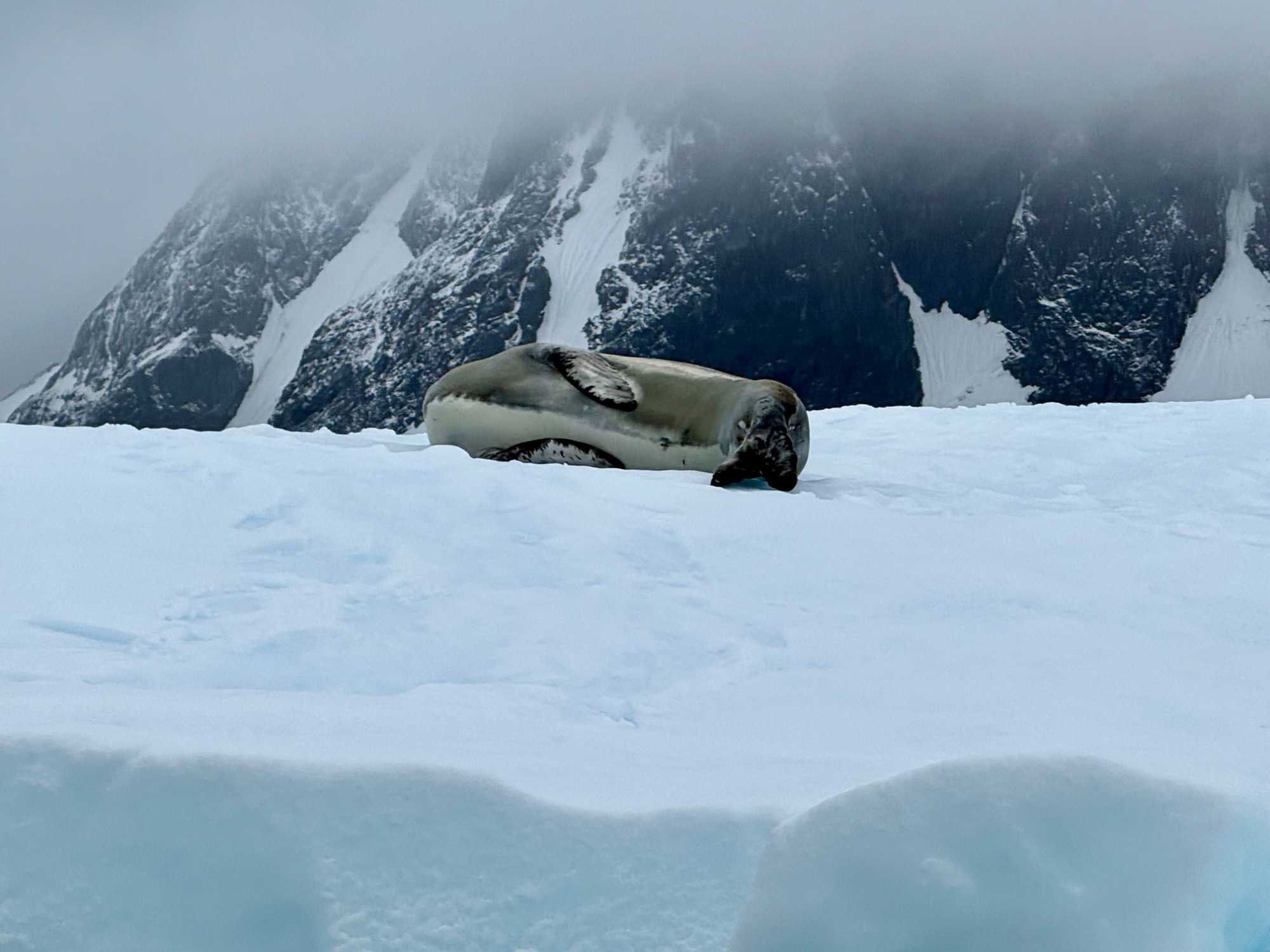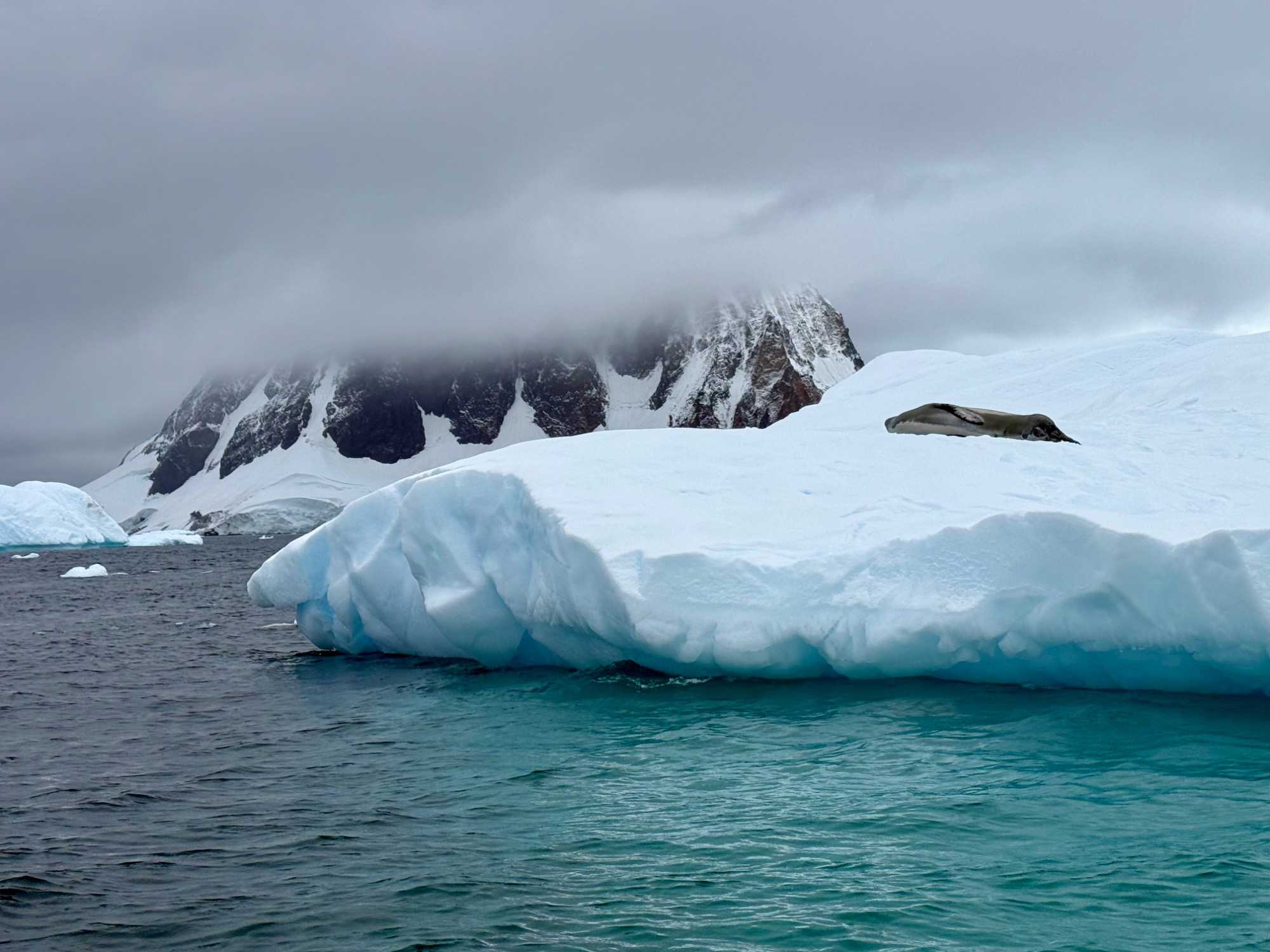 - un phoque léopard, allongé sur un iceberg, se dorant au soleil