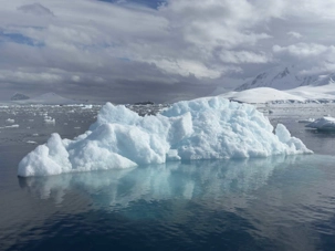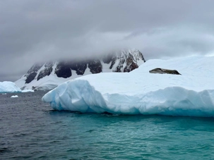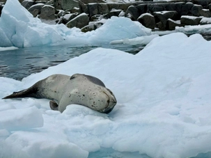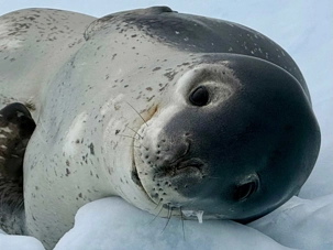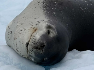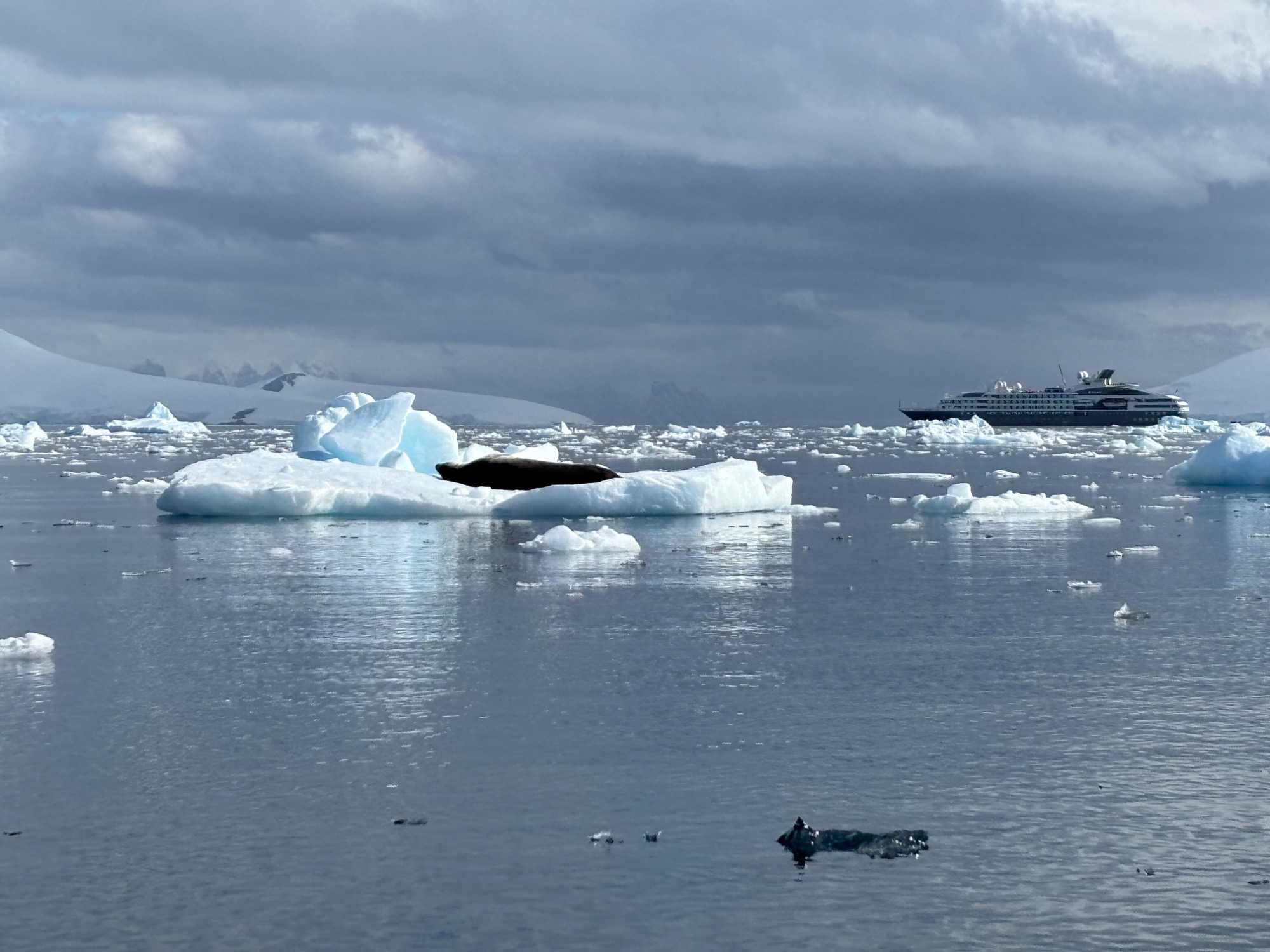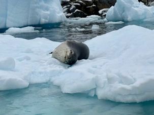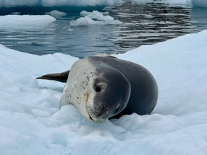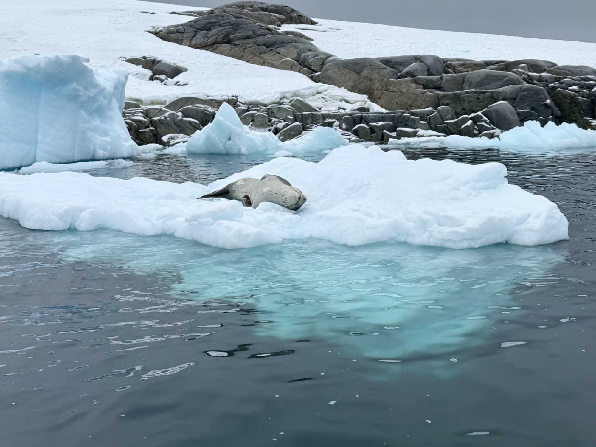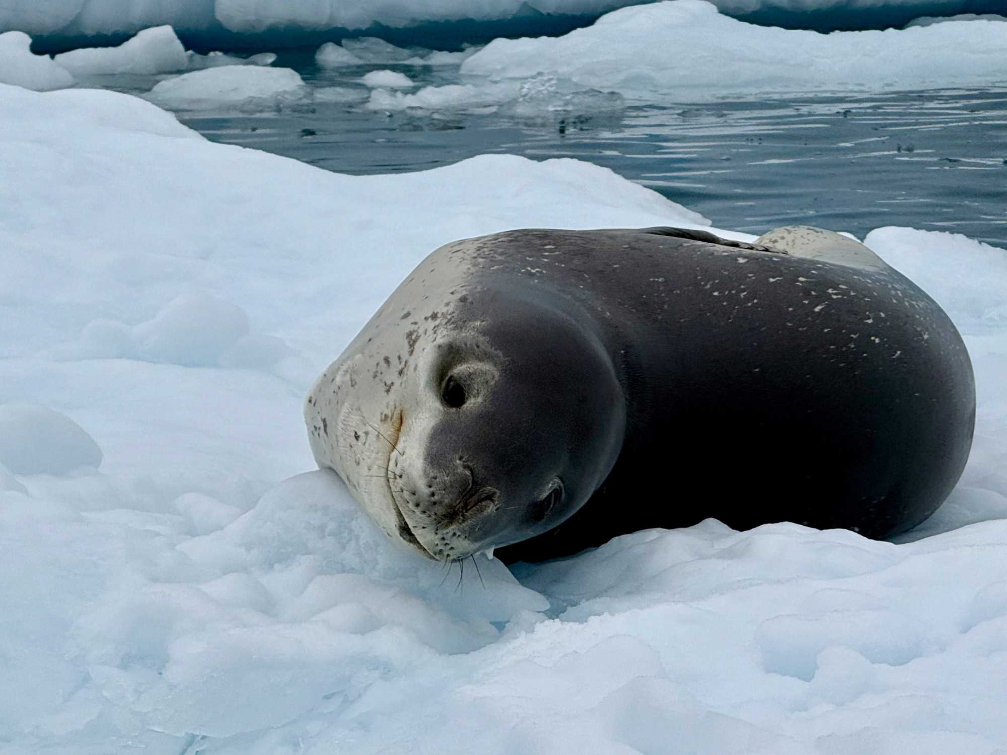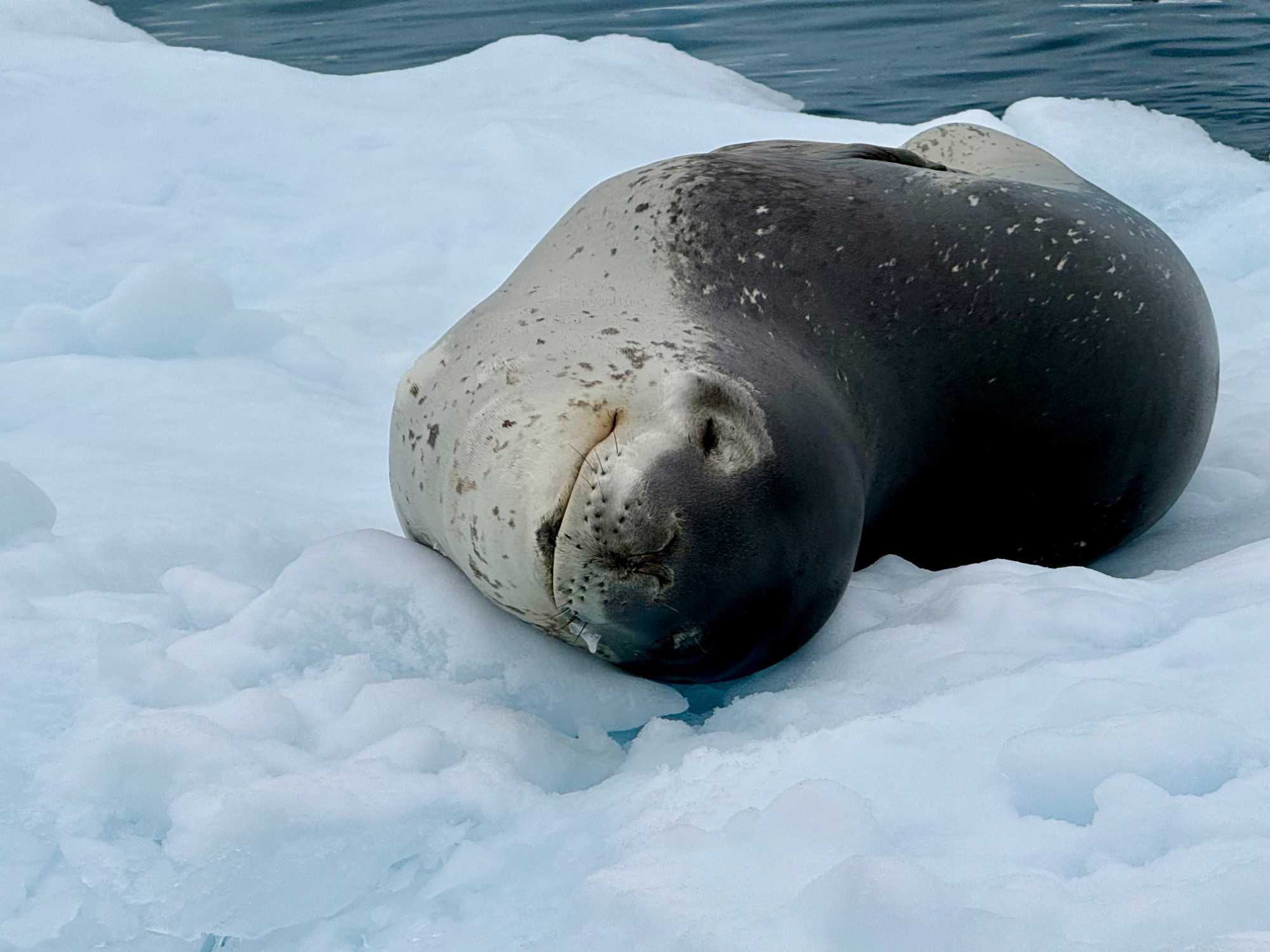 - un phoque léopard, allongé sur un iceberg, se dorant au soleil
