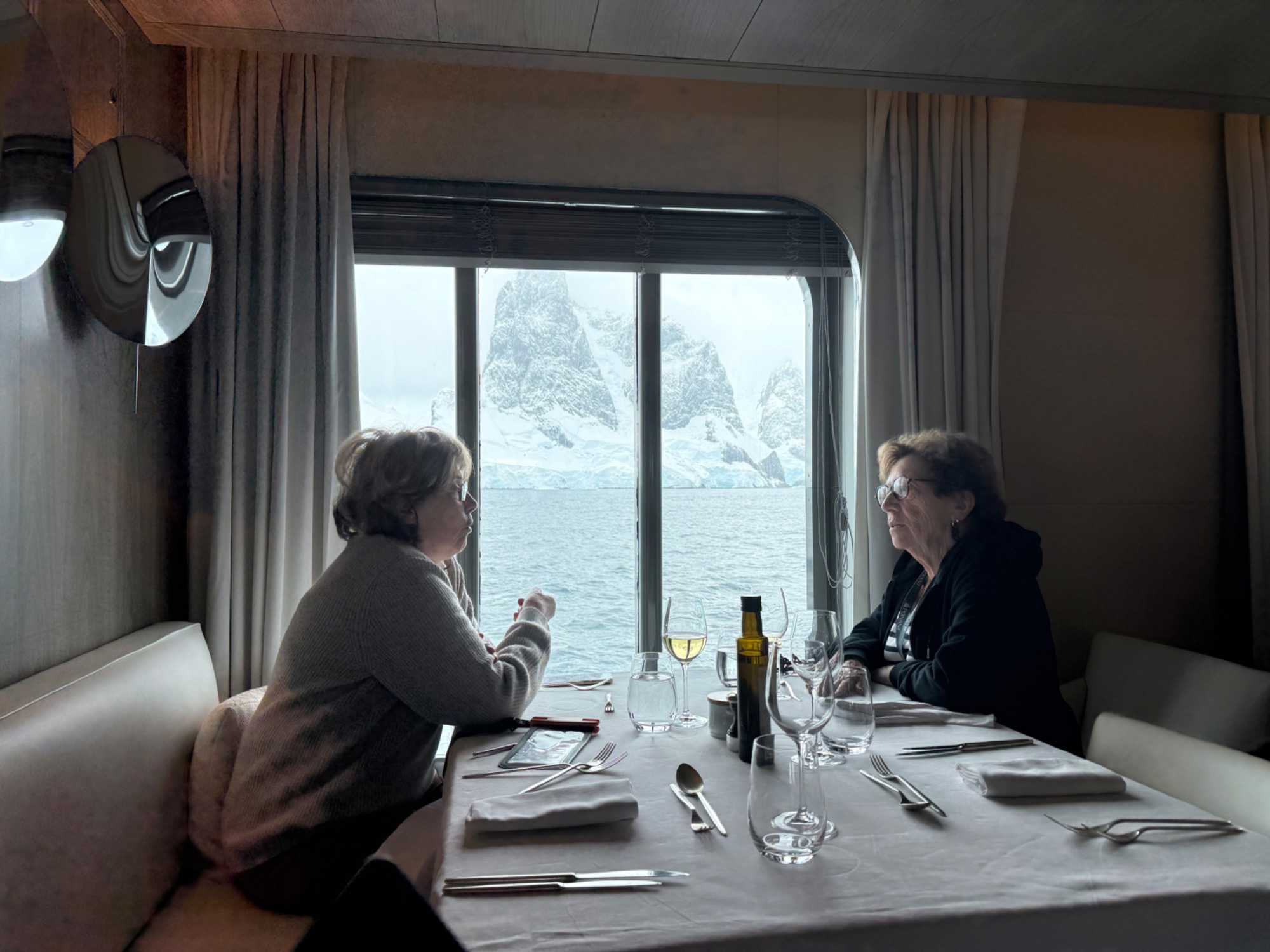 Une des tables partageait le repas avec Rodrigo, naturaliste que je connais depuis plusieurs expéditions en Antarctique et ailleurs. Il avait accepté de se joindre à des voyageurs curieux d’entendre ses histoires, ses expériences… un moment privilégié et très apprécié.