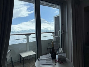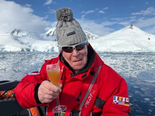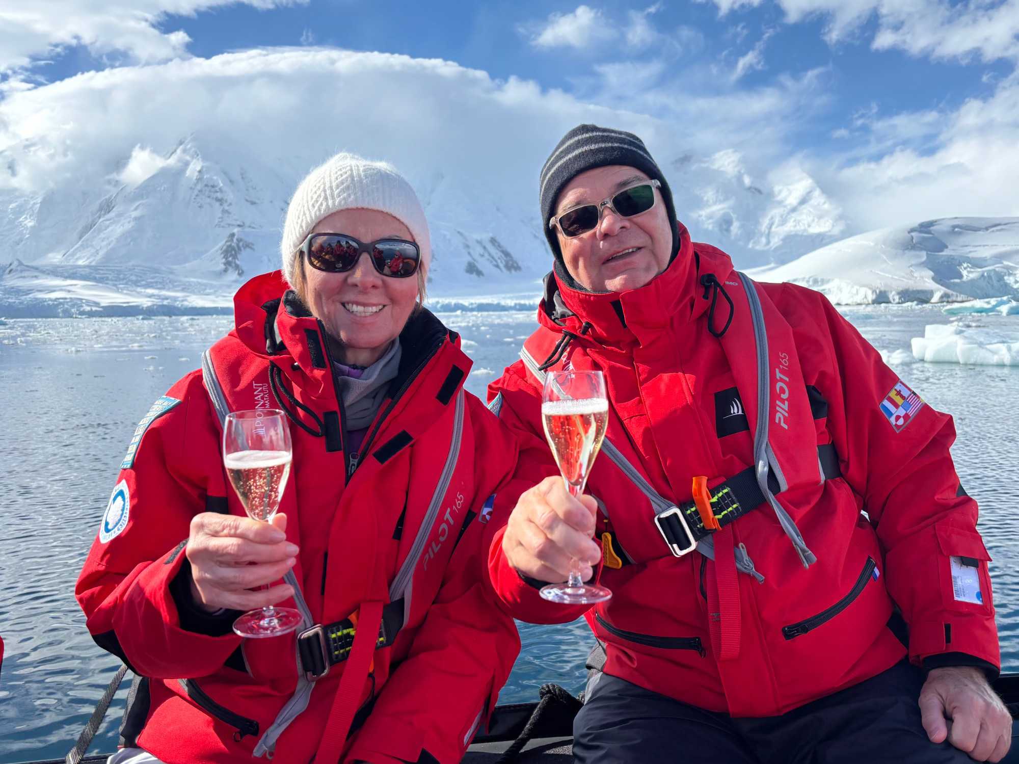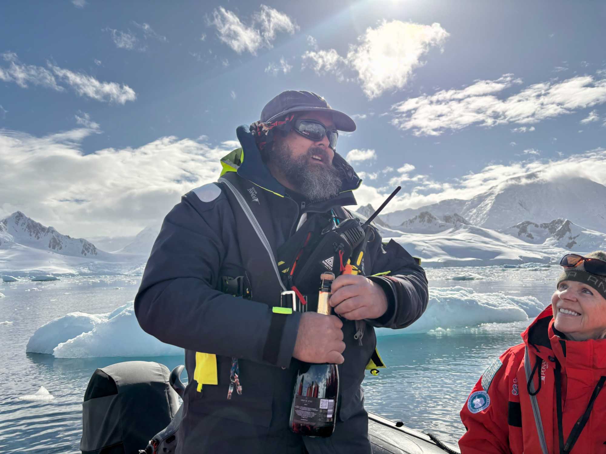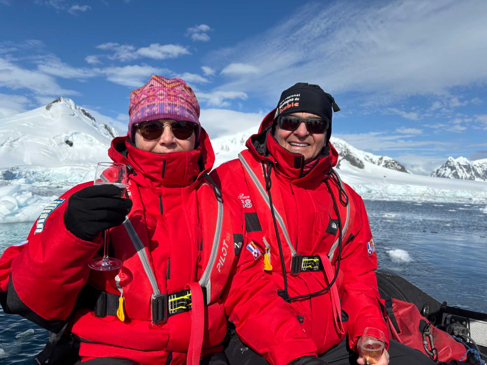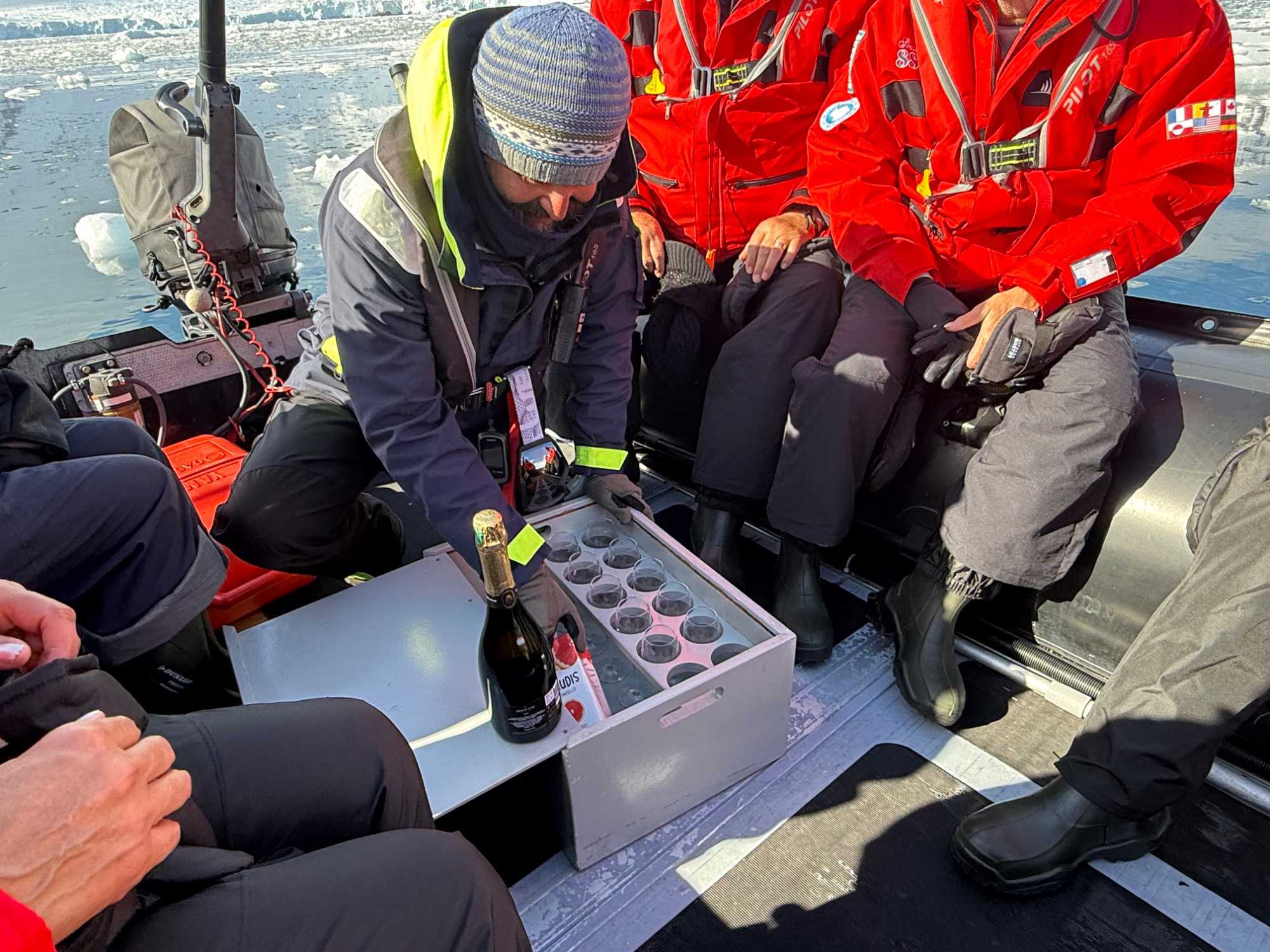 Partager une coupe de champagne, en vrais verres, au cœur de cette baie irréelle, entourés de sommets immenses et de glaciers… c’était tout simplement indescriptible.