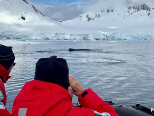 « Petit changement… il se passe quelque chose de magistral un peu plus loin dans la baie. On fait une balade en zodiac avant votre débarquement. »