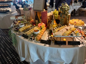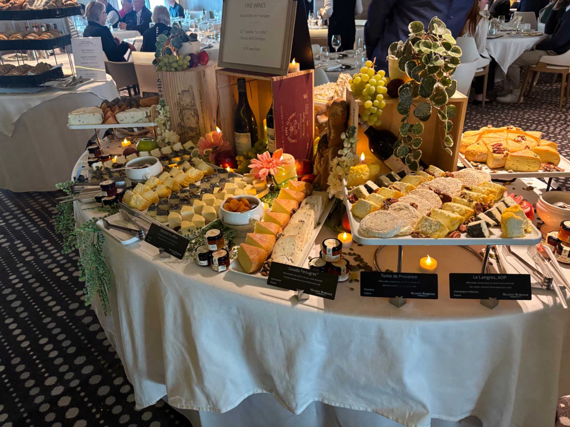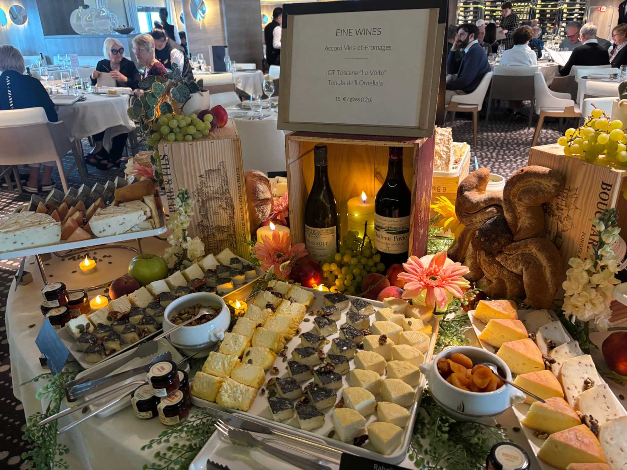 Le cocktail nous réunit comme chaque soir. Puis, en entrant dans la salle à manger, une gigantesque table de fromages nous attend déjà. Des fromages français dignes de Ponant, magnifiquement présentés. J’ai pris des photos… et bien sûr, nous avons gardé de la place pour les déguster!
