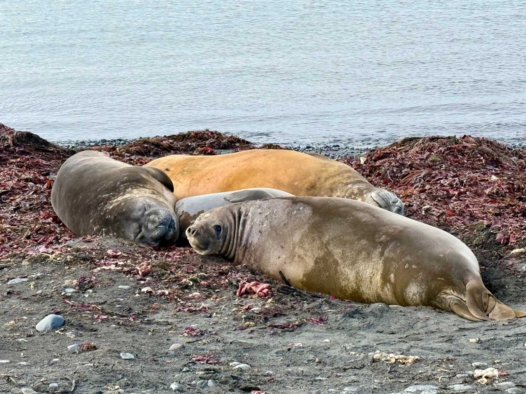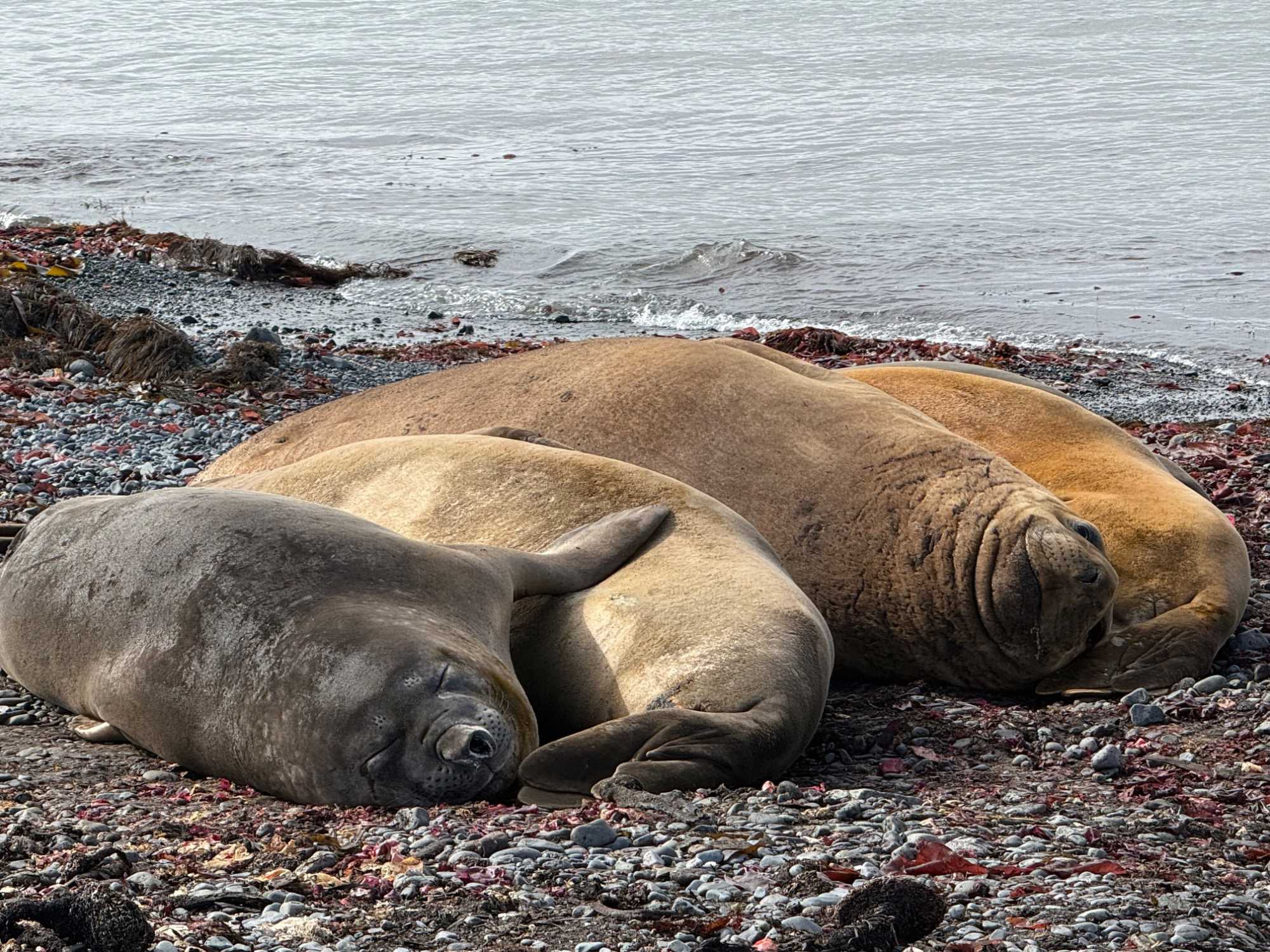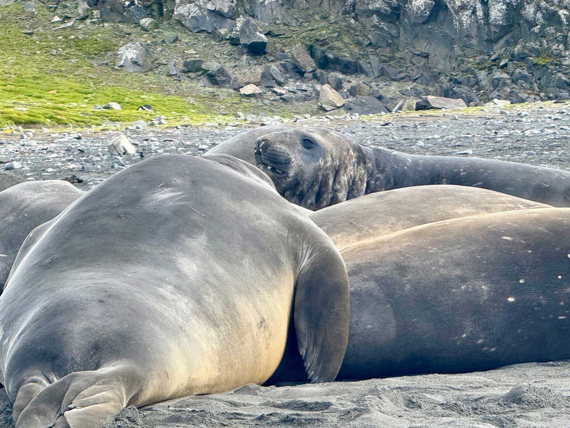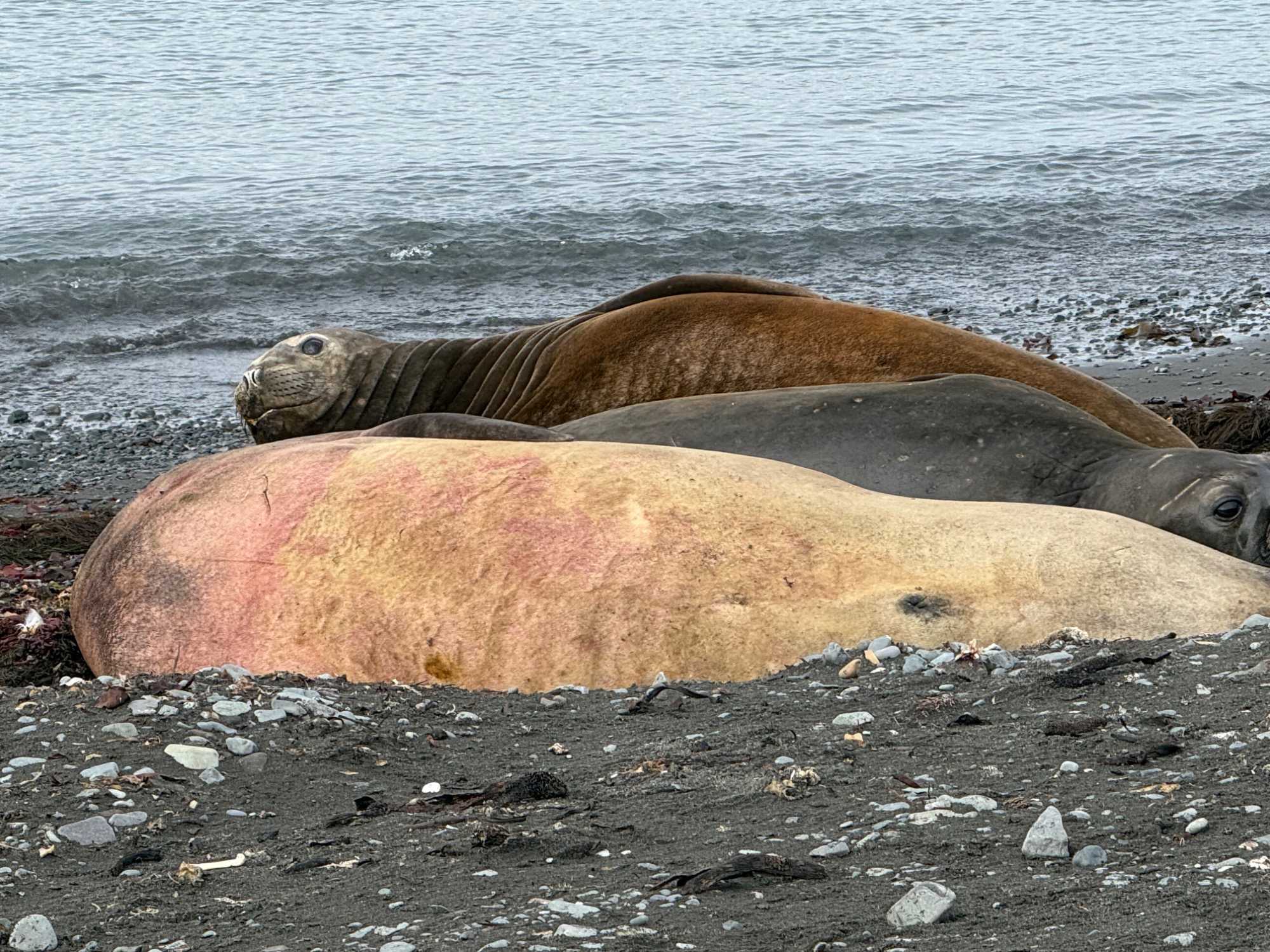 À Elephant Point, nous avons pu les observer au repos, étendus sur les plages de galets, souvent immobiles, parfois en train de se redresser légèrement pour nous observer… comme s’ils nous étudiaient à leur tour.