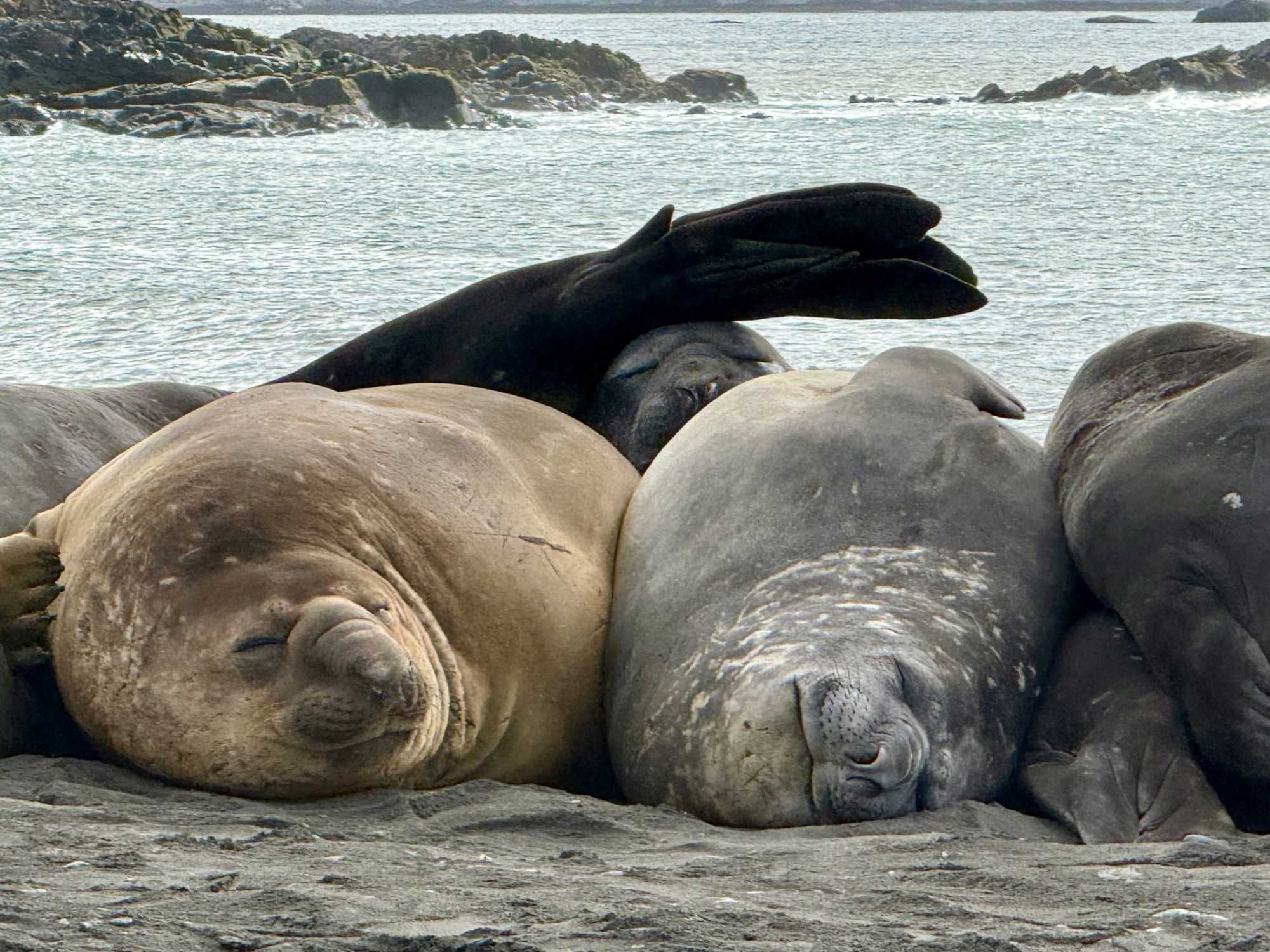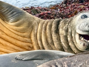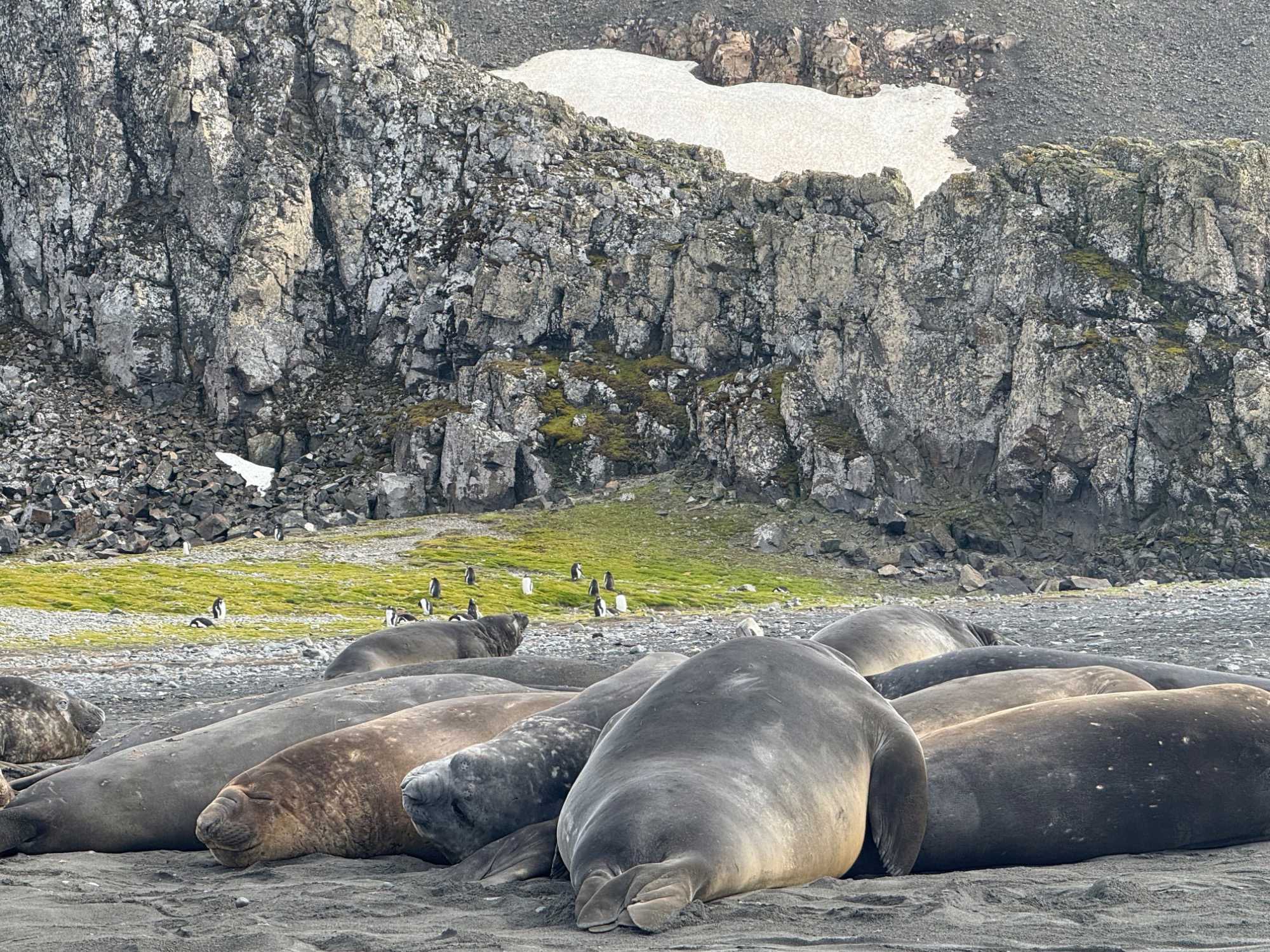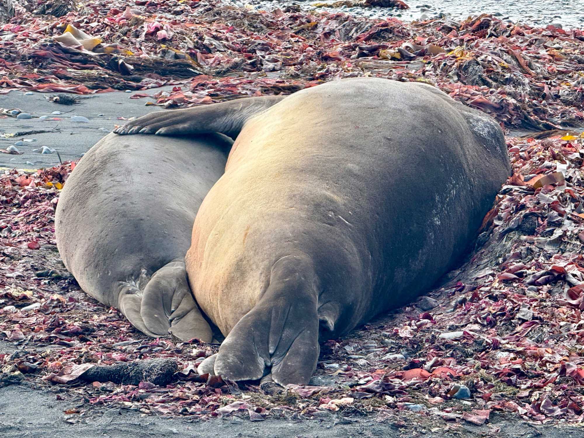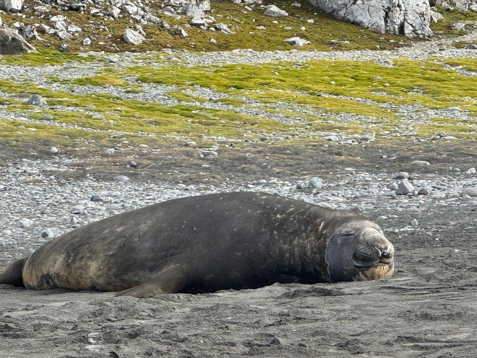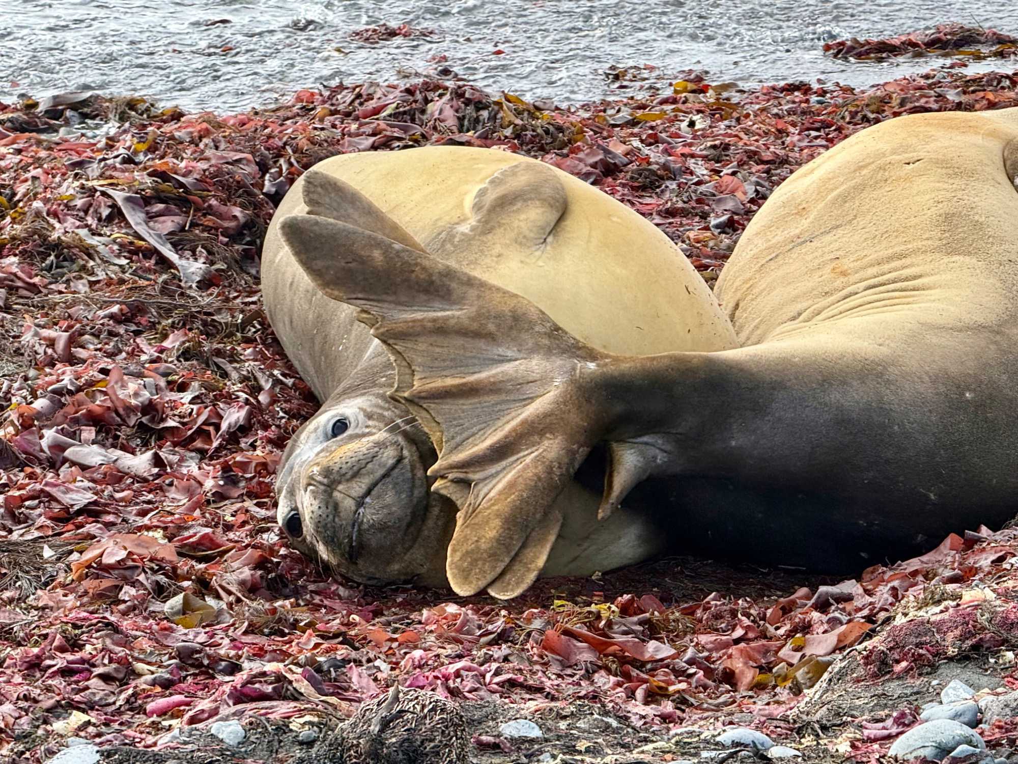 À Elephant Point, nous avons pu les observer au repos, étendus sur les plages de galets, souvent immobiles, parfois en train de se redresser légèrement pour nous observer… comme s’ils nous étudiaient à leur tour.