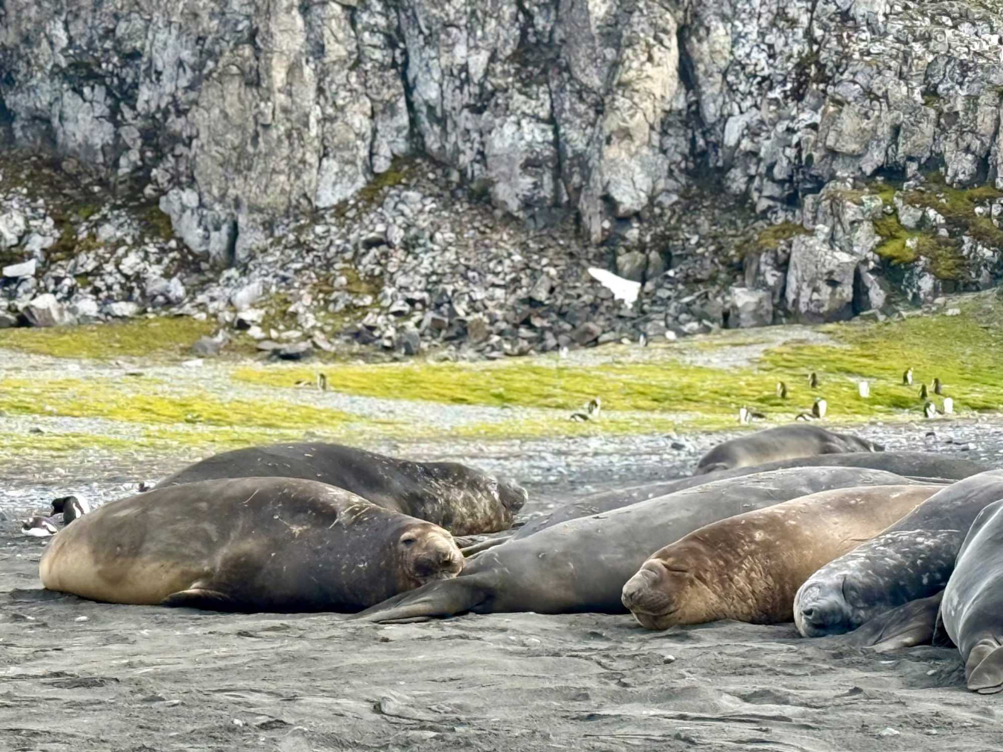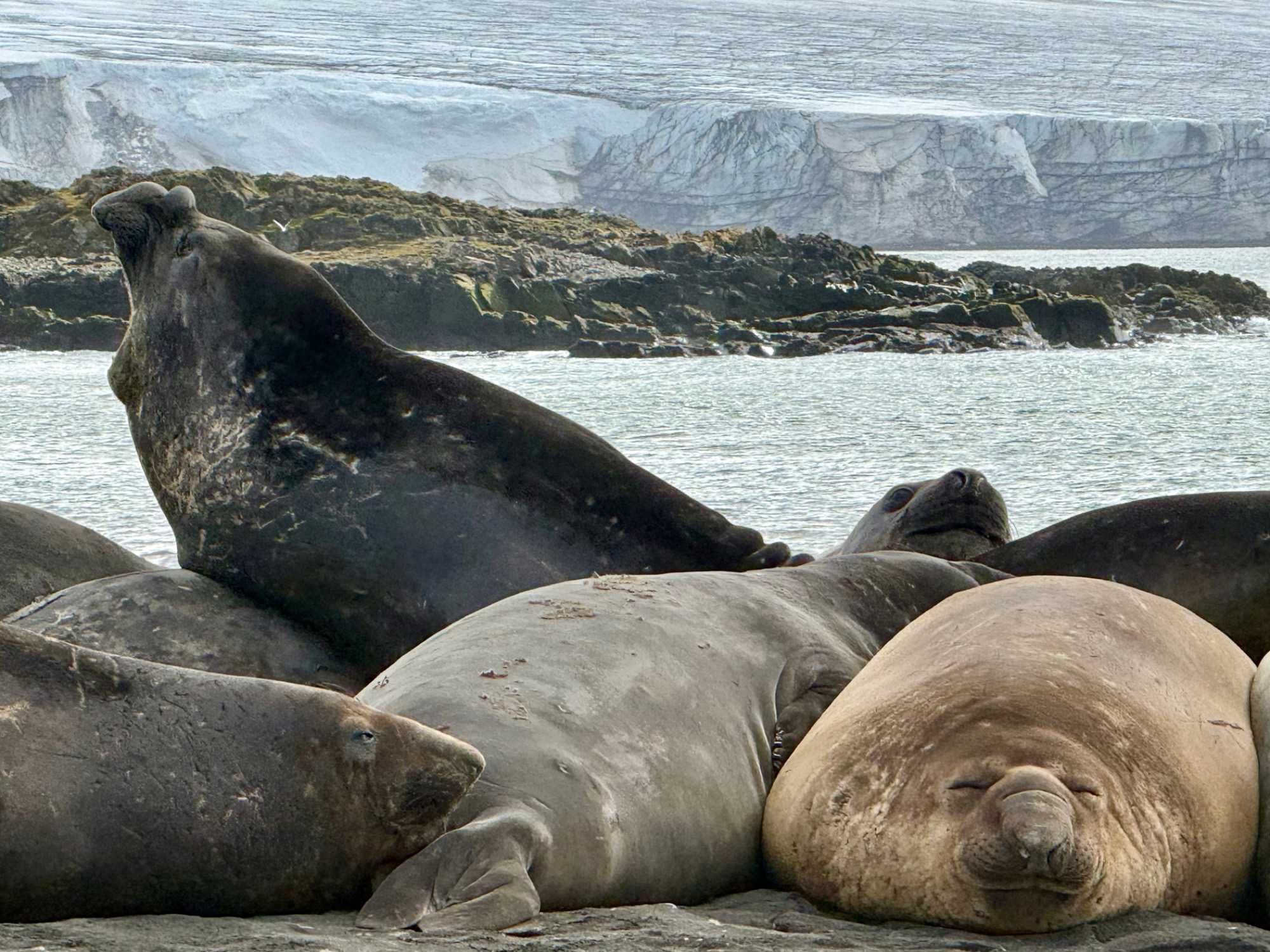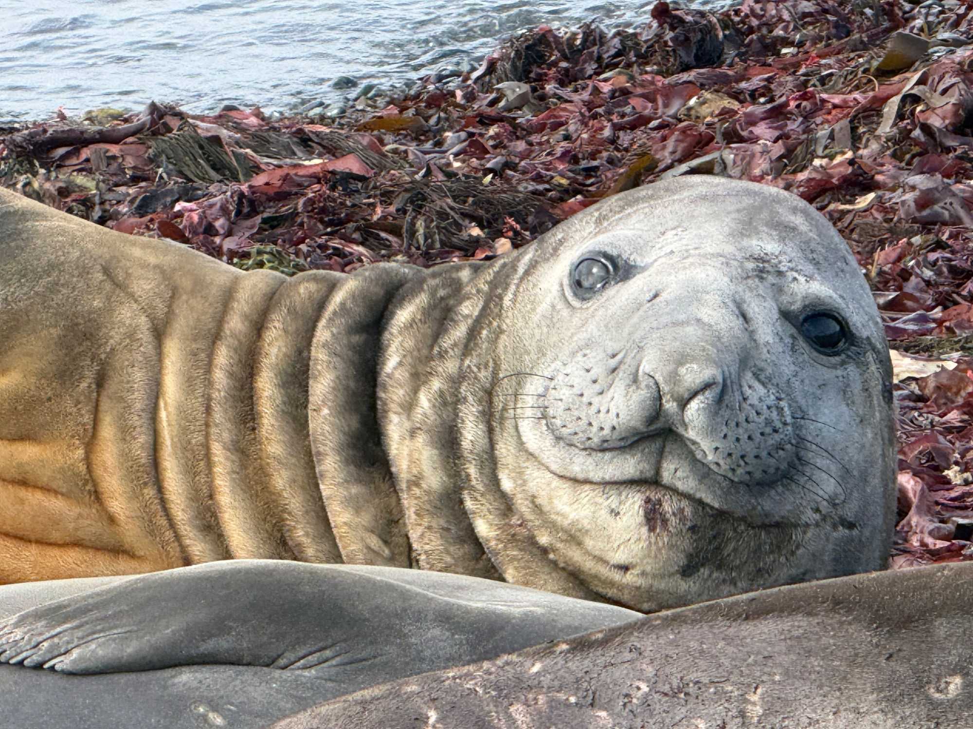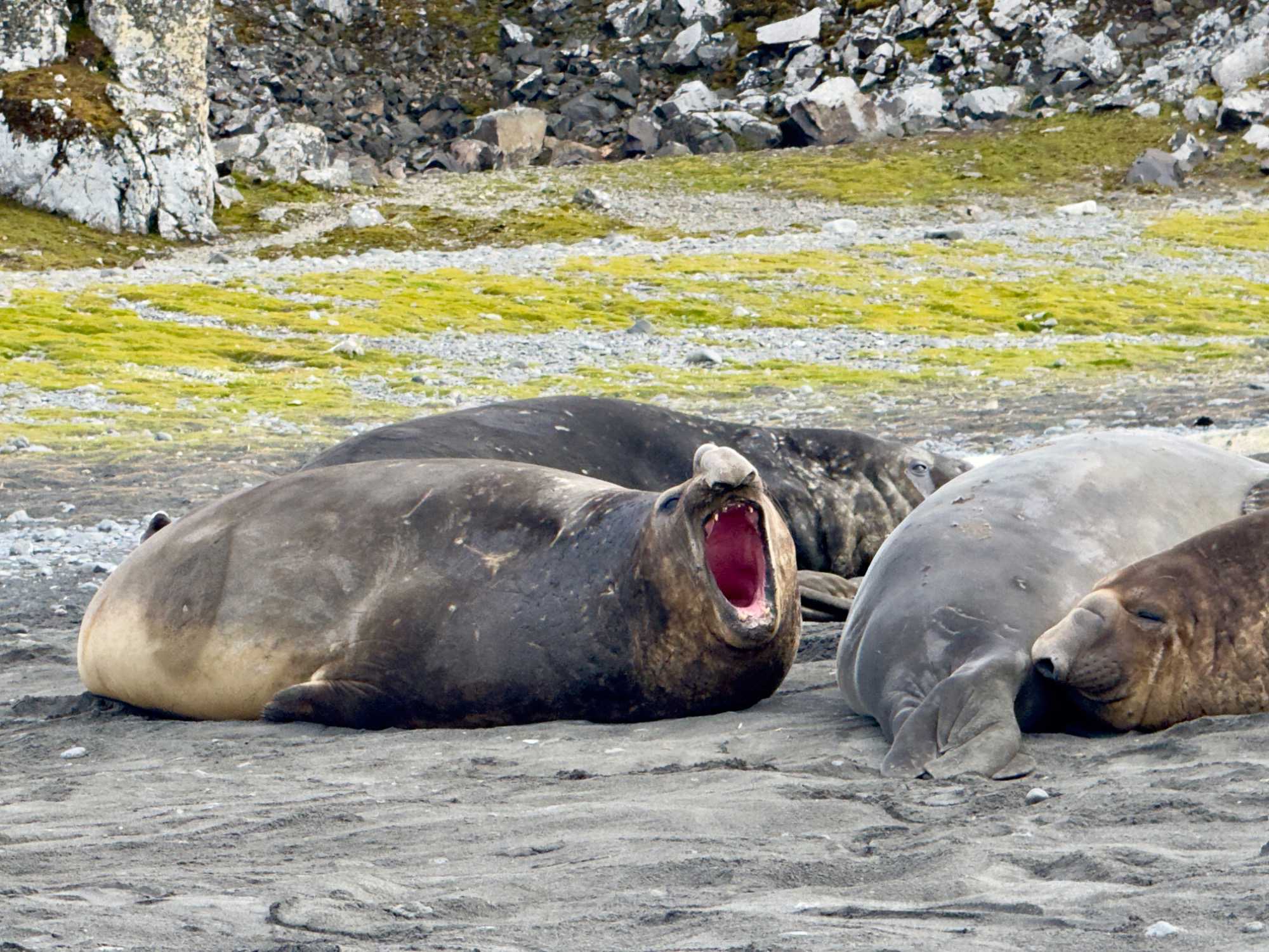 À Elephant Point, nous avons pu les observer au repos, étendus sur les plages de galets, souvent immobiles, parfois en train de se redresser légèrement pour nous observer… comme s’ils nous étudiaient à leur tour.
