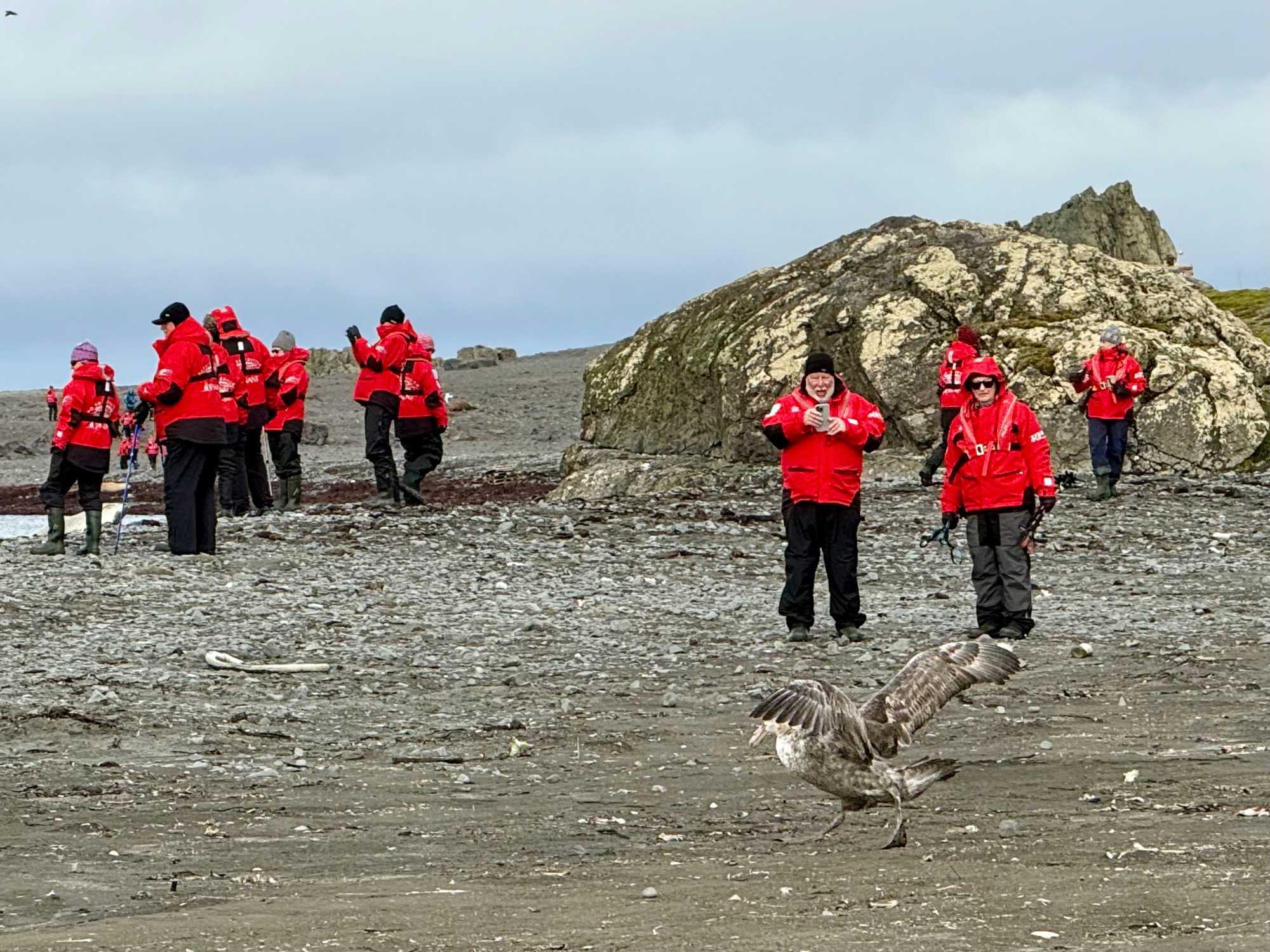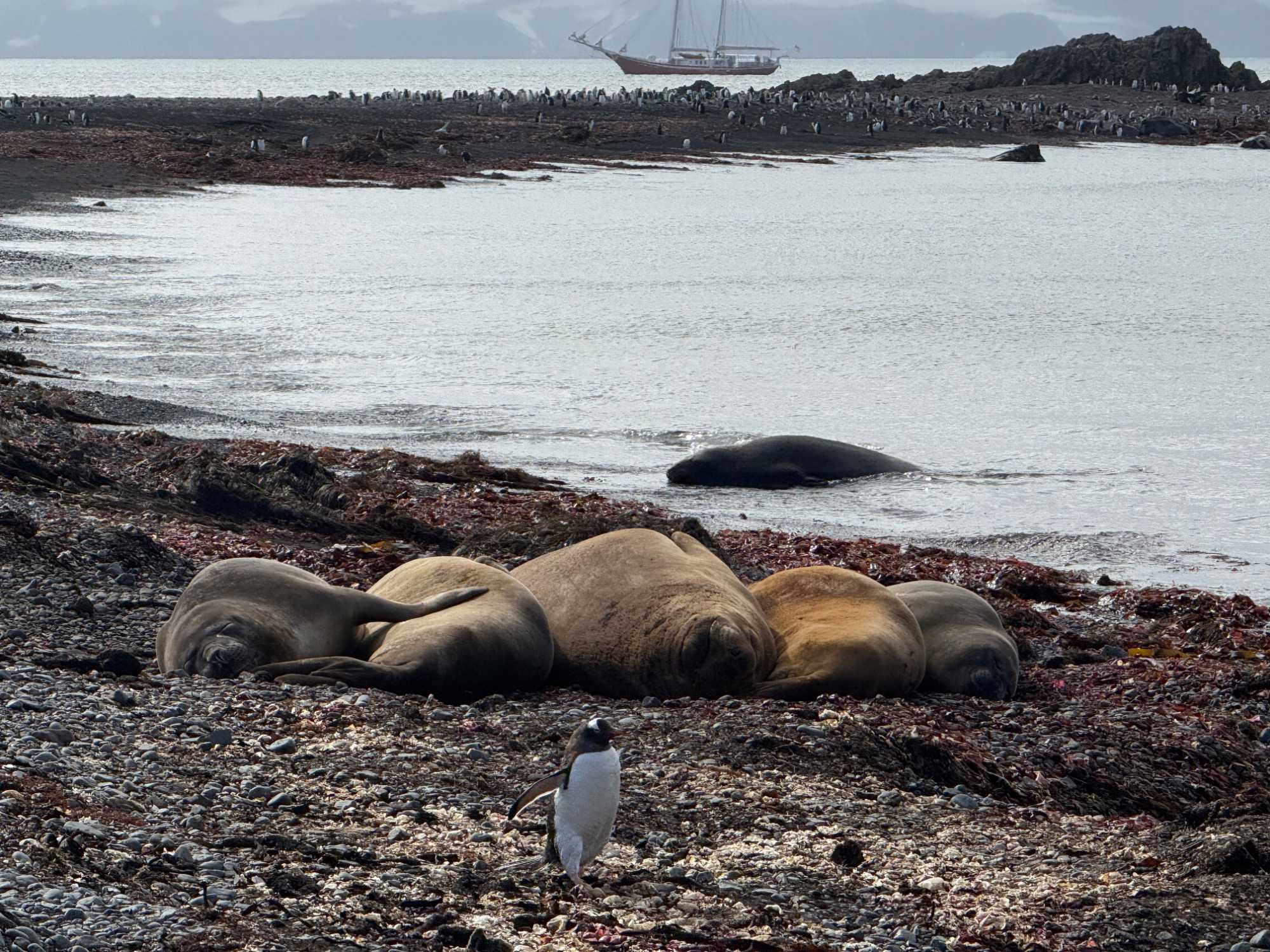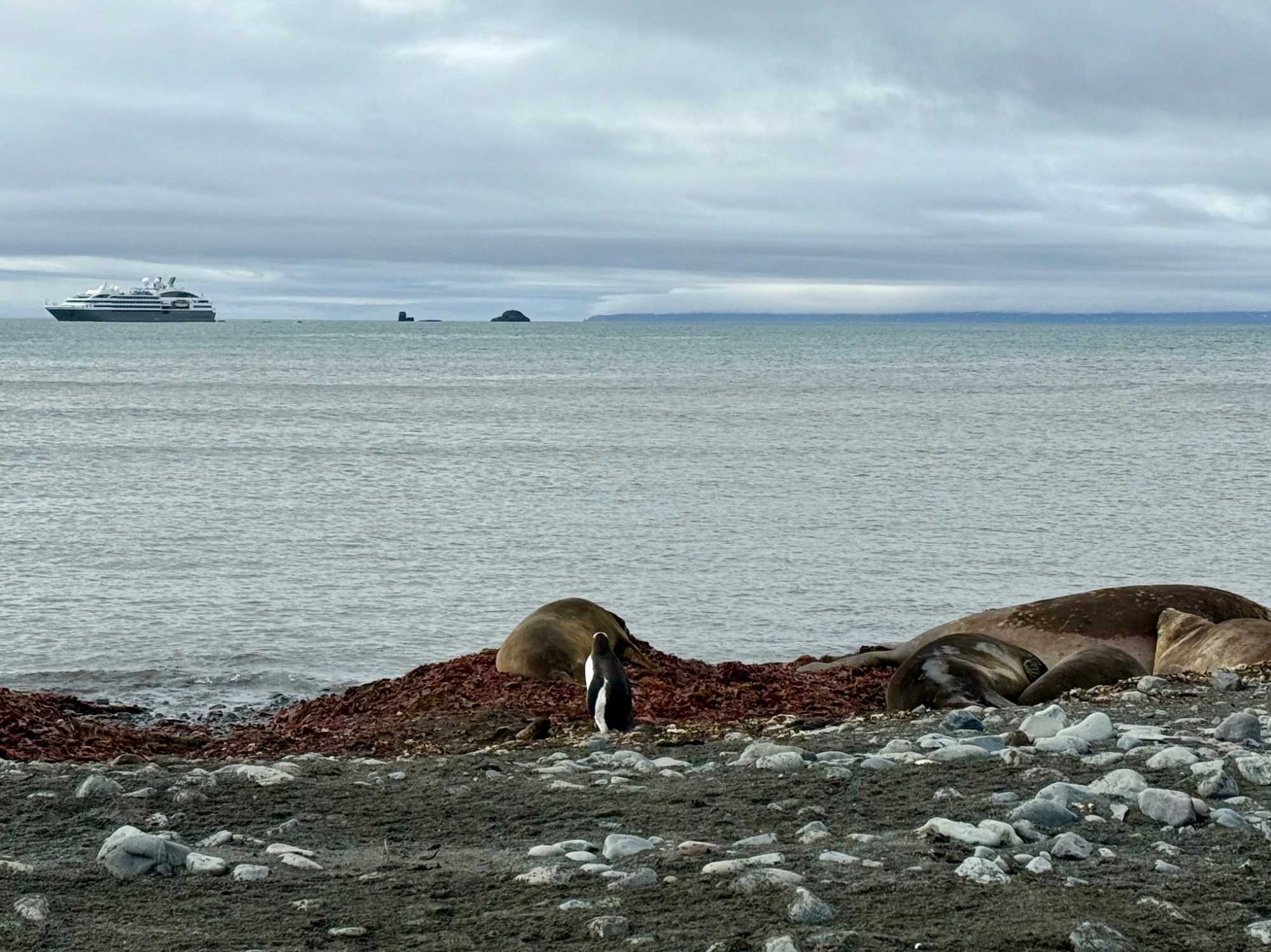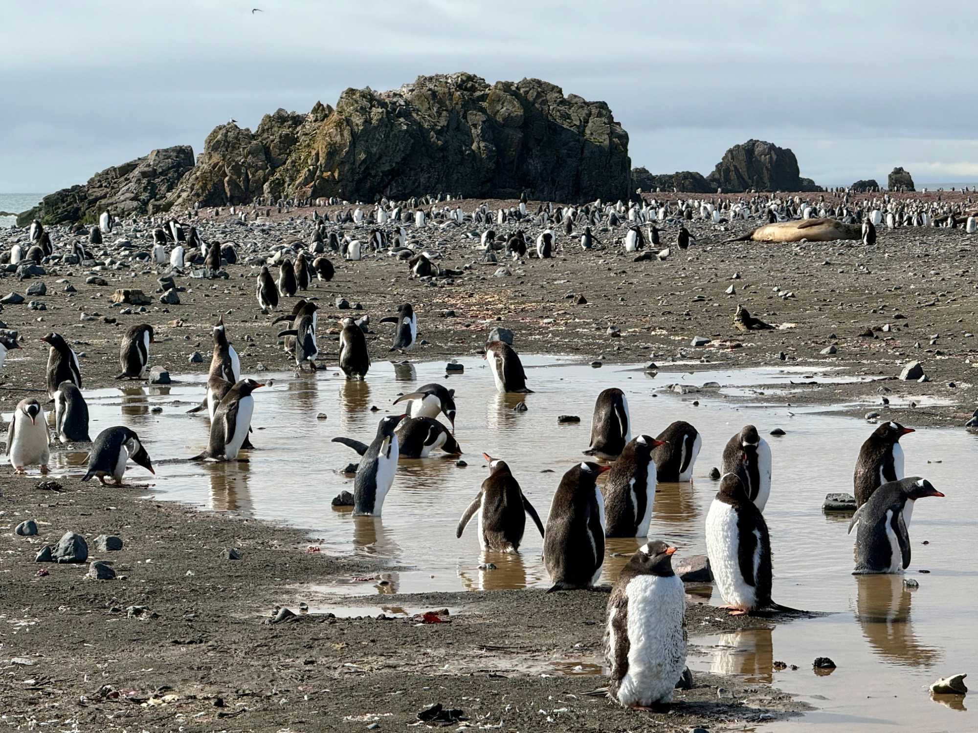 Dès notre arrivée, on sent que nous sommes au cœur de ce que l’on appelle souvent l’Antarctique sauvage. Ici, la faune est riche, variée, omniprésente. Nous avons observé de superbes colonies de manchots papous et de manchots à jugulaire, mais surtout… ce qui nous a particulièrement marqués ce matin :