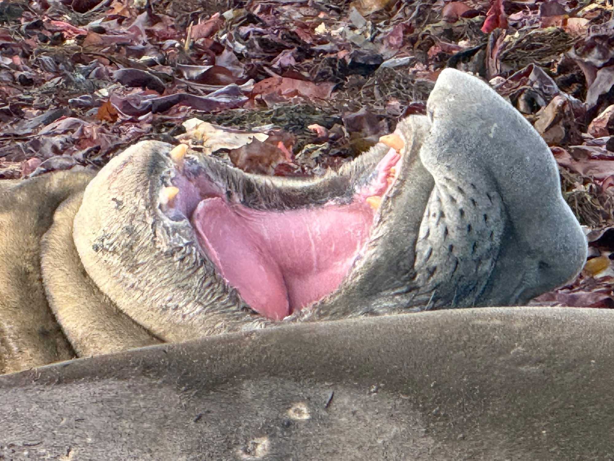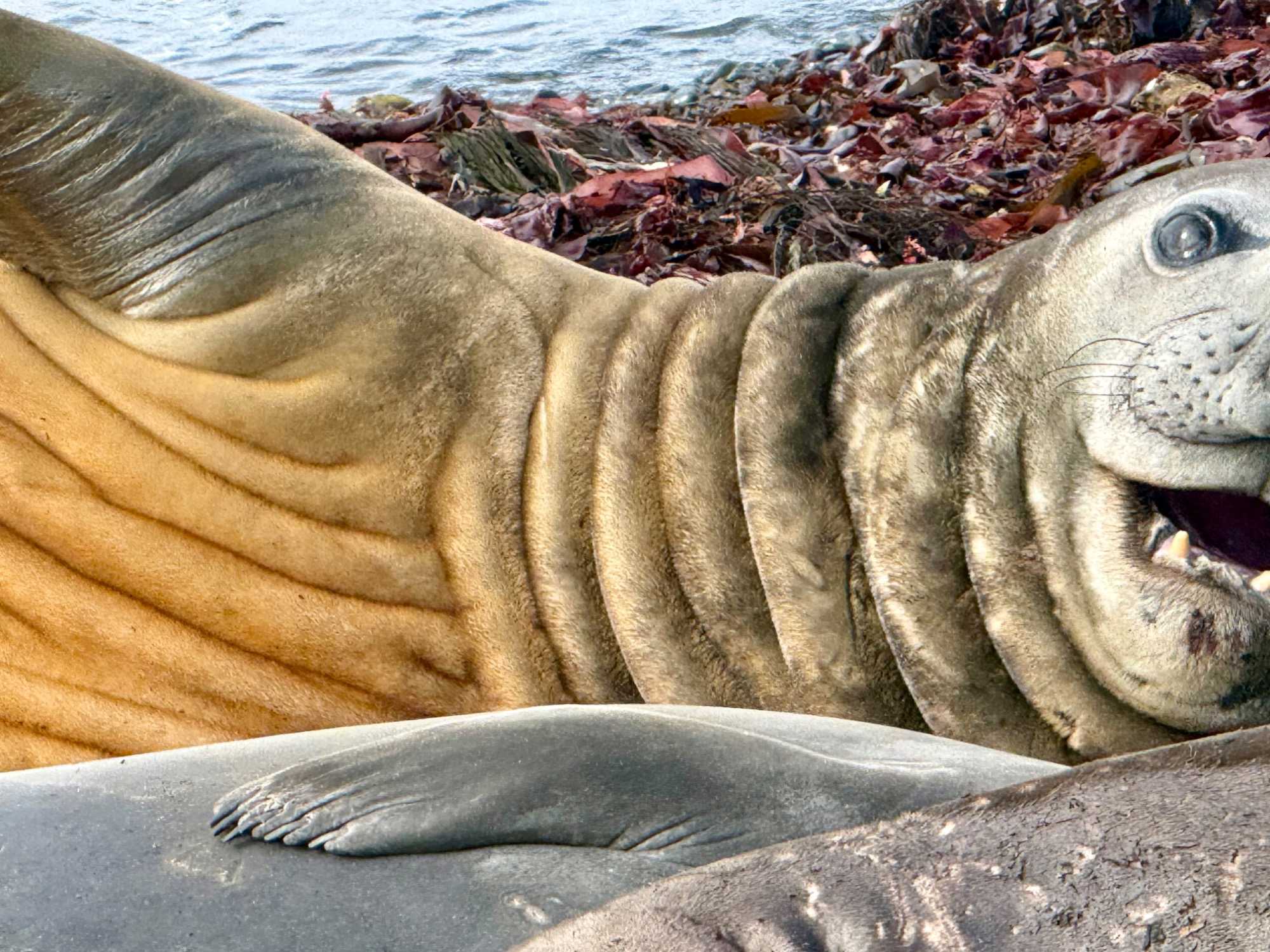 Les éléphants de mer sont les plus grands phoques au monde. Les mâles adultes peuvent atteindre jusqu’à 5 à 6 tonnes (plus de 12 000 livres) et mesurer près de 6 mètres de long. Leur nom vient de cette impressionnante trompe — surtout visible chez les mâles — qui rappelle vaguement celle d’un éléphant.
