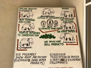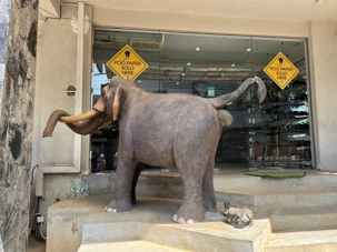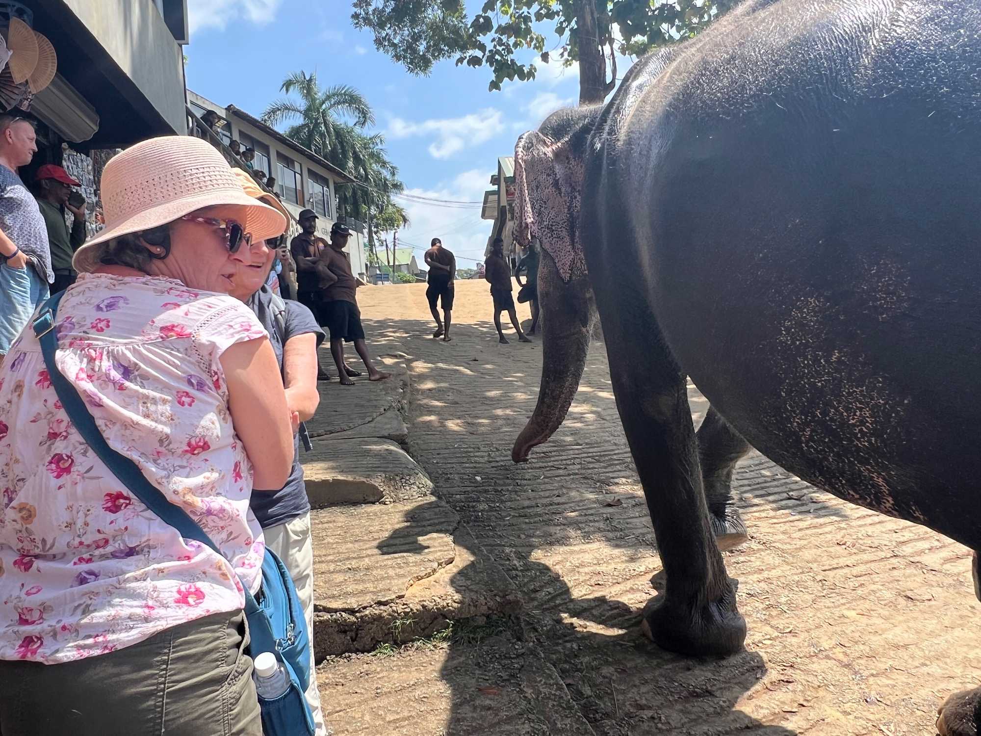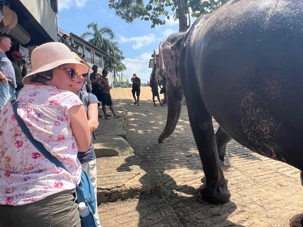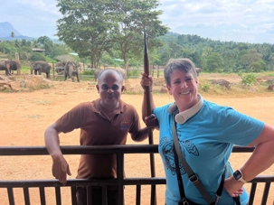 À notre arrivée, nous descendons la grande rue, et… surprise, nous voyons les éléphants qui prennent leur bain et leur douche! Il y en a plus d’une vingtaine. Ce que je trouve le plus drôle, c’est lorsque ces mastodontes remontent la côte pour retourner à l’orphelinat. Ils passent tout près, mais vraiment tout près, de nous. Lysette se met derrière moi et d’autres se reculent de quelques pieds pour éviter leurs trompes baladeuses 🤪.