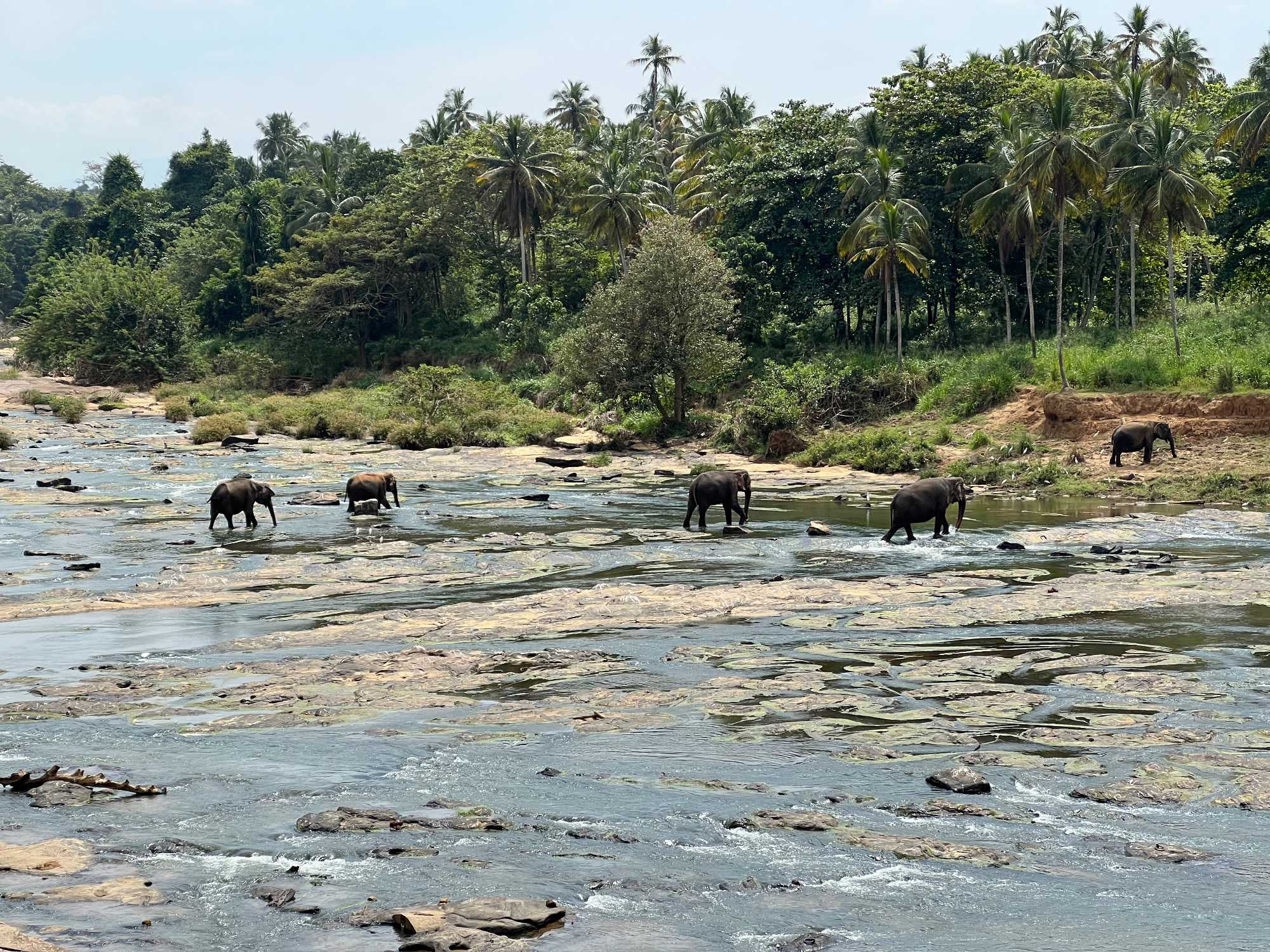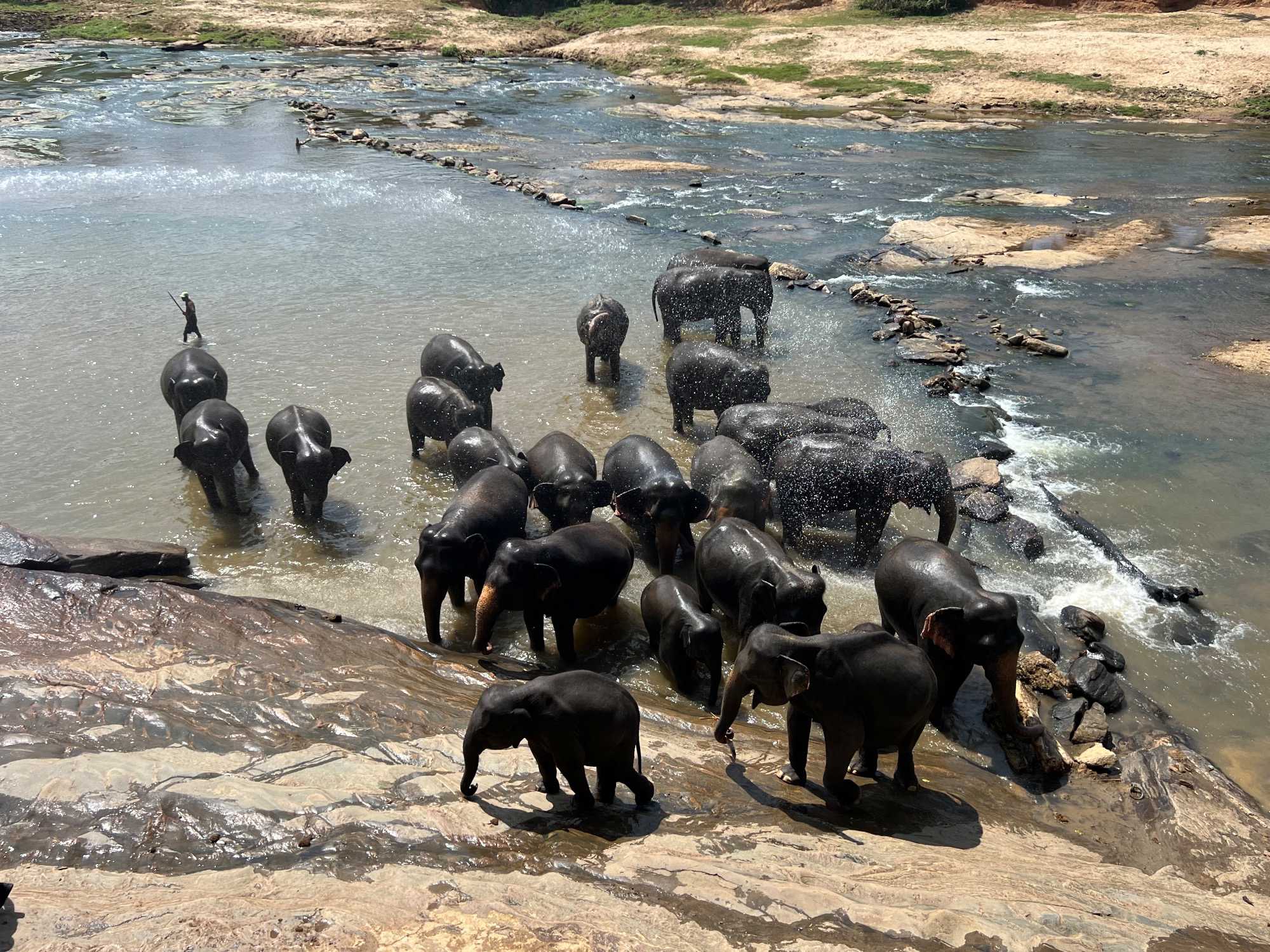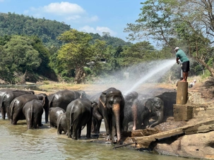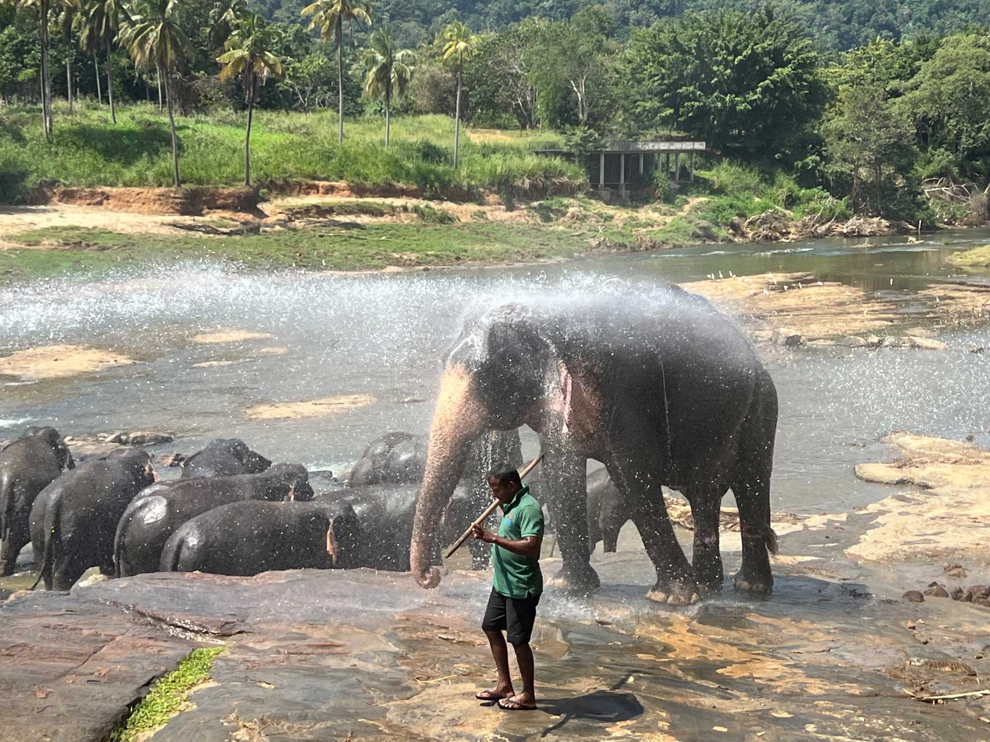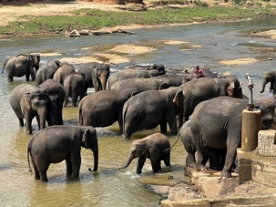 Après les avoir observé un bon moment, nous nous rendons au restaurant — et quel emplacement! Une terrasse surplombant la rivière, juste au-dessus de l’endroit où les éléphants se baignent. Pendant le repas, d’autres éléphants arrivent pour se baigner. Sous la supervision des cornacs, ces majestueux animaux se rafraîchissent longuement dans l’eau, ce qui est bien nécessaire avec la chaleur de l’après-midi (environ 33 degrés). Ils passent environ deux heures dans la rivière le matin et autant en après-midi.