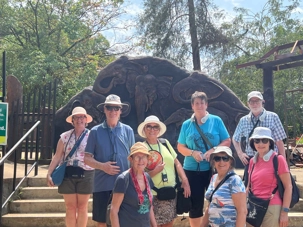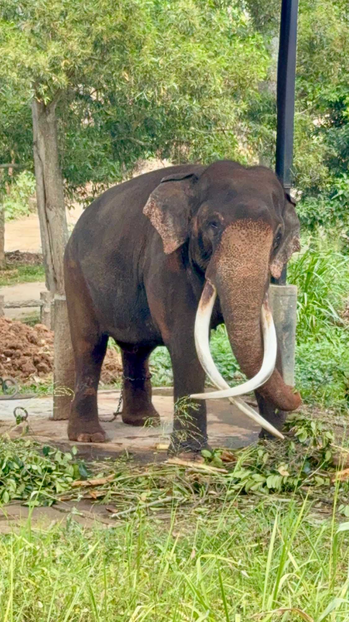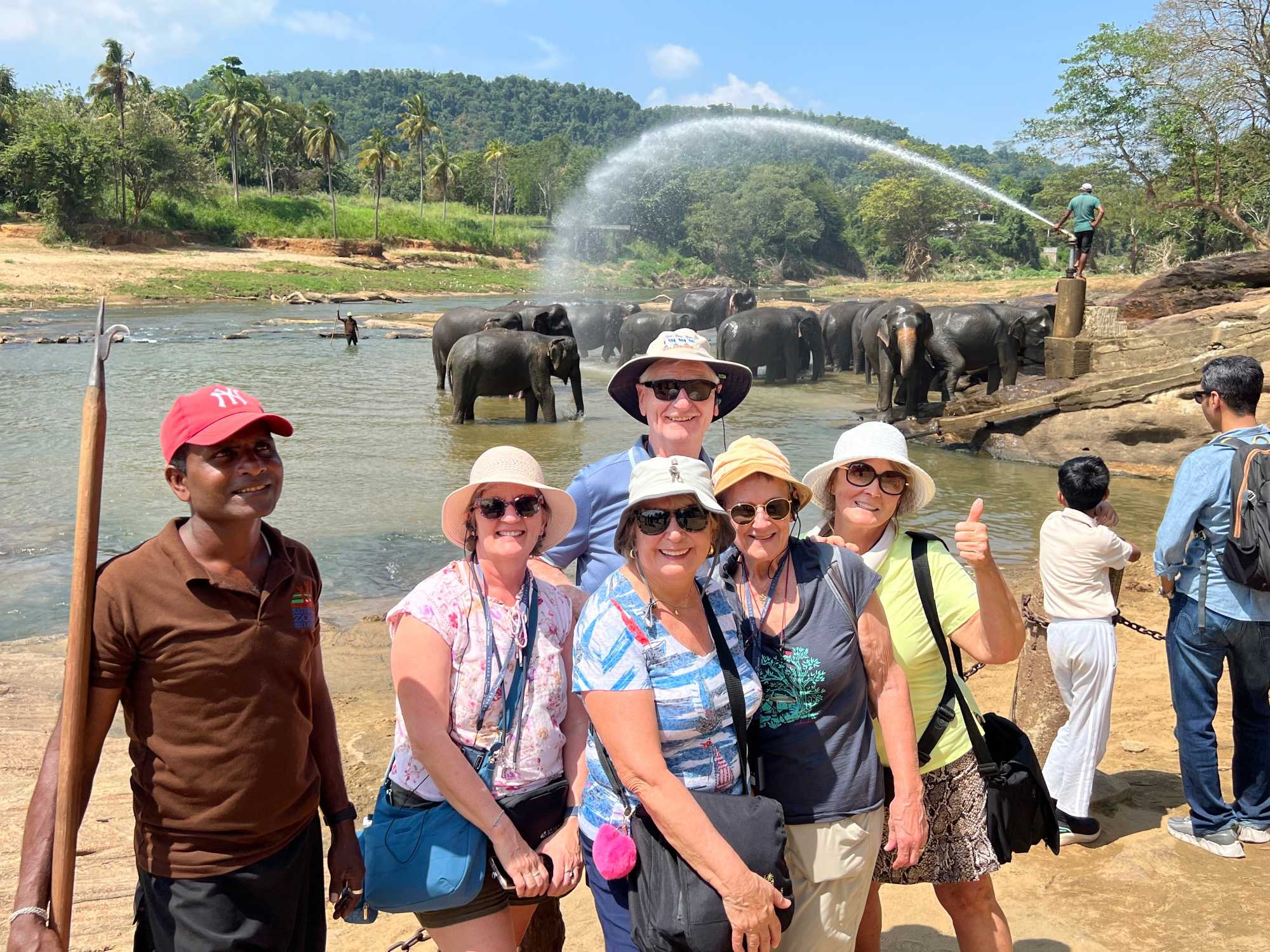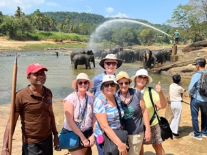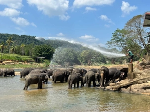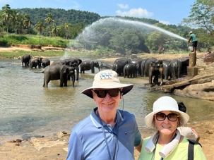 Après les avoir observé un bon moment, nous nous rendons au restaurant — et quel emplacement! Une terrasse surplombant la rivière, juste au-dessus de l’endroit où les éléphants se baignent. Pendant le repas, d’autres éléphants arrivent pour se baigner. Sous la supervision des cornacs, ces majestueux animaux se rafraîchissent longuement dans l’eau, ce qui est bien nécessaire avec la chaleur de l’après-midi (environ 33 degrés). Ils passent environ deux heures dans la rivière le matin et autant en après-midi.