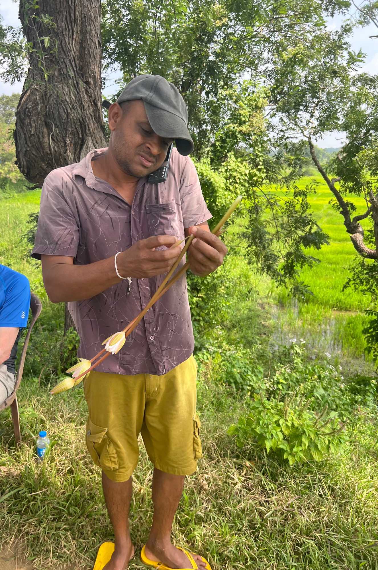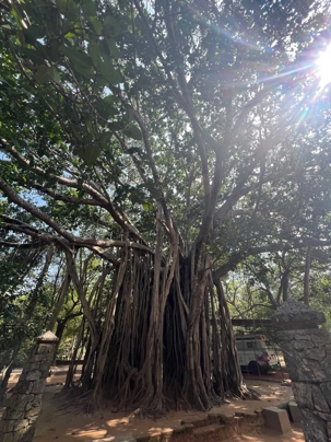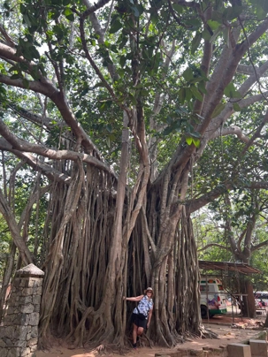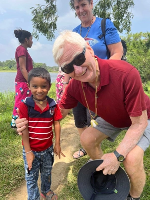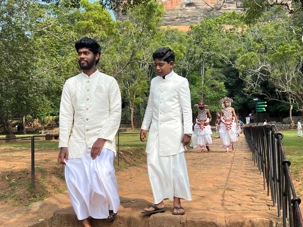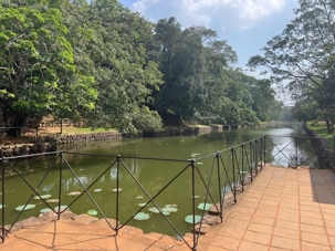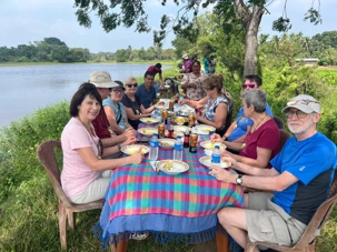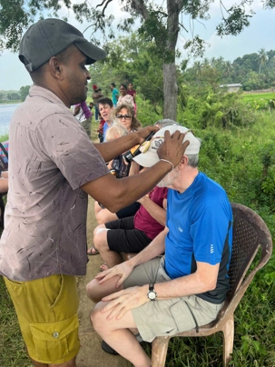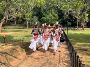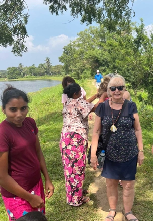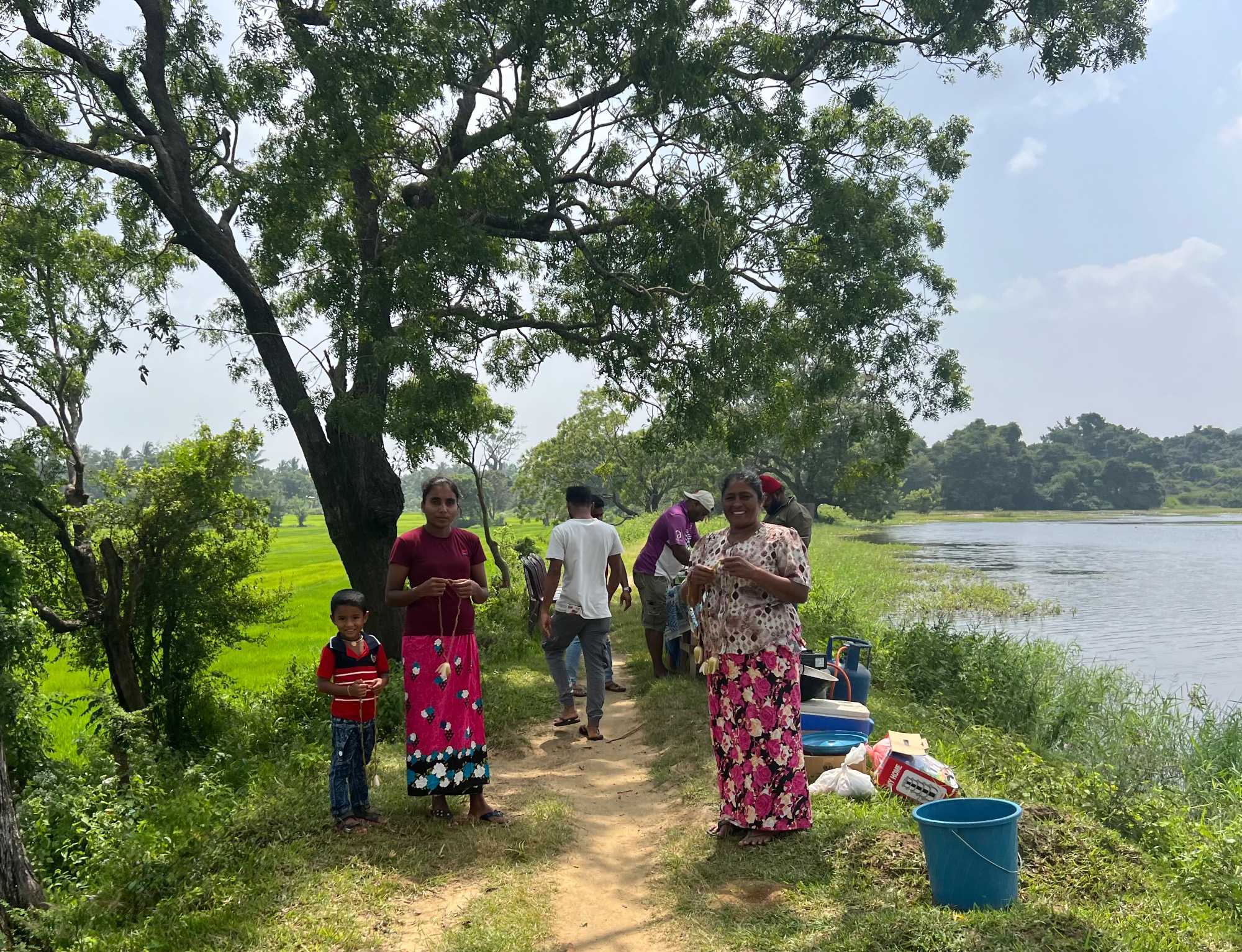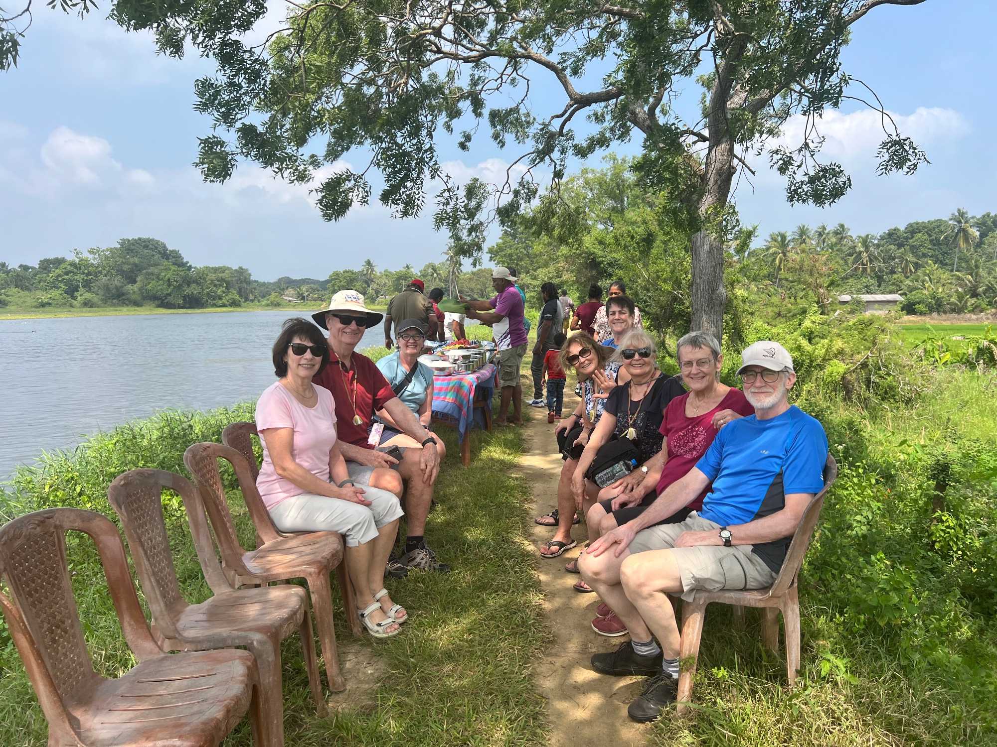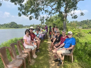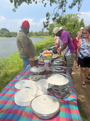 Pour nous, après cette matinée bien tranquille et sereine (nous sommes dans un endroit extraordinairement tranquille au milieu d’une végétation luxuriante), nous prenons la direction d’un lac pour un pique-nique pour le moins original. Nous descendons de l’autocar et empruntons un étroit sentier ressemblant à une digue d’environ trois mètres de large, longeant l’eau. Un peu plus loin, un petit groupe de Sri Lankais nous attend : des tables ont été dressées en plein milieu de cette digue pour nous accueillir. Chacun reçoit un collier de fleurs de nénuphar, un geste traditionnel d’hospitalité qui nous touche énormément. Installés à l’ombre des arbres, bercés par une douce brise, nous dégustons des plats typiquement sri-lankais, une expérience aussi délicieuse qu’authentique. L’accueil est sincère, les sourires vrais, et nous repartons le cœur rempli de gratitude. Cette rencontre avec les Sri Lankais nous ravi tous, ils sont si aimables et avenants. C’est déjà un gros coup de coeur pour tous!