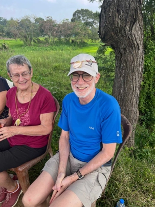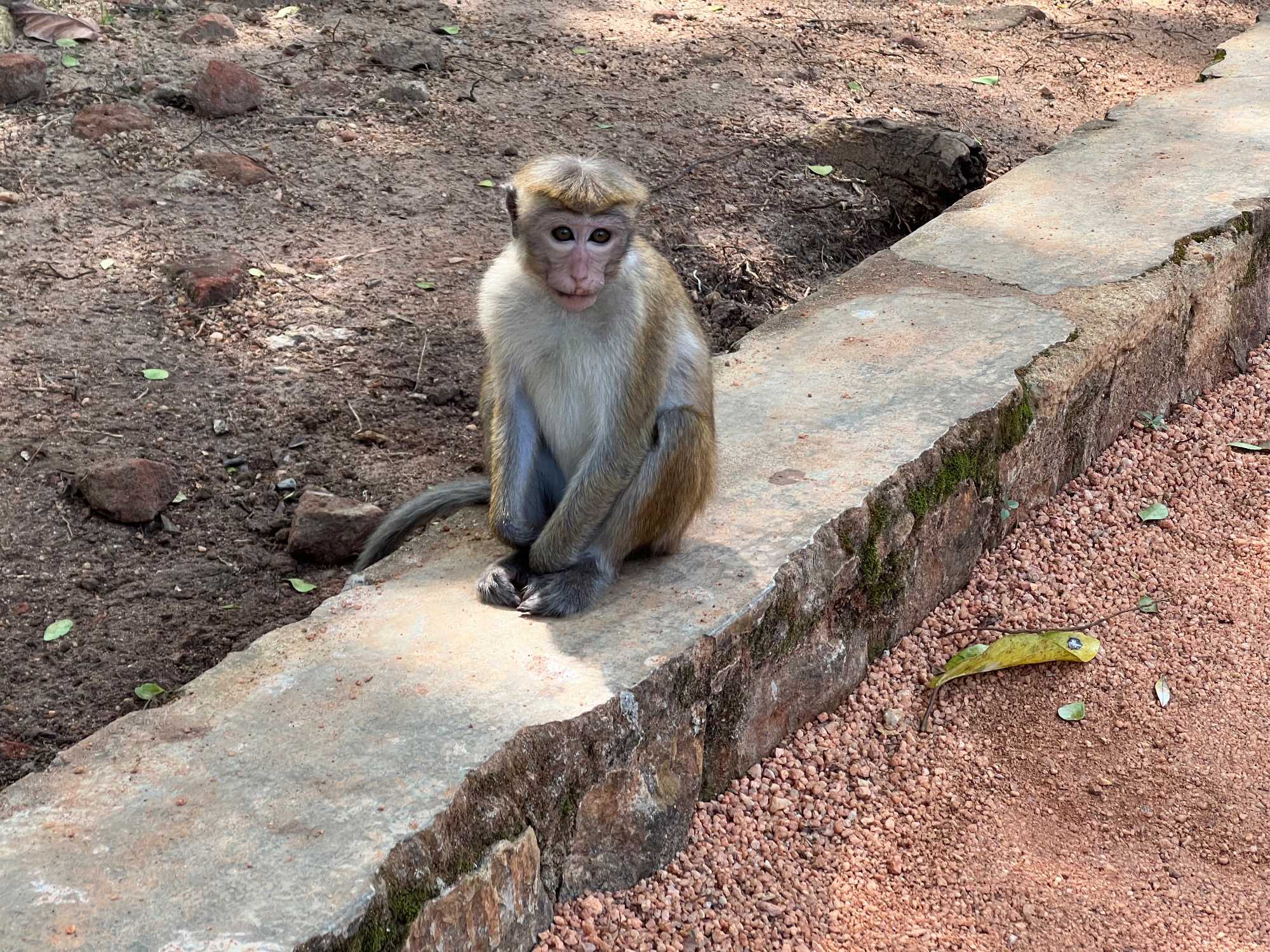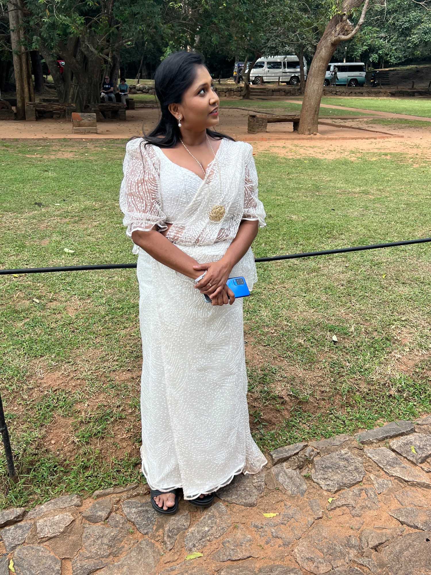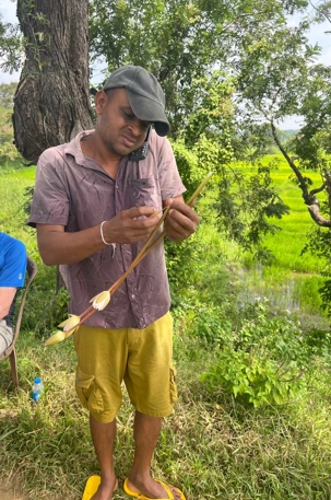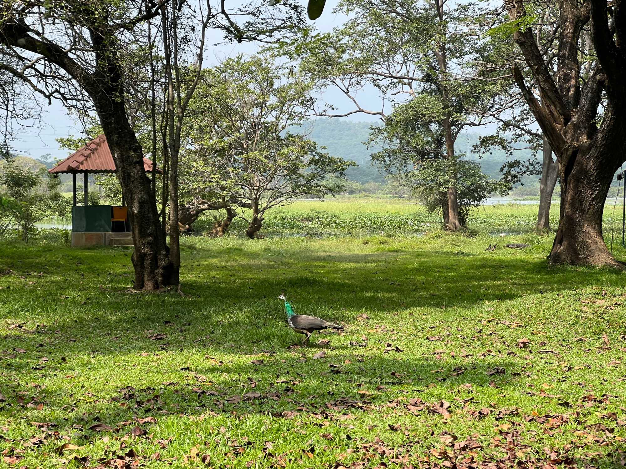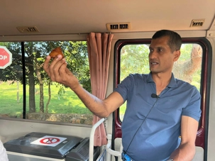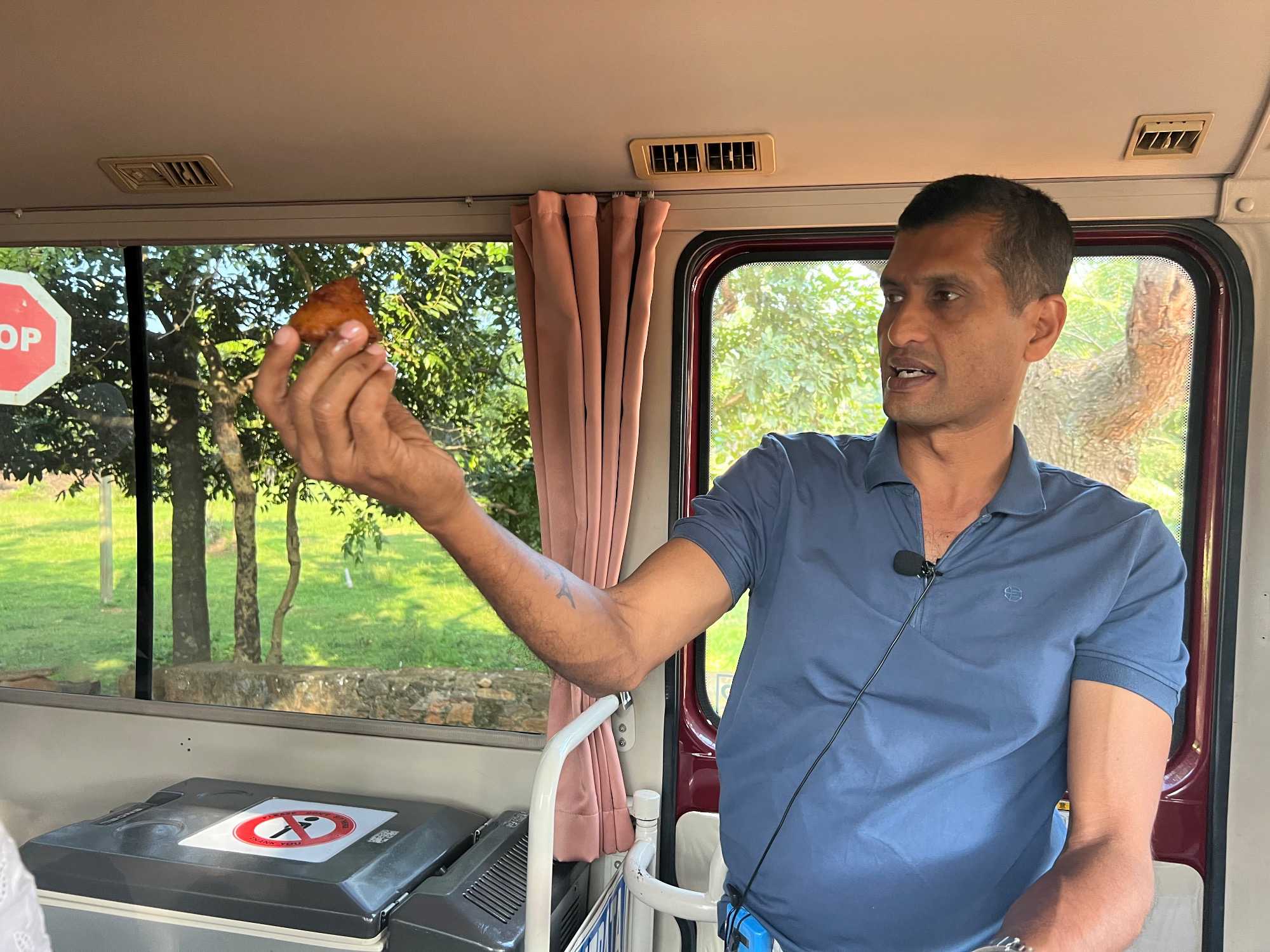 Pour nous, après cette matinée bien tranquille et sereine (nous sommes dans un endroit extraordinairement tranquille au milieu d’une végétation luxuriante), nous prenons la direction d’un lac pour un pique-nique pour le moins original. Nous descendons de l’autocar et empruntons un étroit sentier ressemblant à une digue d’environ trois mètres de large, longeant l’eau. Un peu plus loin, un petit groupe de Sri Lankais nous attend : des tables ont été dressées en plein milieu de cette digue pour nous accueillir. Chacun reçoit un collier de fleurs de nénuphar, un geste traditionnel d’hospitalité qui nous touche énormément. Installés à l’ombre des arbres, bercés par une douce brise, nous dégustons des plats typiquement sri-lankais, une expérience aussi délicieuse qu’authentique. L’accueil est sincère, les sourires vrais, et nous repartons le cœur rempli de gratitude. Cette rencontre avec les Sri Lankais nous ravi tous, ils sont si aimables et avenants. C’est déjà un gros coup de coeur pour tous!