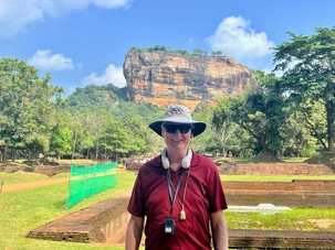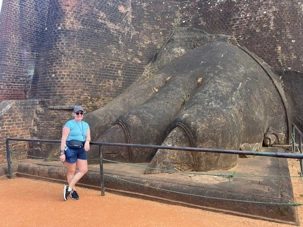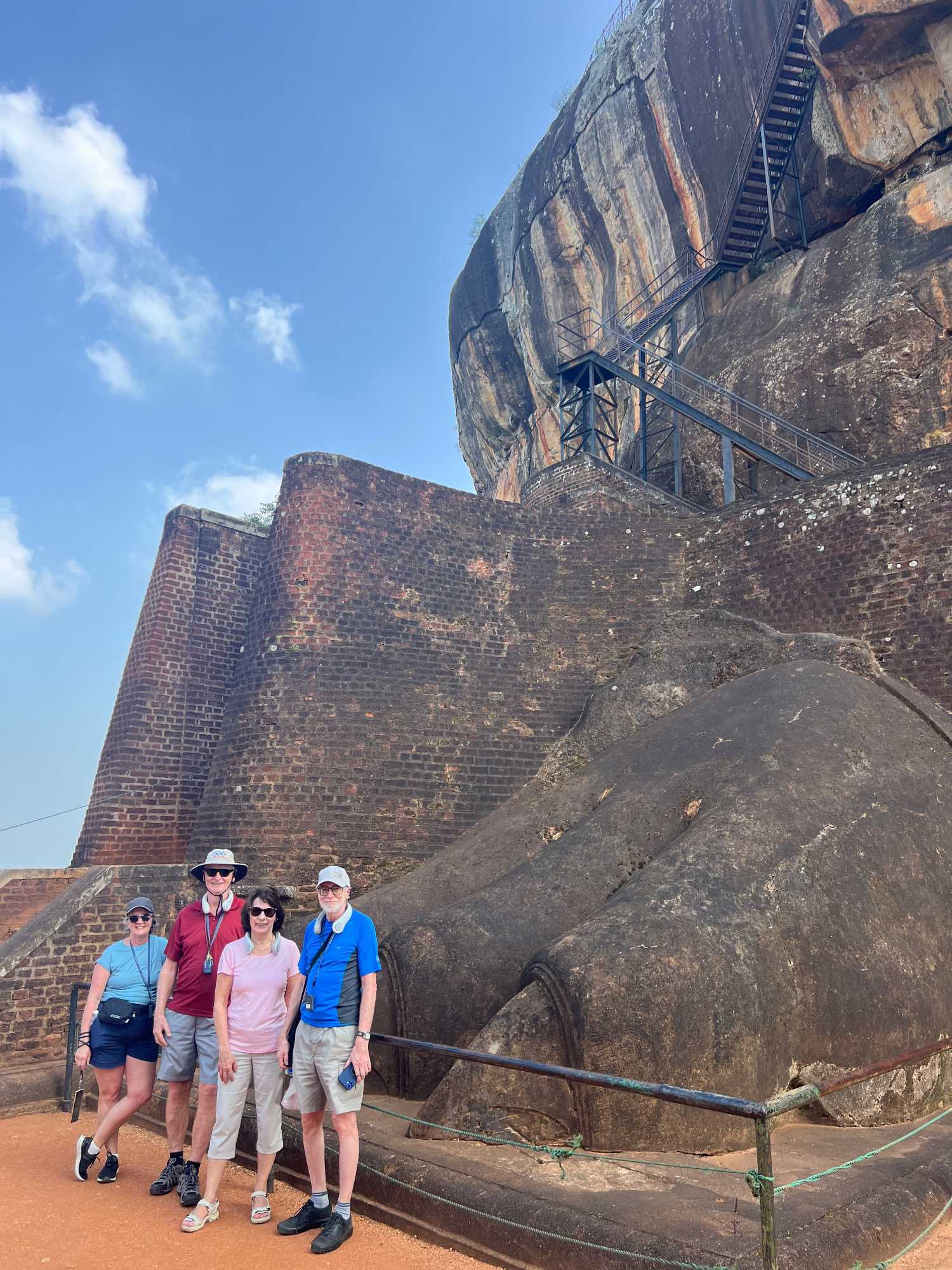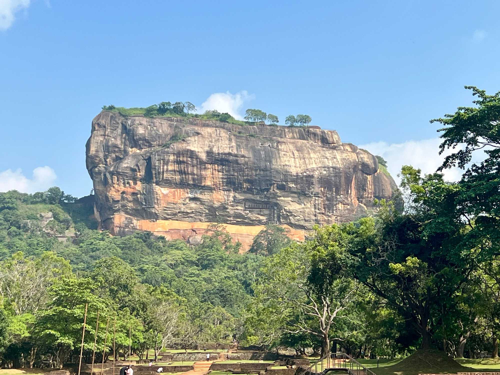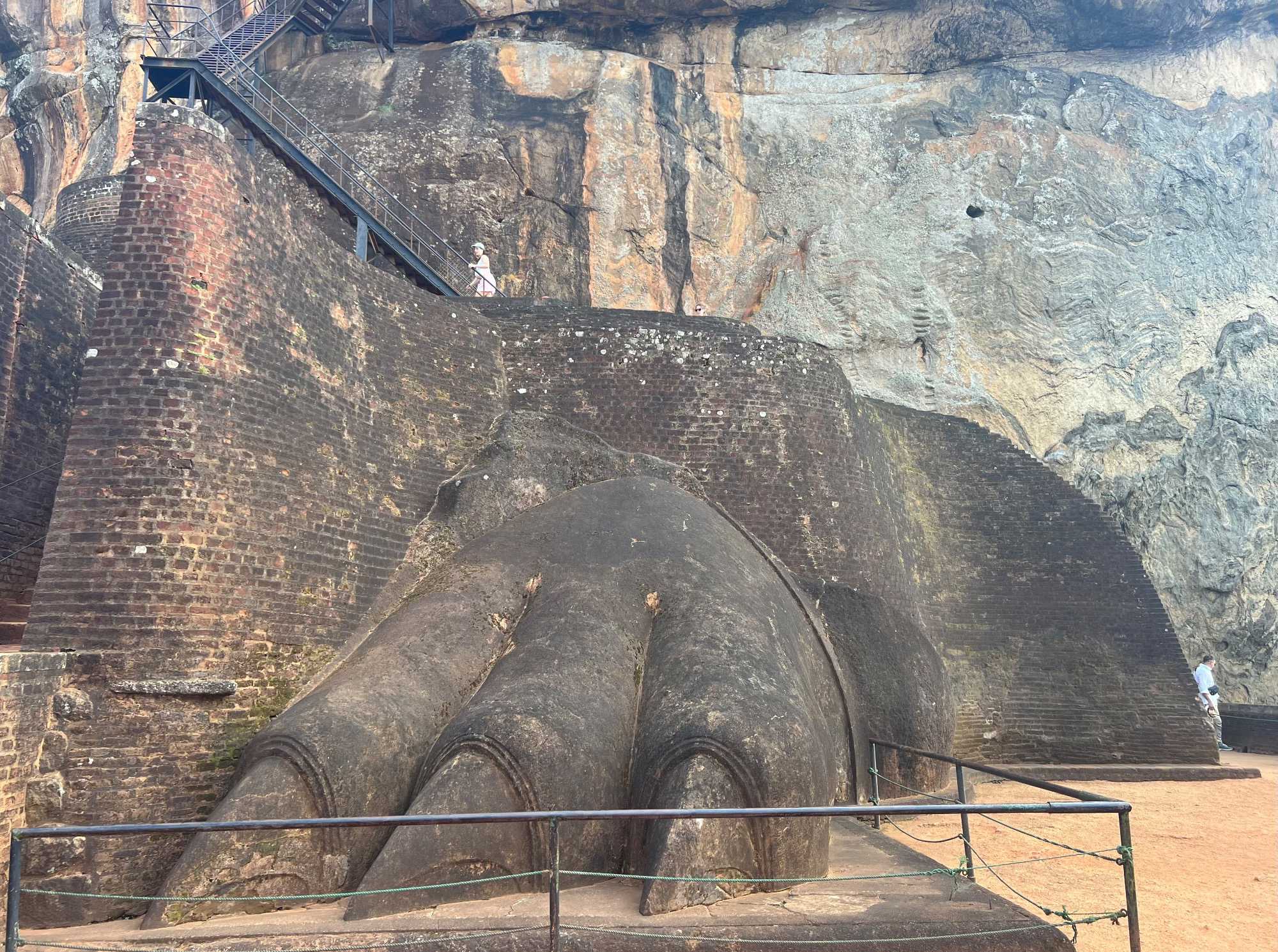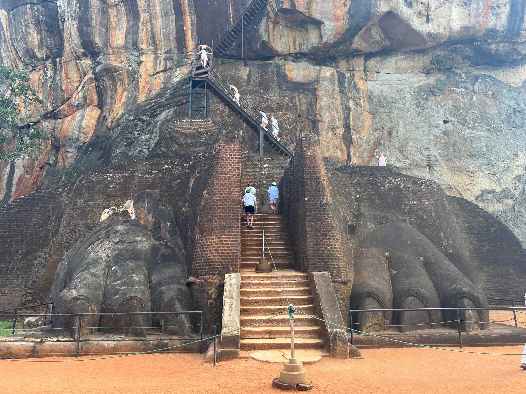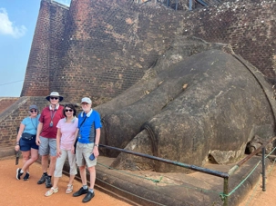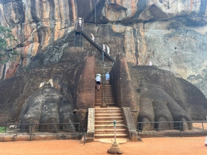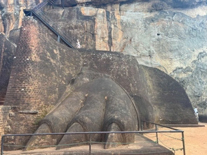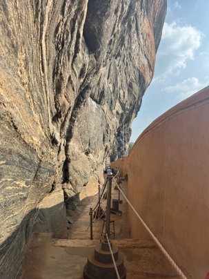 À notre arrivée, nous traversons les vastes jardins aménagés au pied du rocher. Jaya nous partage une foule d’informations fascinantes sur l’histoire et la symbolique du lieu, puis l’ascension débute. Le rocher s’élève à près de 200 mètres, et la montée se fait tranquillement, un pas à la fois. Tous les voyageurs atteignent la deuxième terrasse sans trop de difficulté. Par la suite, une série d’escaliers, de passages creusés dans la roche et de passerelles modernes nous mène à la terrasse du Lion, point de départ de la dernière portion menant aux vestiges du palais du roi Kassapa. De là, un escalier métallique permet d’atteindre le sommet — la section la plus exigeante, surtout pour ceux qui ont le vertige.