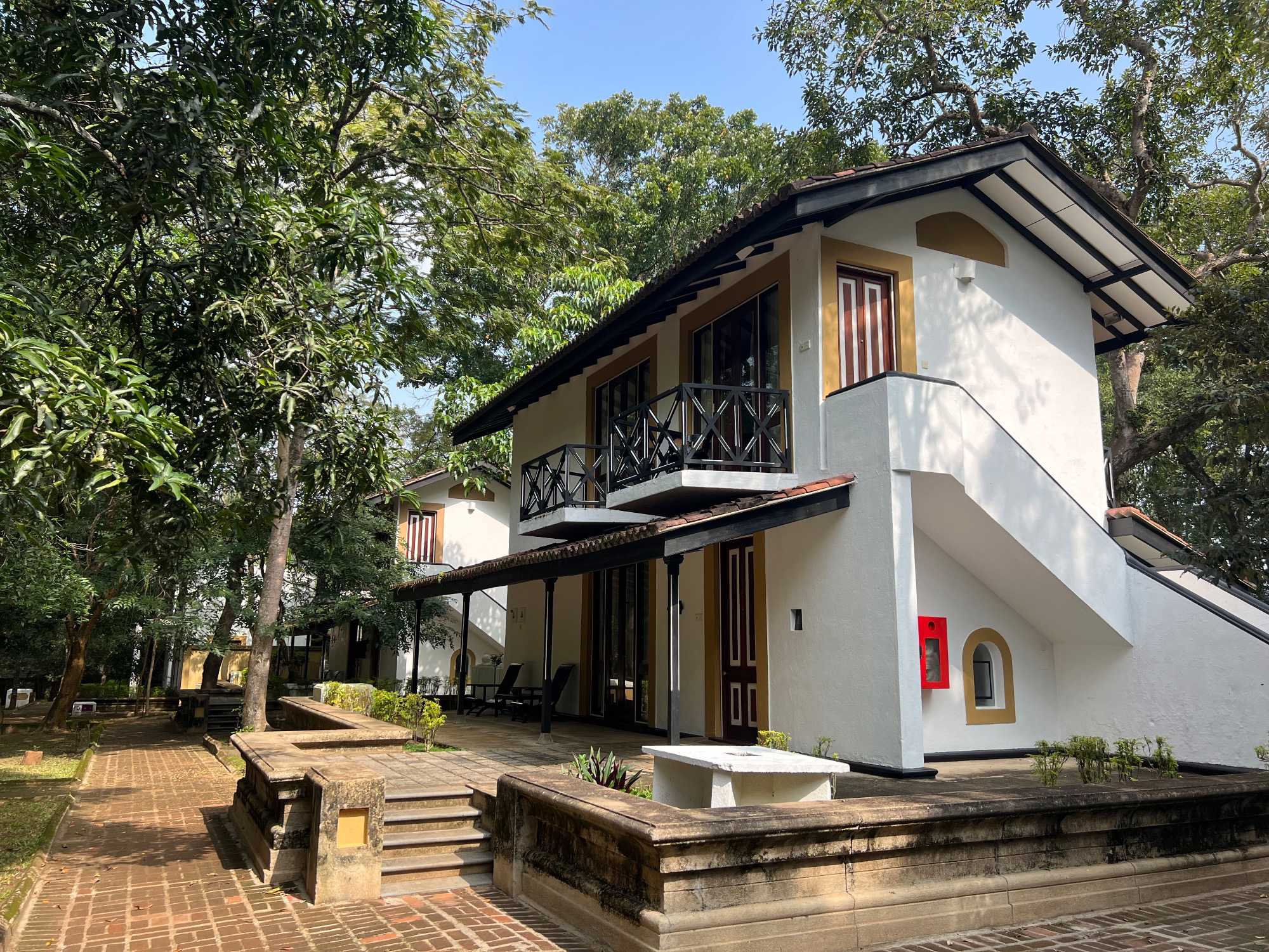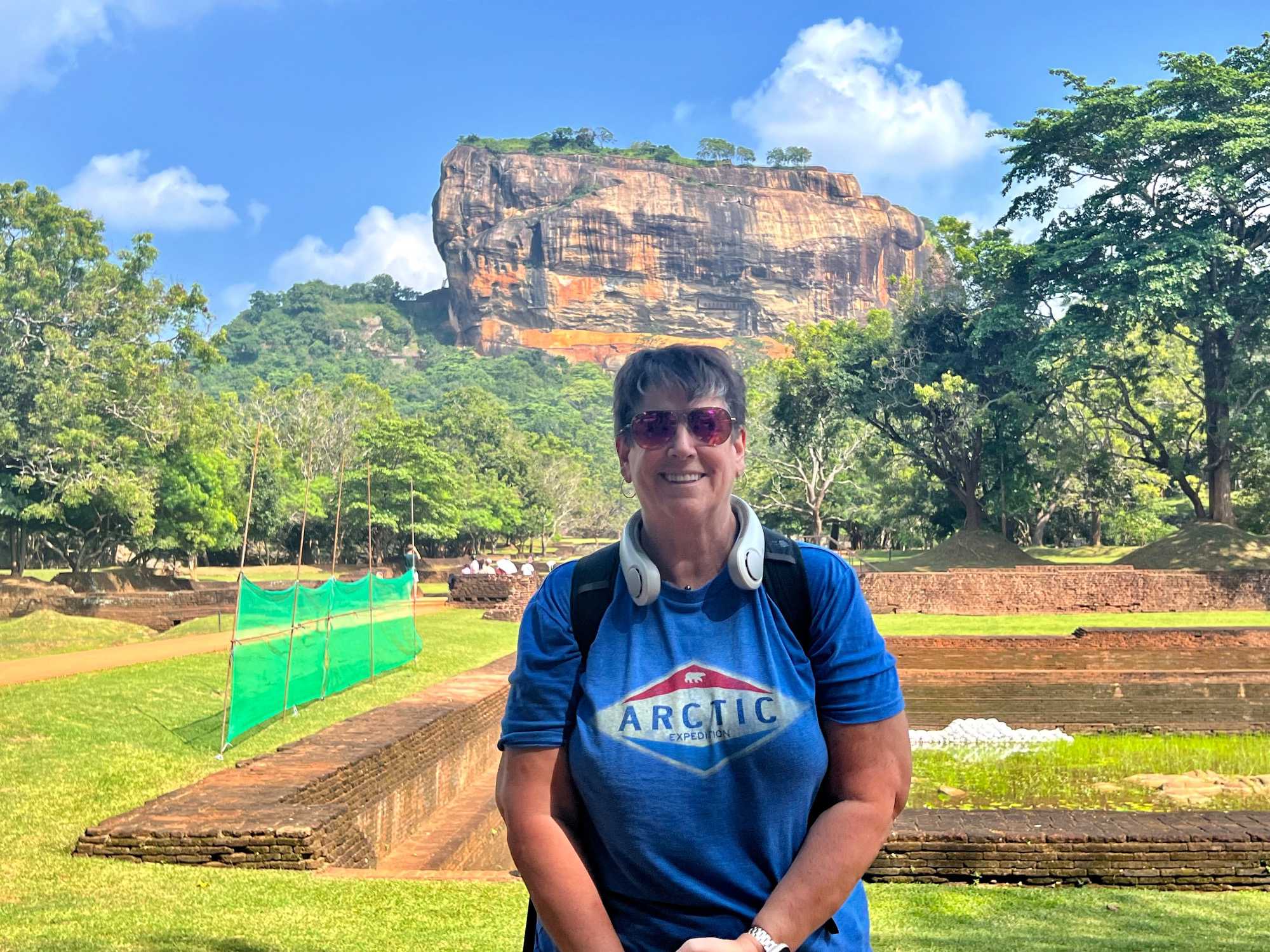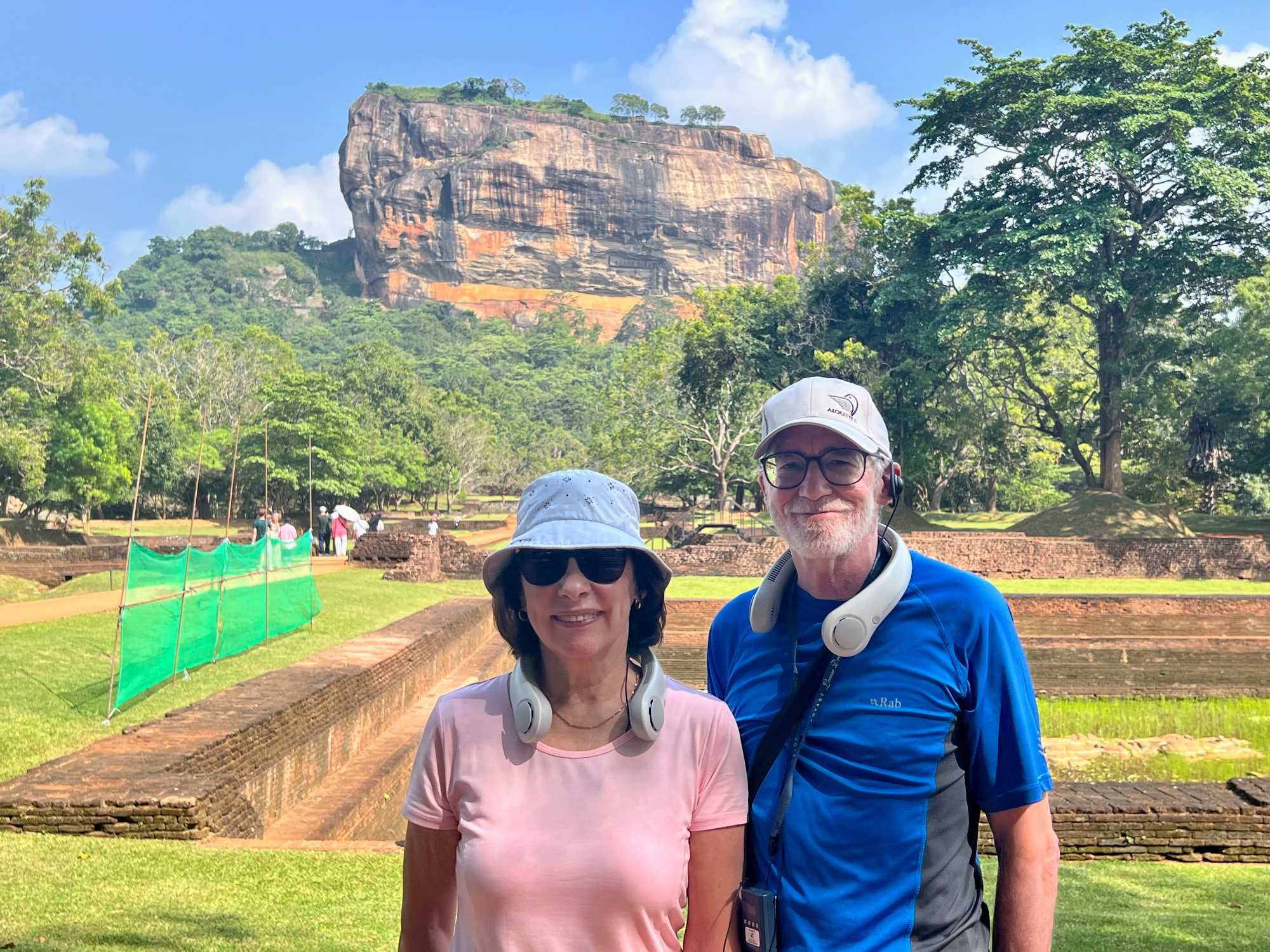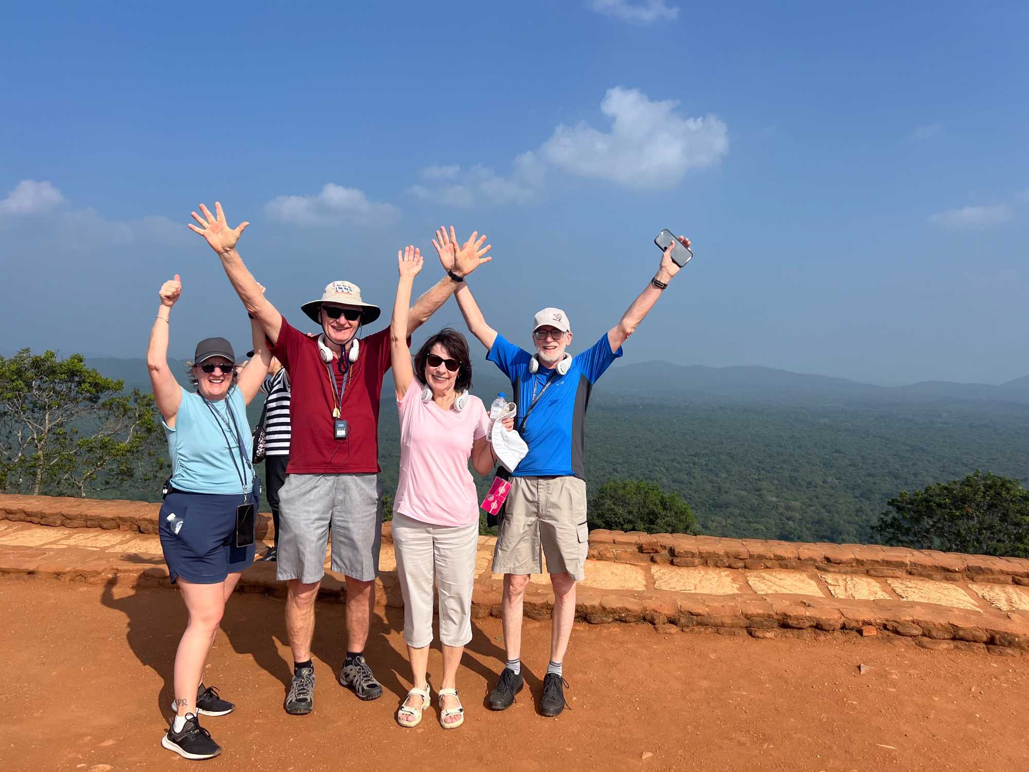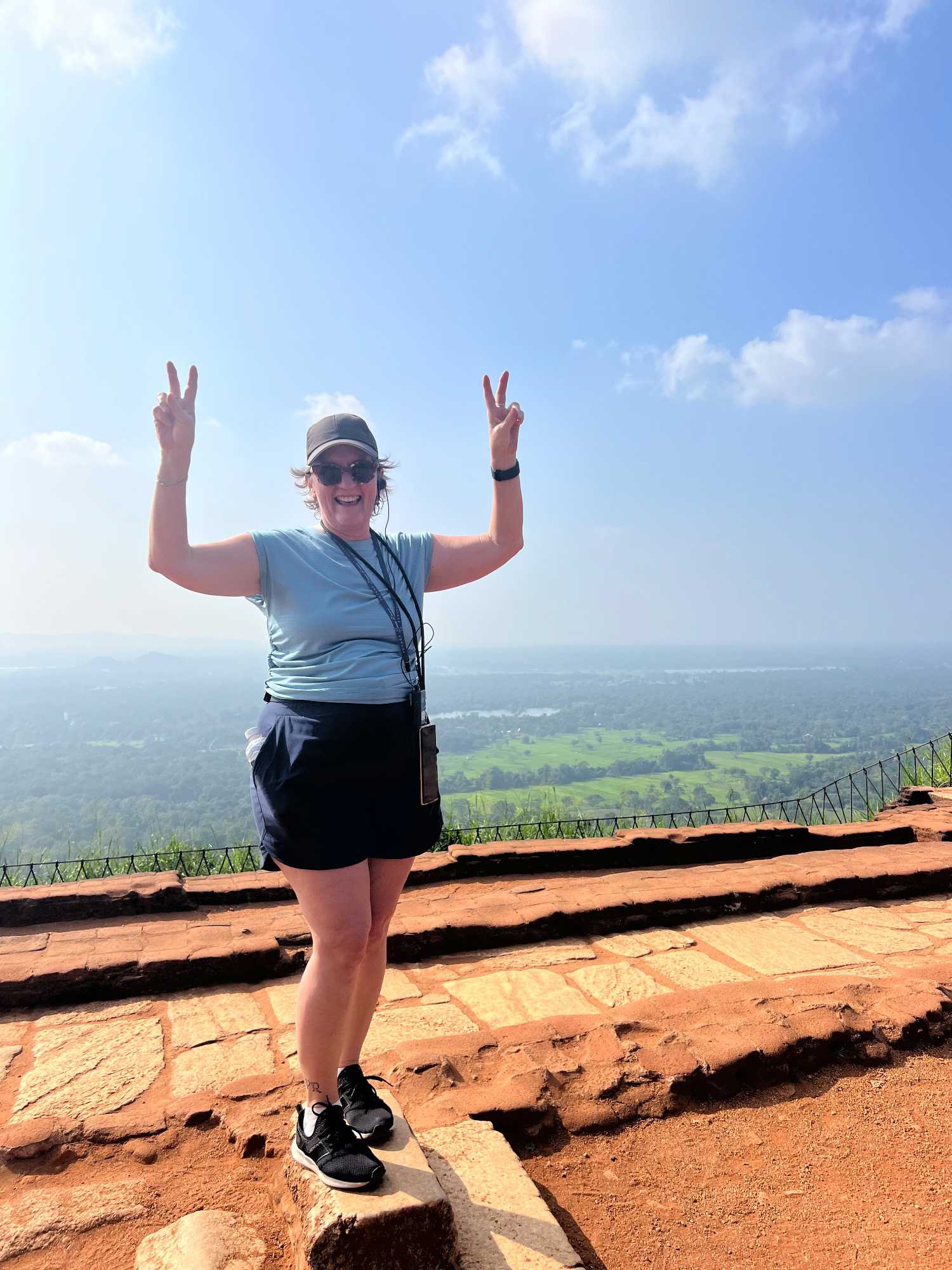 À notre arrivée, nous traversons les vastes jardins aménagés au pied du rocher. Jaya nous partage une foule d’informations fascinantes sur l’histoire et la symbolique du lieu, puis l’ascension débute. Le rocher s’élève à près de 200 mètres, et la montée se fait tranquillement, un pas à la fois. Tous les voyageurs atteignent la deuxième terrasse sans trop de difficulté. Par la suite, une série d’escaliers, de passages creusés dans la roche et de passerelles modernes nous mène à la terrasse du Lion, point de départ de la dernière portion menant aux vestiges du palais du roi Kassapa. De là, un escalier métallique permet d’atteindre le sommet — la section la plus exigeante, surtout pour ceux qui ont le vertige.