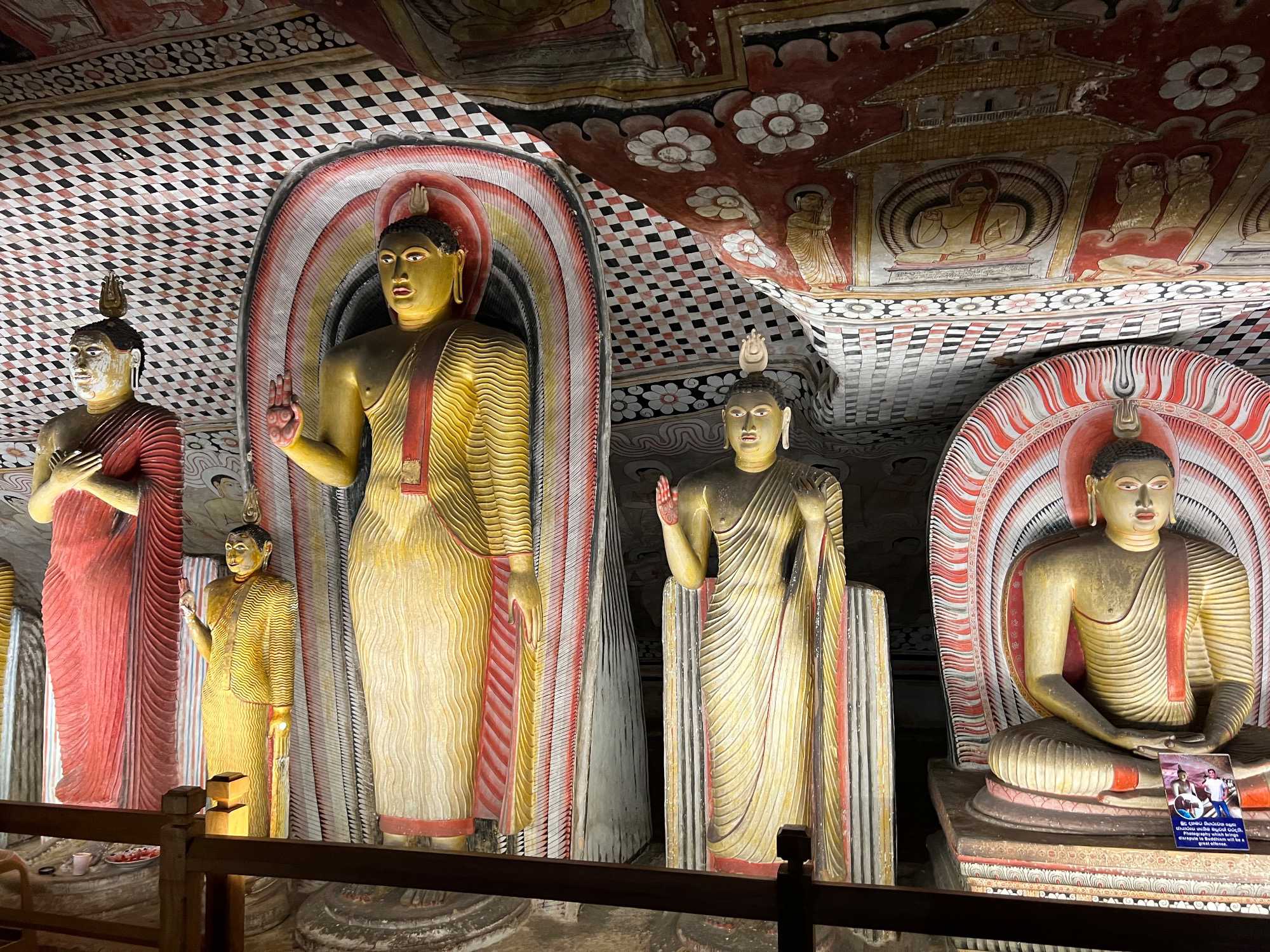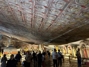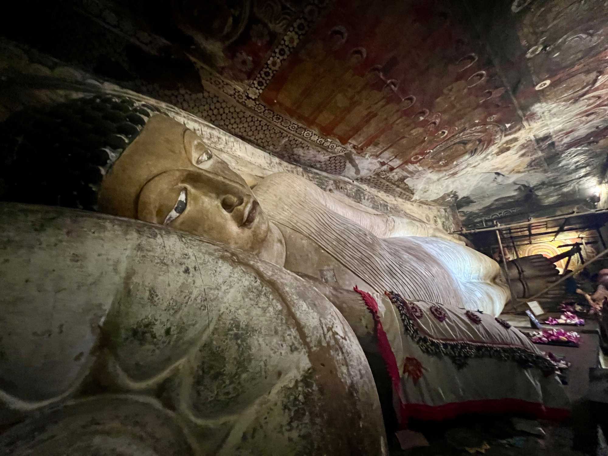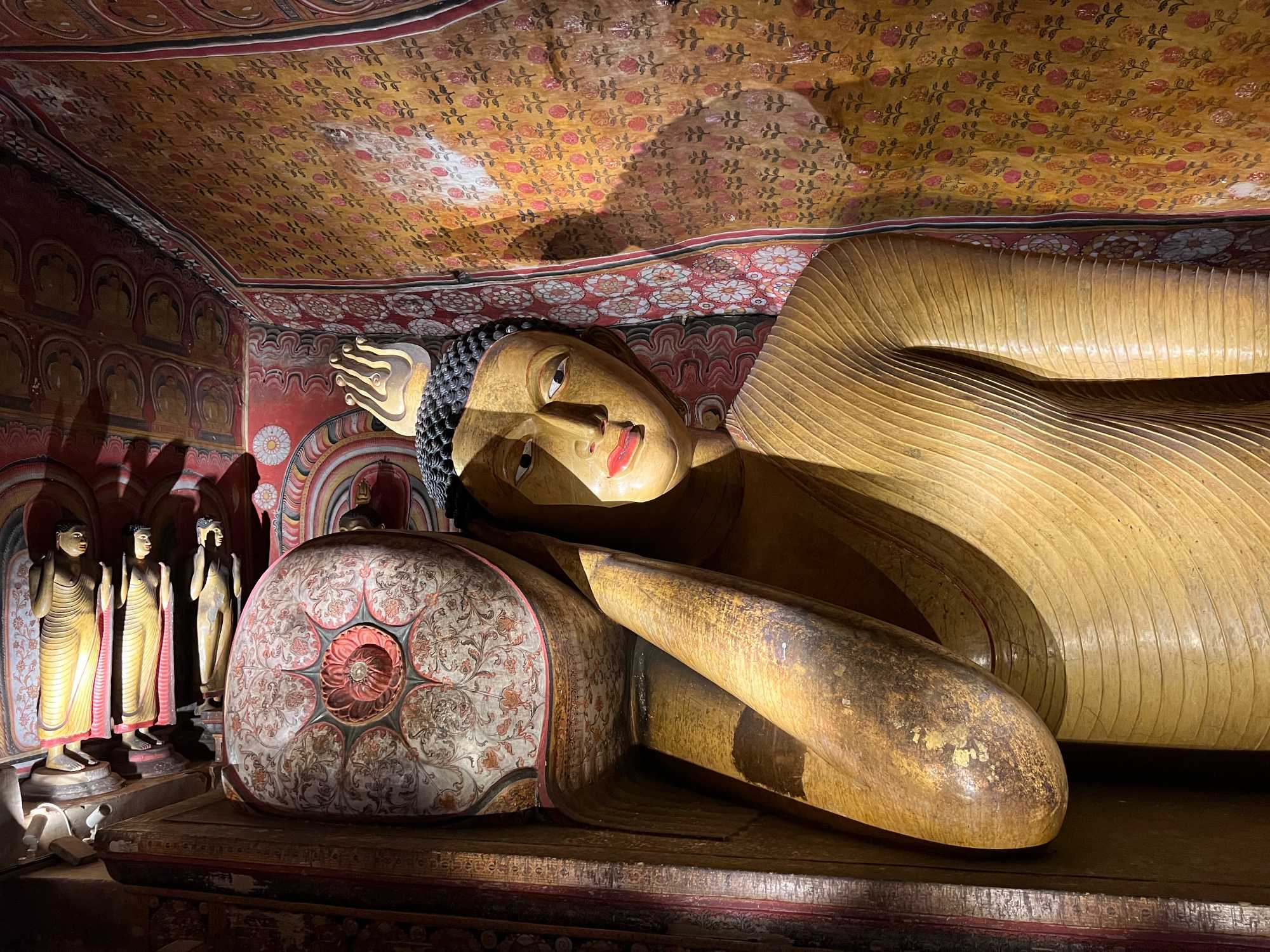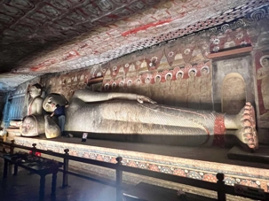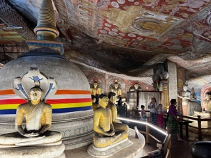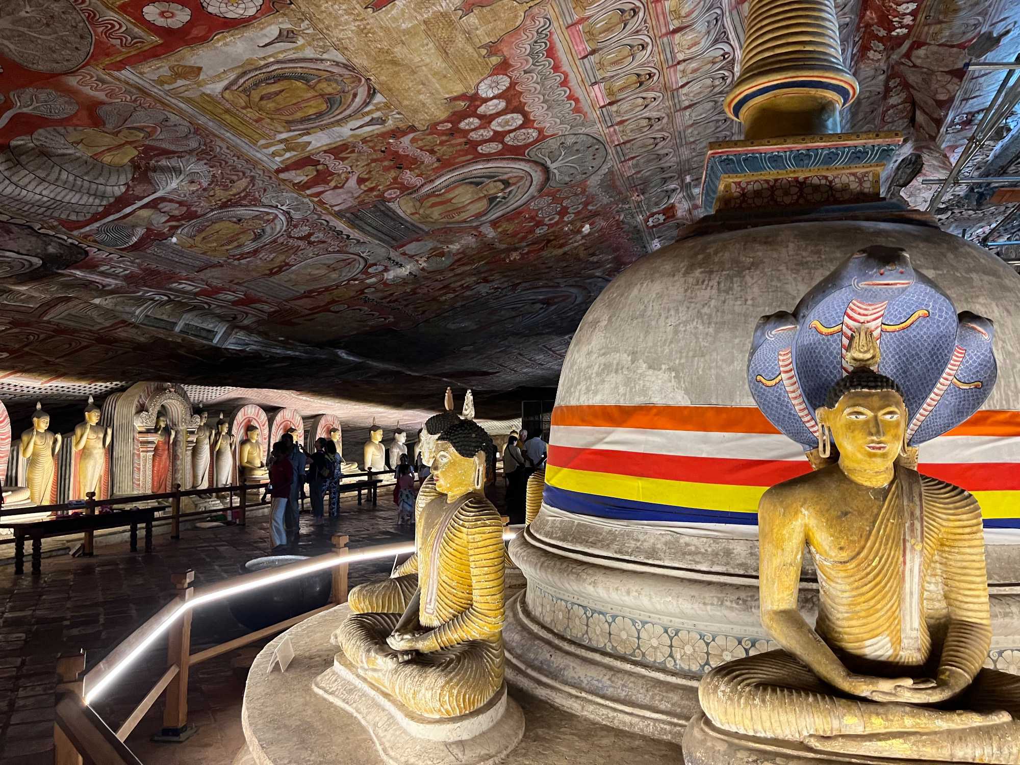 Nous prenons la route en direction de Dambulla, pour visiter le Temple d’Or, l’un des sites les plus remarquables de l’histoire bouddhiste du pays. Édifié au Ier siècle avant J.-C., ce sanctuaire, également appelé Temple des Grottes, nous impressionne par sa beauté et son atmosphère paisible. Nous débutons par la visite de l’immense bouddha et son stupa couleur or, en bas de la montagne. Nous reprenons le bus puis nous prenons un sentier qui monte jusqu’au sanctuaire. Nous pénétrons dans les cinq grottes sacrées, chacune richement décorée de statues et de fresques aux couleurs éclatantes, racontant des récits sacrés et millénaires. La statue de Bouddha couché de 14 mètres de long, installée dans l’une des grottes, est particulièrement saisissante. Les peintures murales, couvrant plus de 2 100 mètres carrés, figurent parmi les plus vastes ensembles de fresques bouddhiques au monde et retracent la vie du Bouddha avec une grande finesse.