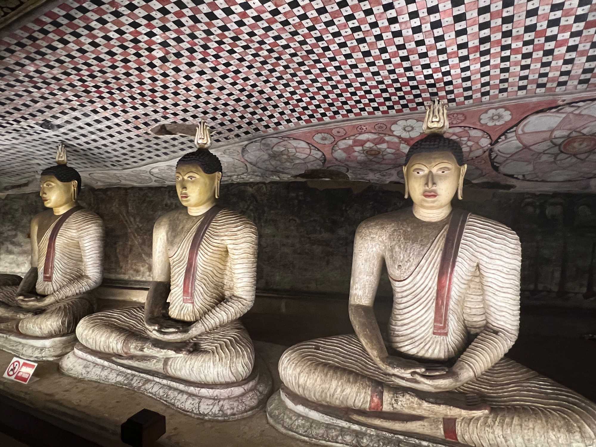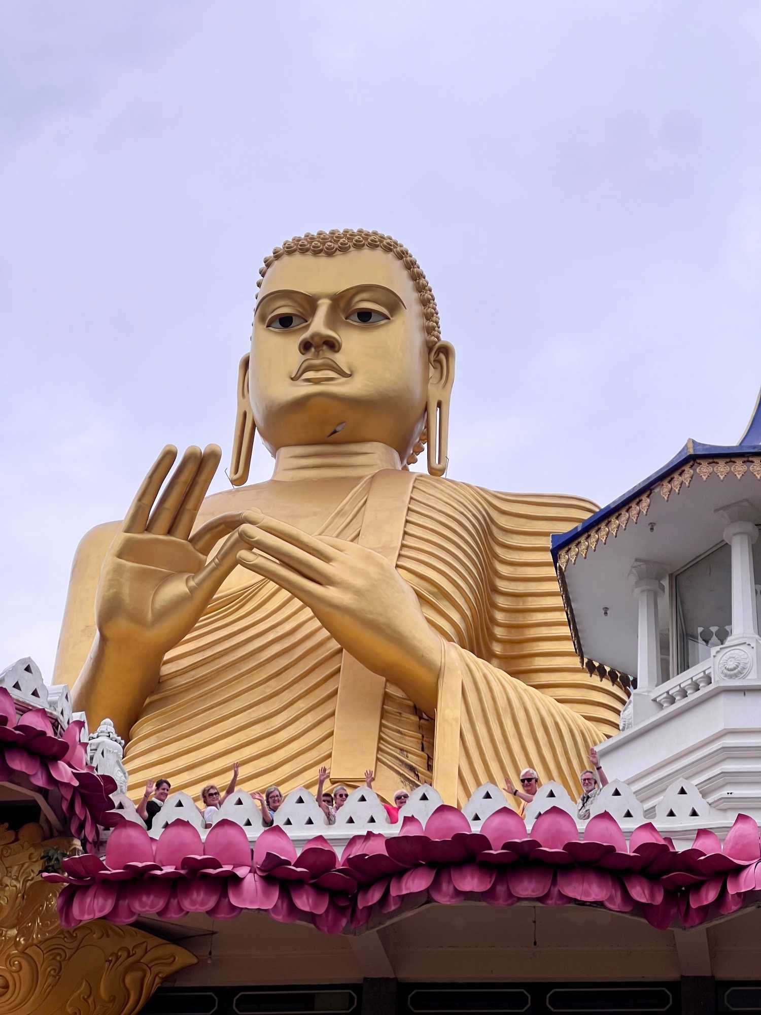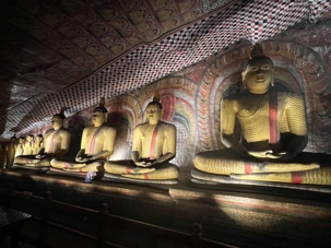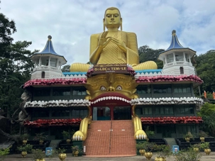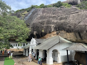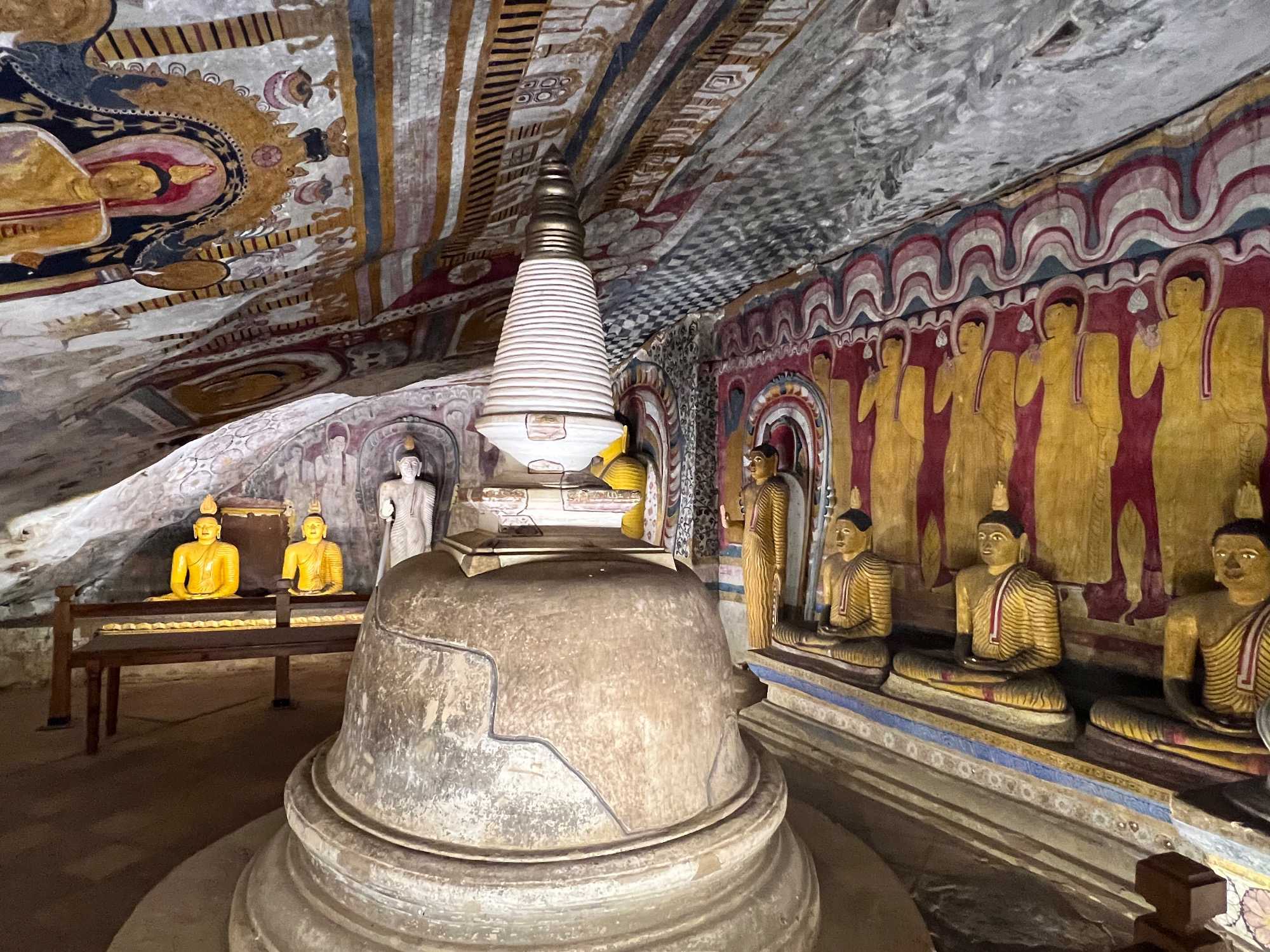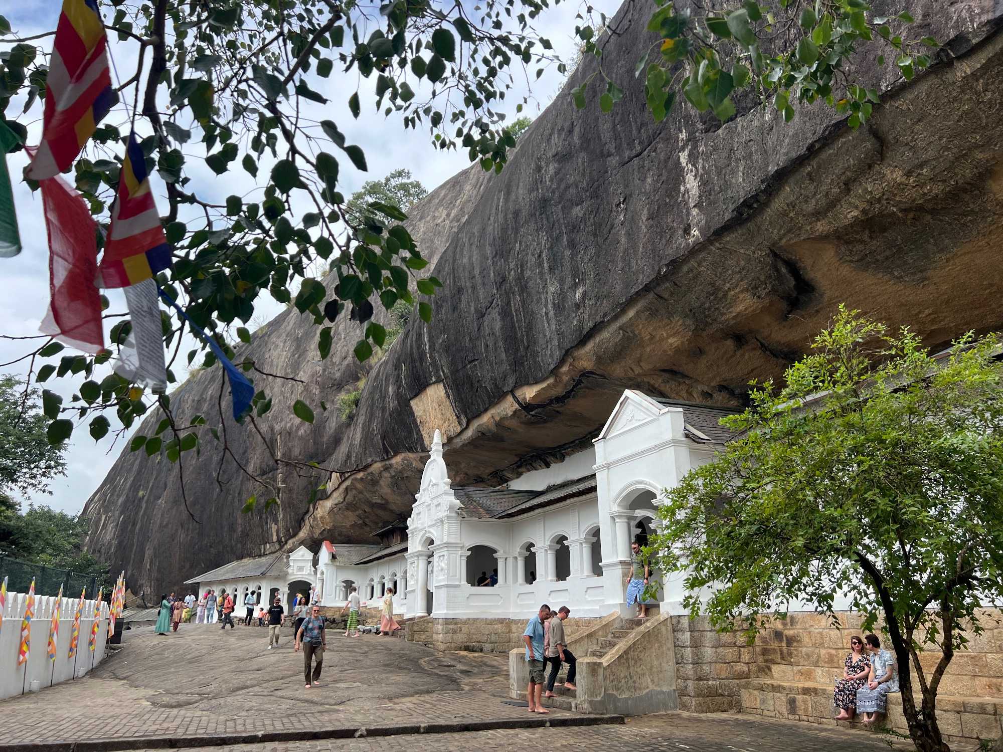 Nous prenons la route en direction de Dambulla, pour visiter le Temple d’Or, l’un des sites les plus remarquables de l’histoire bouddhiste du pays. Édifié au Ier siècle avant J.-C., ce sanctuaire, également appelé Temple des Grottes, nous impressionne par sa beauté et son atmosphère paisible. Nous débutons par la visite de l’immense bouddha et son stupa couleur or, en bas de la montagne. Nous reprenons le bus puis nous prenons un sentier qui monte jusqu’au sanctuaire. Nous pénétrons dans les cinq grottes sacrées, chacune richement décorée de statues et de fresques aux couleurs éclatantes, racontant des récits sacrés et millénaires. La statue de Bouddha couché de 14 mètres de long, installée dans l’une des grottes, est particulièrement saisissante. Les peintures murales, couvrant plus de 2 100 mètres carrés, figurent parmi les plus vastes ensembles de fresques bouddhiques au monde et retracent la vie du Bouddha avec une grande finesse.