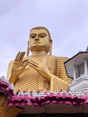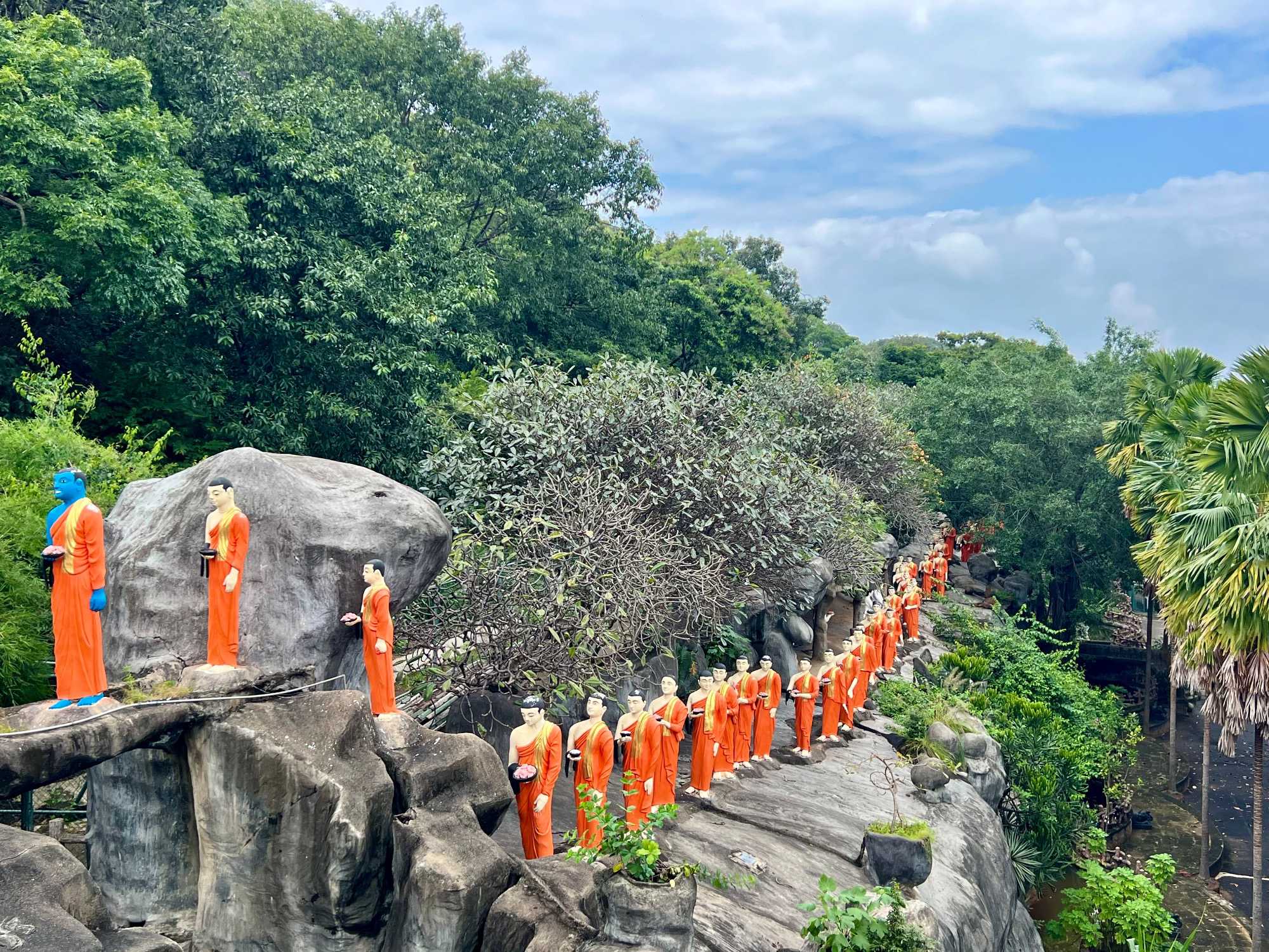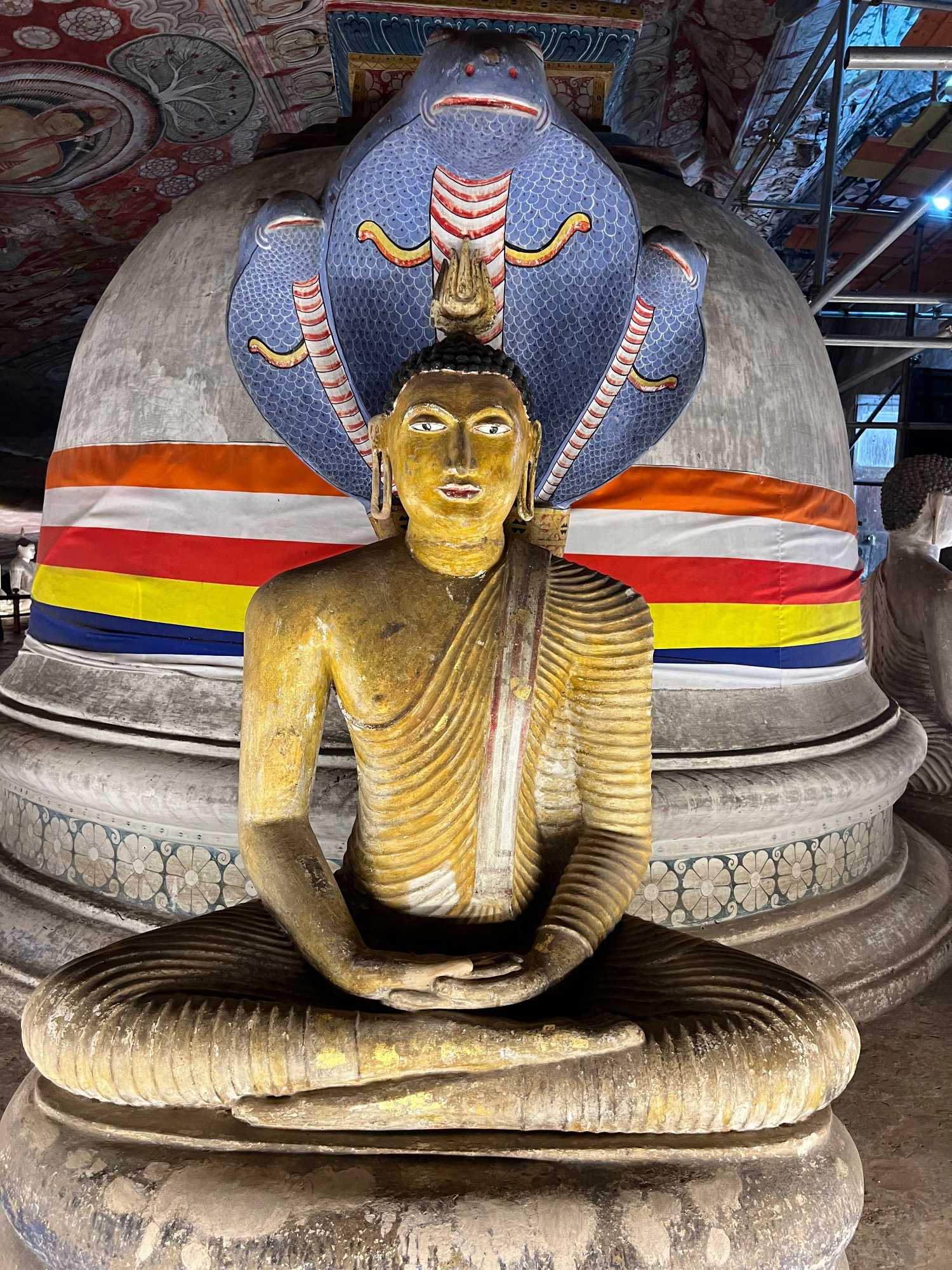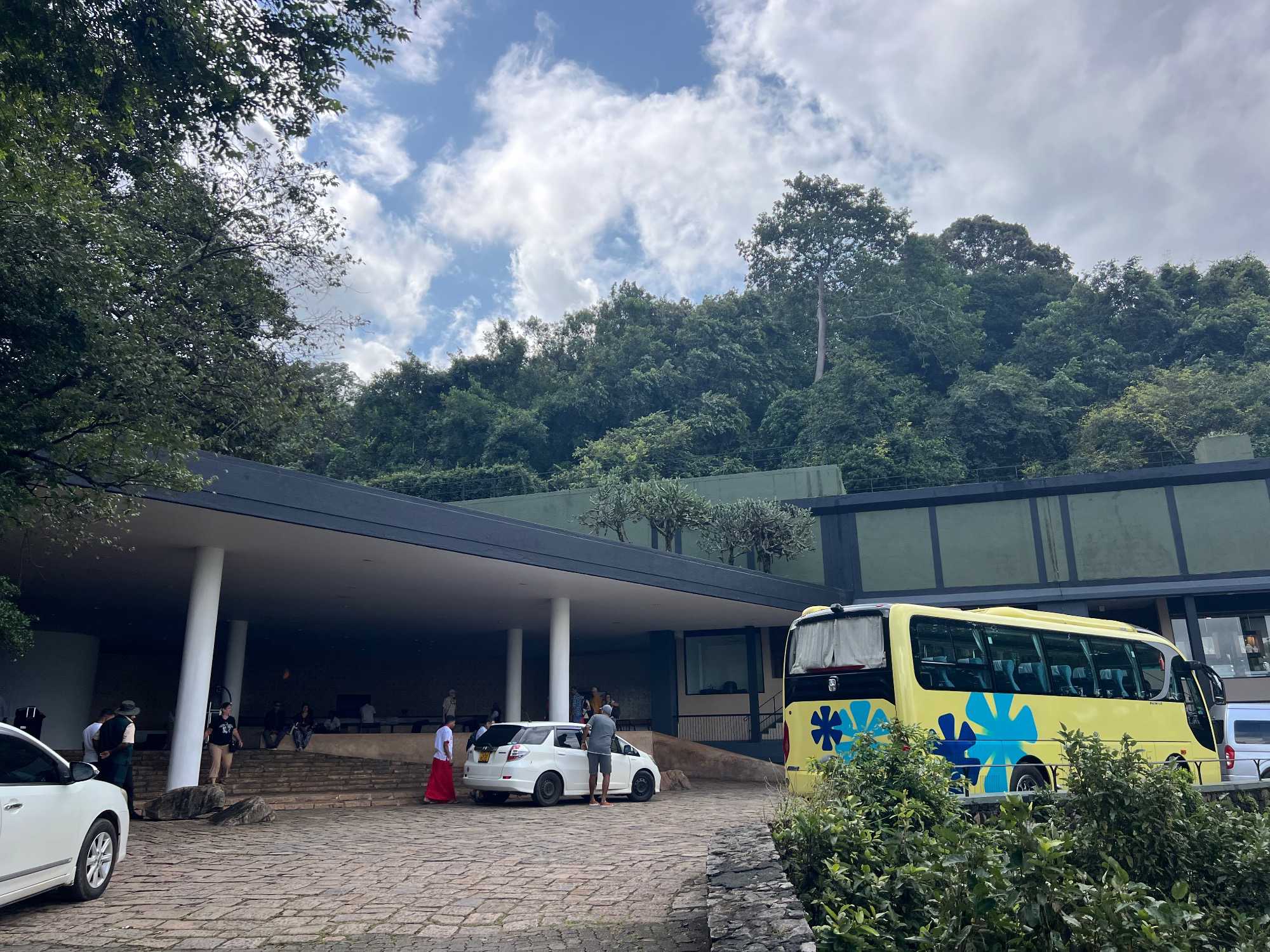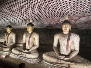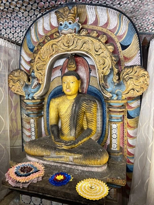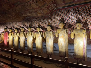 Nous prenons la route en direction de Dambulla, pour visiter le Temple d’Or, l’un des sites les plus remarquables de l’histoire bouddhiste du pays. Édifié au Ier siècle avant J.-C., ce sanctuaire, également appelé Temple des Grottes, nous impressionne par sa beauté et son atmosphère paisible. Nous débutons par la visite de l’immense bouddha et son stupa couleur or, en bas de la montagne. Nous reprenons le bus puis nous prenons un sentier qui monte jusqu’au sanctuaire. Nous pénétrons dans les cinq grottes sacrées, chacune richement décorée de statues et de fresques aux couleurs éclatantes, racontant des récits sacrés et millénaires. La statue de Bouddha couché de 14 mètres de long, installée dans l’une des grottes, est particulièrement saisissante. Les peintures murales, couvrant plus de 2 100 mètres carrés, figurent parmi les plus vastes ensembles de fresques bouddhiques au monde et retracent la vie du Bouddha avec une grande finesse.