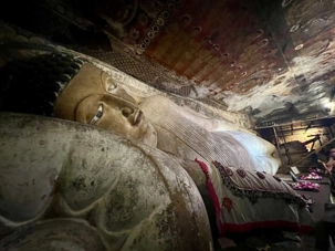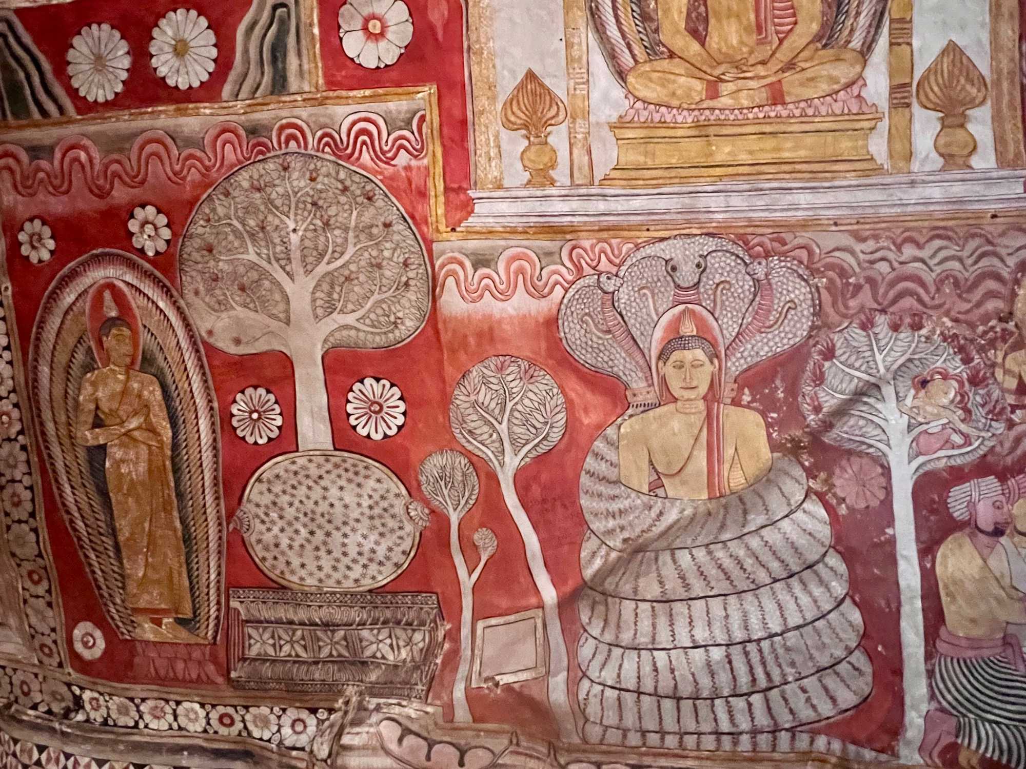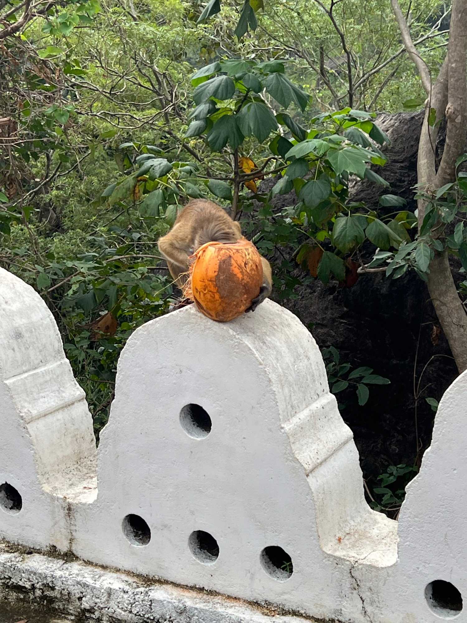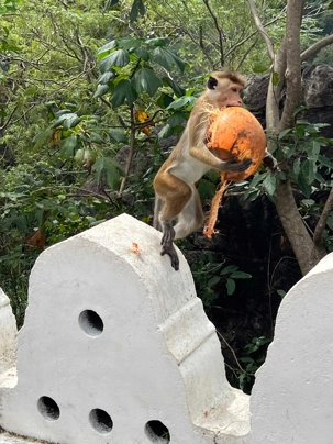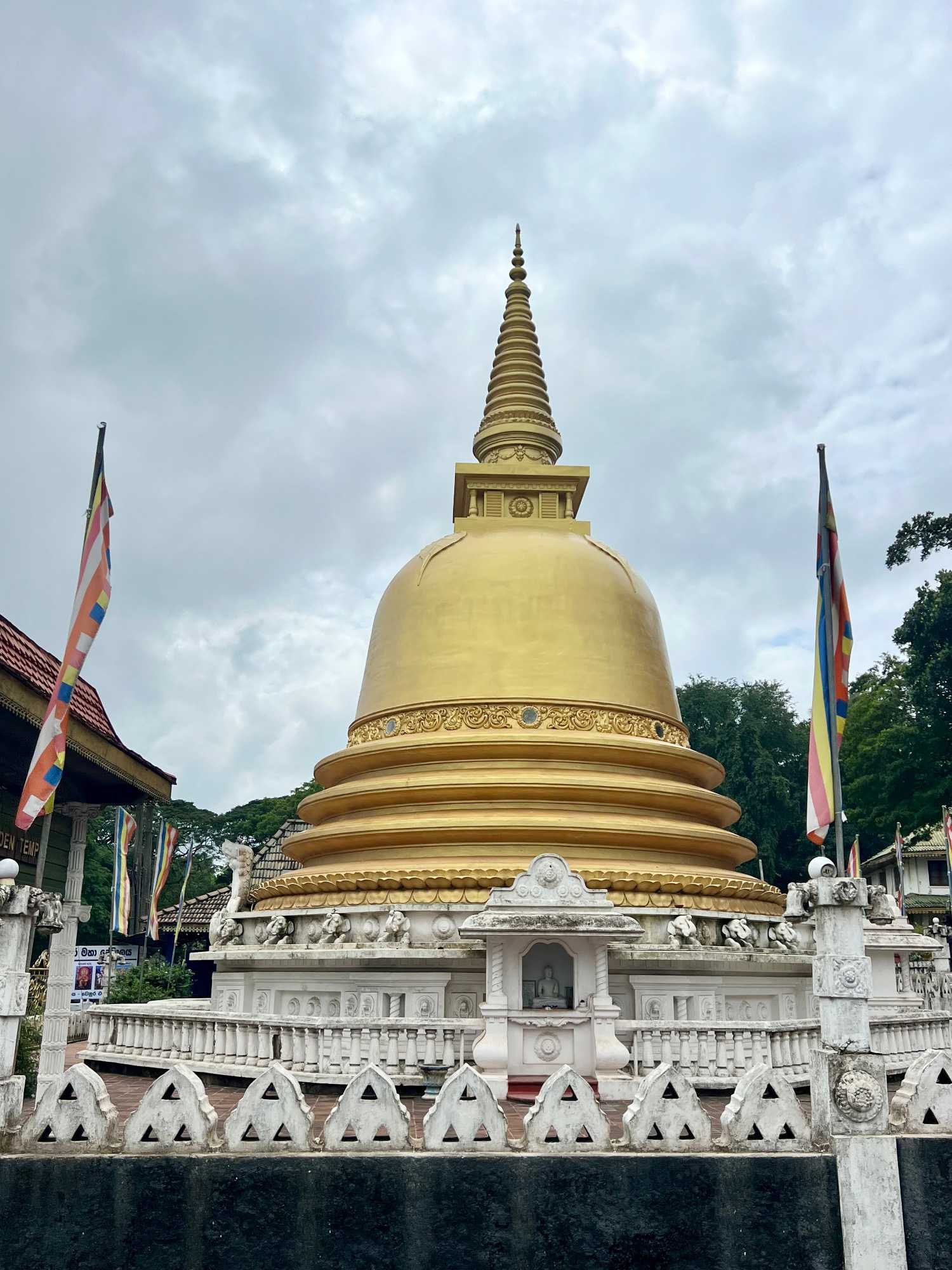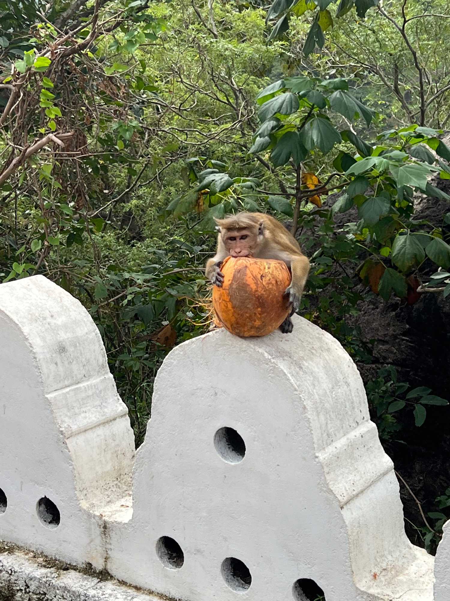 Nous prenons la route en direction de Dambulla, pour visiter le Temple d’Or, l’un des sites les plus remarquables de l’histoire bouddhiste du pays. Édifié au Ier siècle avant J.-C., ce sanctuaire, également appelé Temple des Grottes, nous impressionne par sa beauté et son atmosphère paisible. Nous débutons par la visite de l’immense bouddha et son stupa couleur or, en bas de la montagne. Nous reprenons le bus puis nous prenons un sentier qui monte jusqu’au sanctuaire. Nous pénétrons dans les cinq grottes sacrées, chacune richement décorée de statues et de fresques aux couleurs éclatantes, racontant des récits sacrés et millénaires. La statue de Bouddha couché de 14 mètres de long, installée dans l’une des grottes, est particulièrement saisissante. Les peintures murales, couvrant plus de 2 100 mètres carrés, figurent parmi les plus vastes ensembles de fresques bouddhiques au monde et retracent la vie du Bouddha avec une grande finesse.