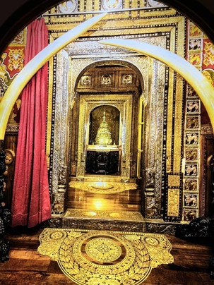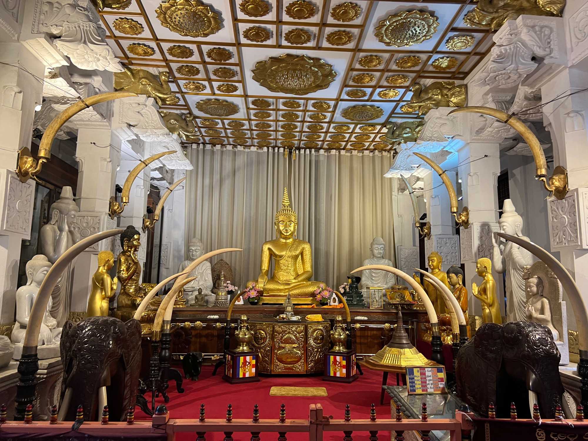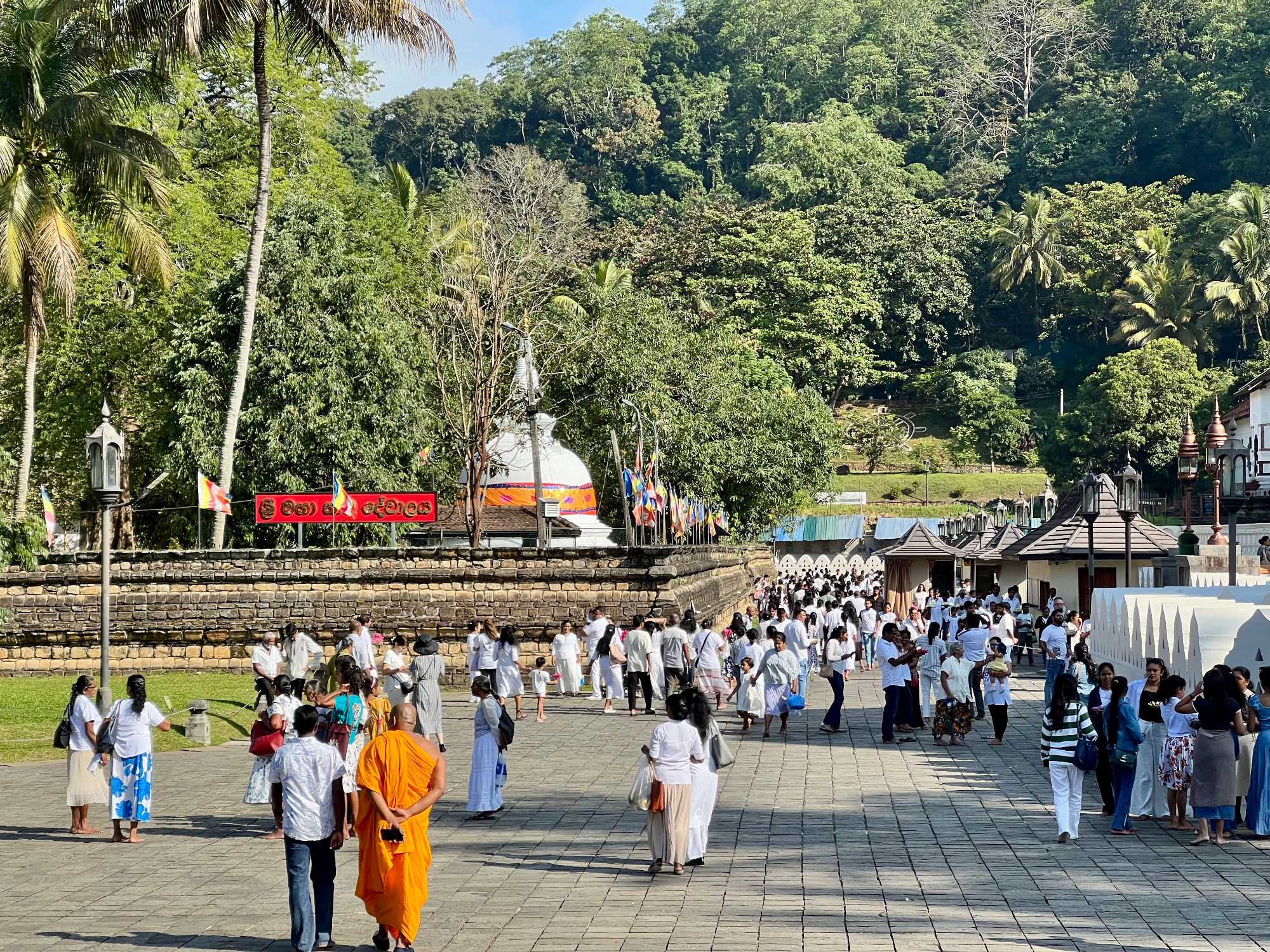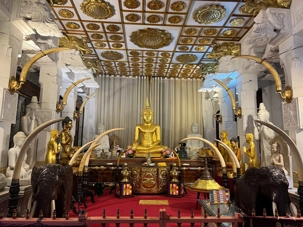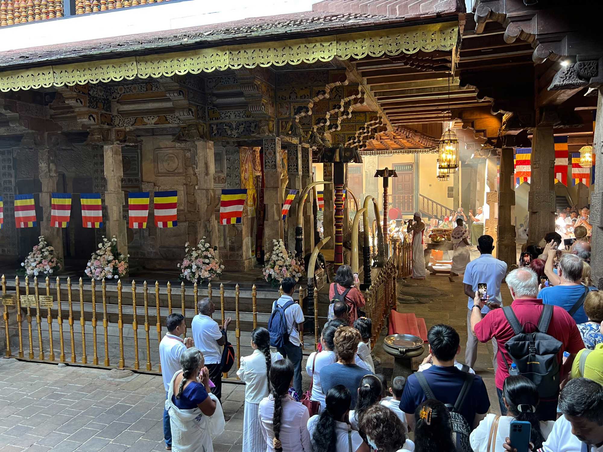 La dent sacrée est conservée dans un reliquaire doré en forme de stupa, dissimulée à l’intérieur de six coffrets gigognes. Trois cérémonies quotidiennes permettent l’ouverture symbolique de l’espace où se trouve la relique. Nous assistons à celle de 9 h 30. Même si la dent elle-même n’est pas visible — on aperçoit plutôt son écrin doré — l’émotion est palpable. La foule est nombreuse, composée de fidèles en prière, et de touristes qui font comme nous. Après quelques autres découvertes à l’intérieur et autour du temple, nous poursuivons notre programme vers notre deuxième visite de la journée.