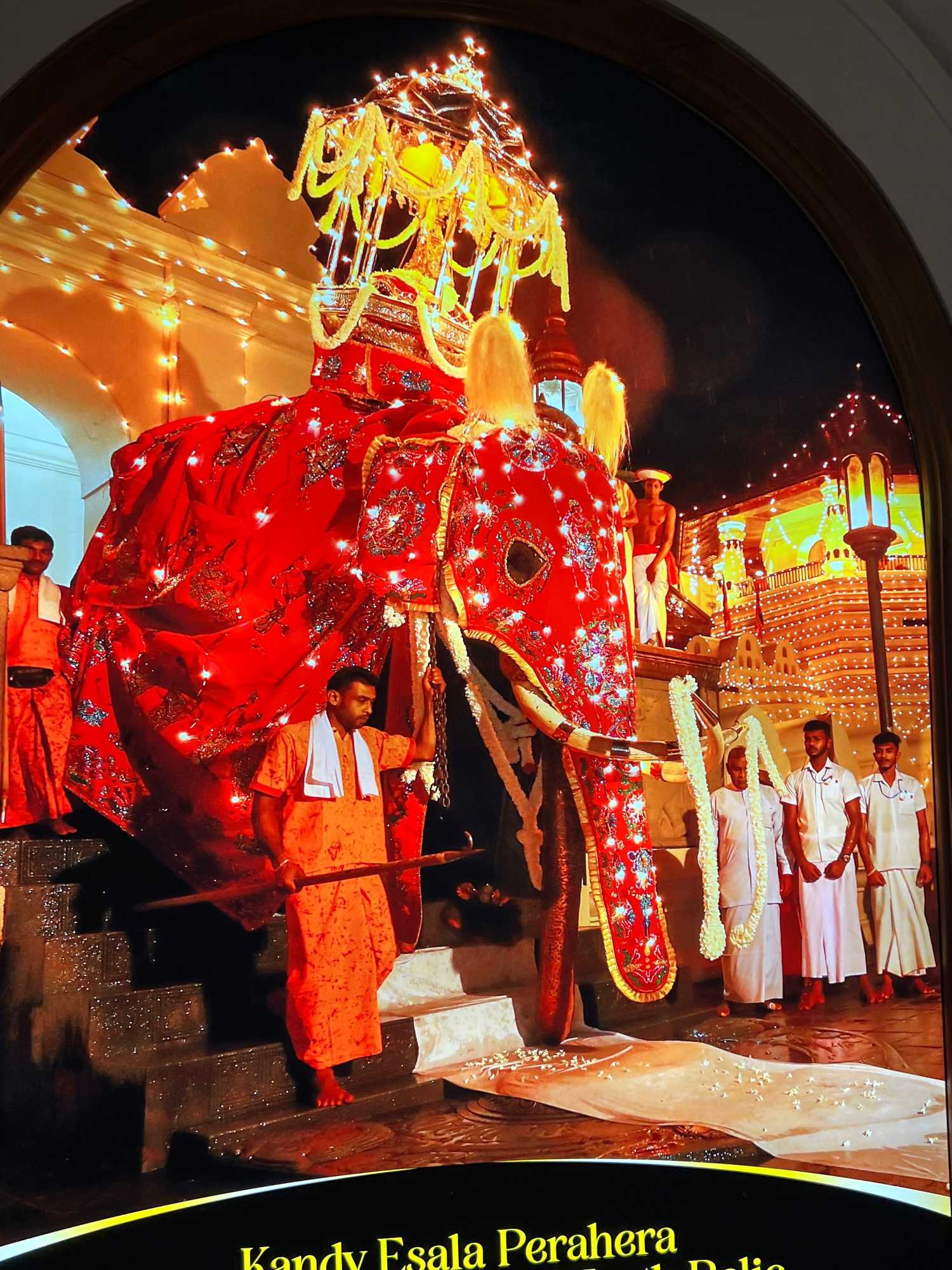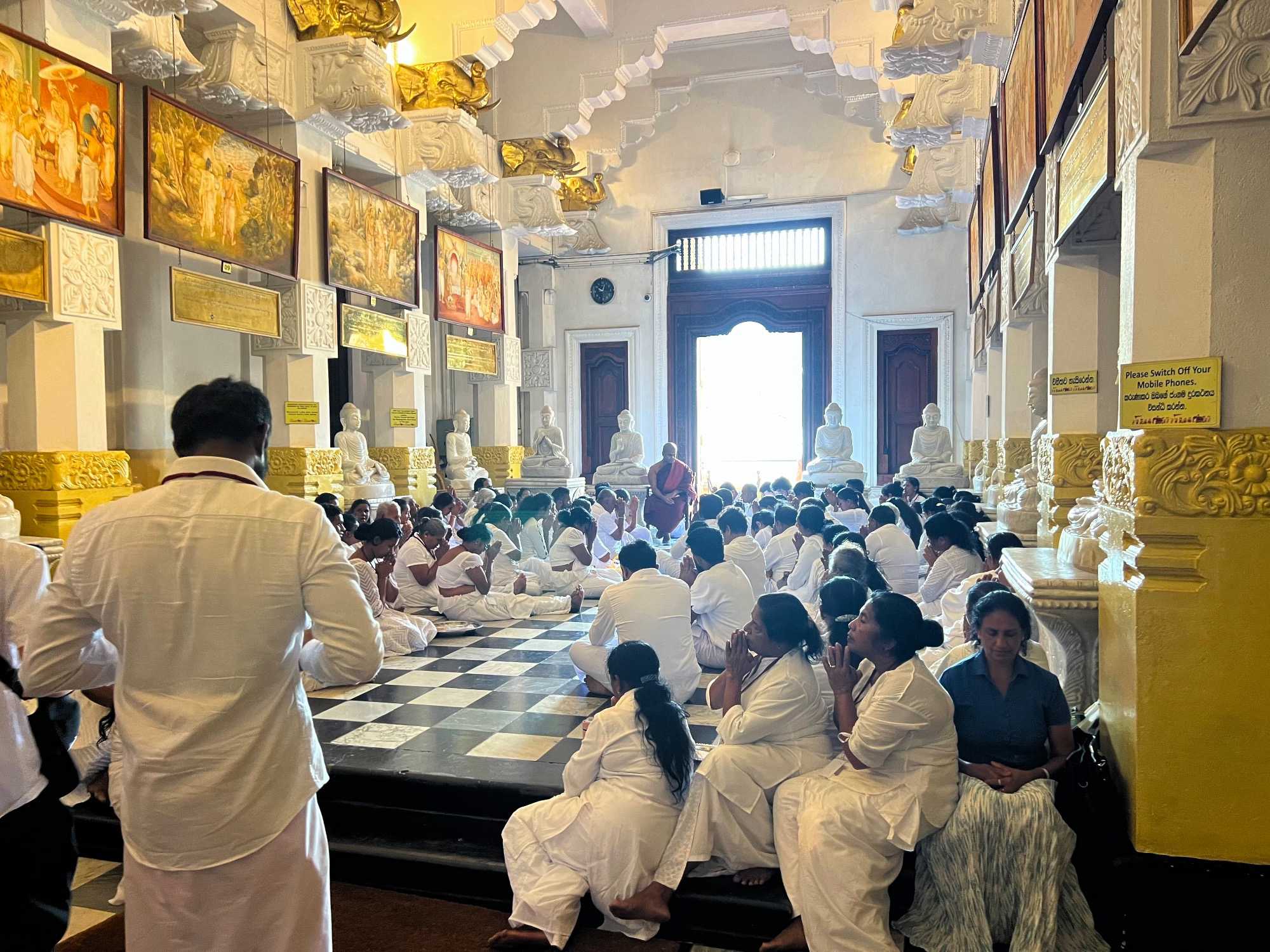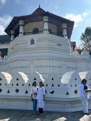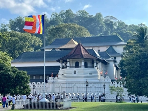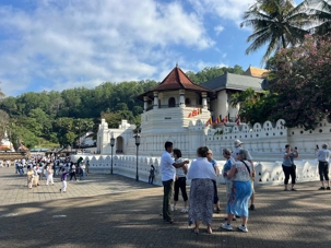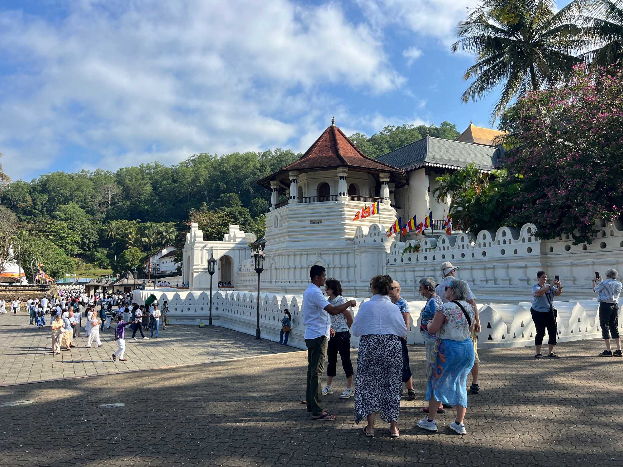 Après un nourrissant petit-déjeuner pris à l’hôtel, Jaya nous demande d’être prêts à 8h30 ce matin afin d’assister à la cérémonie au Temple de la Dent sacrée. Notre guide fait un travail remarquable pour nous permettre de découvrir toutes les richesses de son pays. Le Temple de la Dent sacrée (et non pas de la dent sucrée, comme je l’avais naïvement imaginé au départ… hihihi!) est l’un des sanctuaires les plus sacrés du bouddhisme. Il abrite la relique la plus précieuse du pays : la dent du Bouddha, symbole de légitimité pour tout souverain cinghalais. En pénétrant dans ses salles richement ornées, nous sommes frappés par la ferveur et le recueillement des fidèles. Classé au patrimoine mondial de l’UNESCO depuis 1988, ce temple accueille chaque année des milliers de pèlerins. Tous les bouddhistes sri-lankais se doivent d’y venir au moins une fois dans leur vie. Et nous avons l’impression qu’ils se sont tous donnés rendez-vous ce matin: c’est qu’il y en a du monde!!! Ce n’est pas un "bain de foule" que mes voyageurs ont pris, mais une "piscine de foule"! Michel a même ajouté un "spa de foule", tellement il faisait chaud parmi cette masse de fervents.