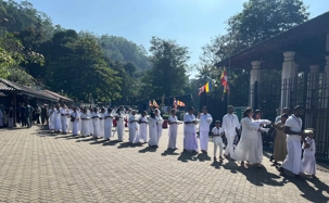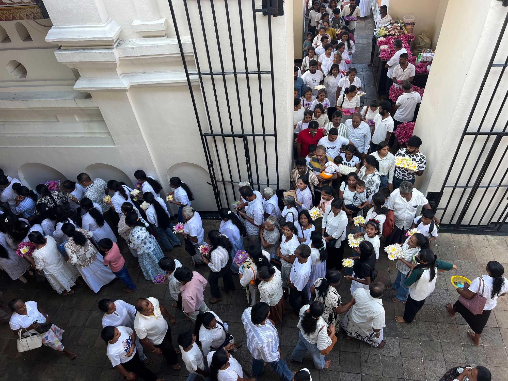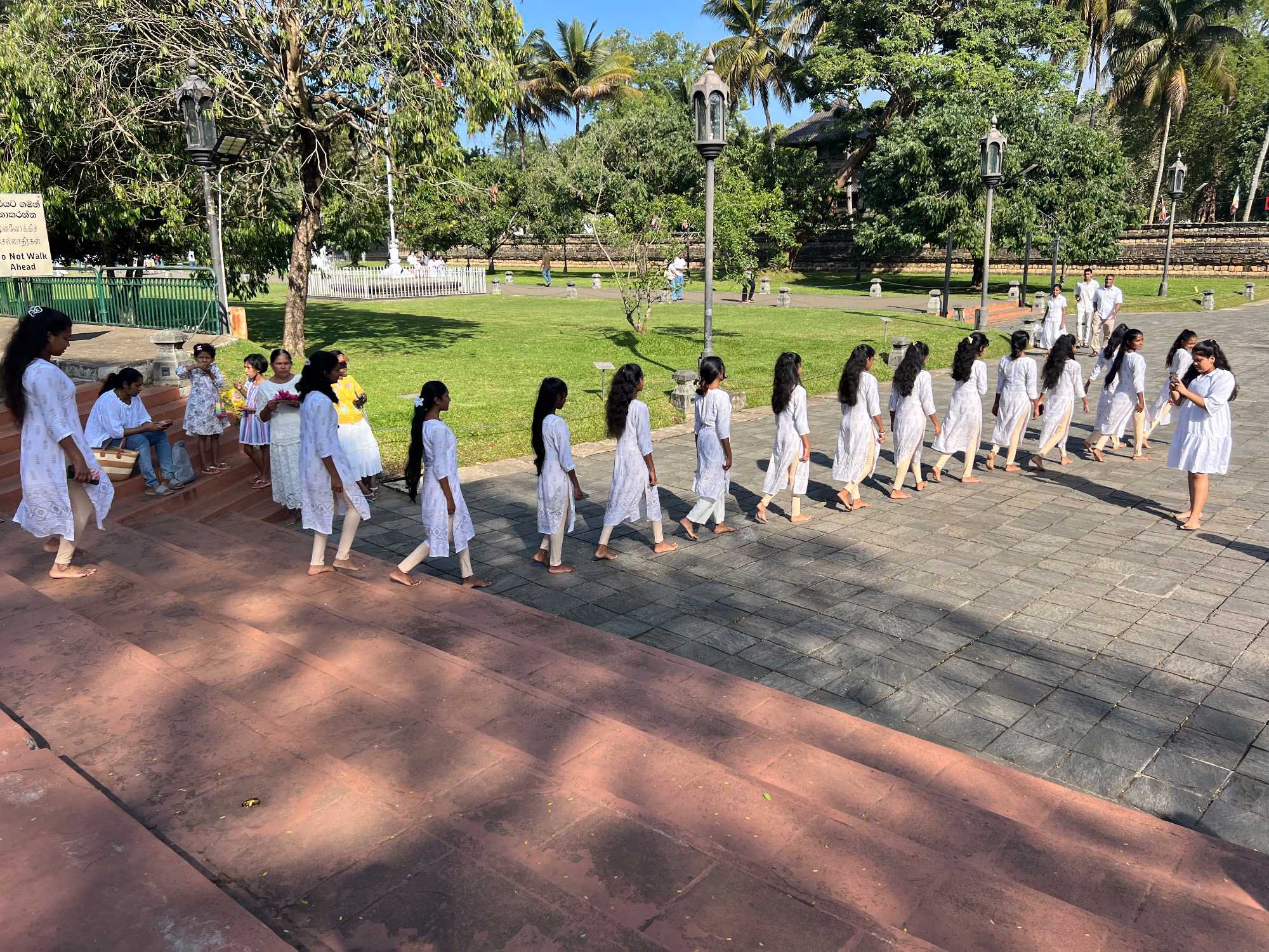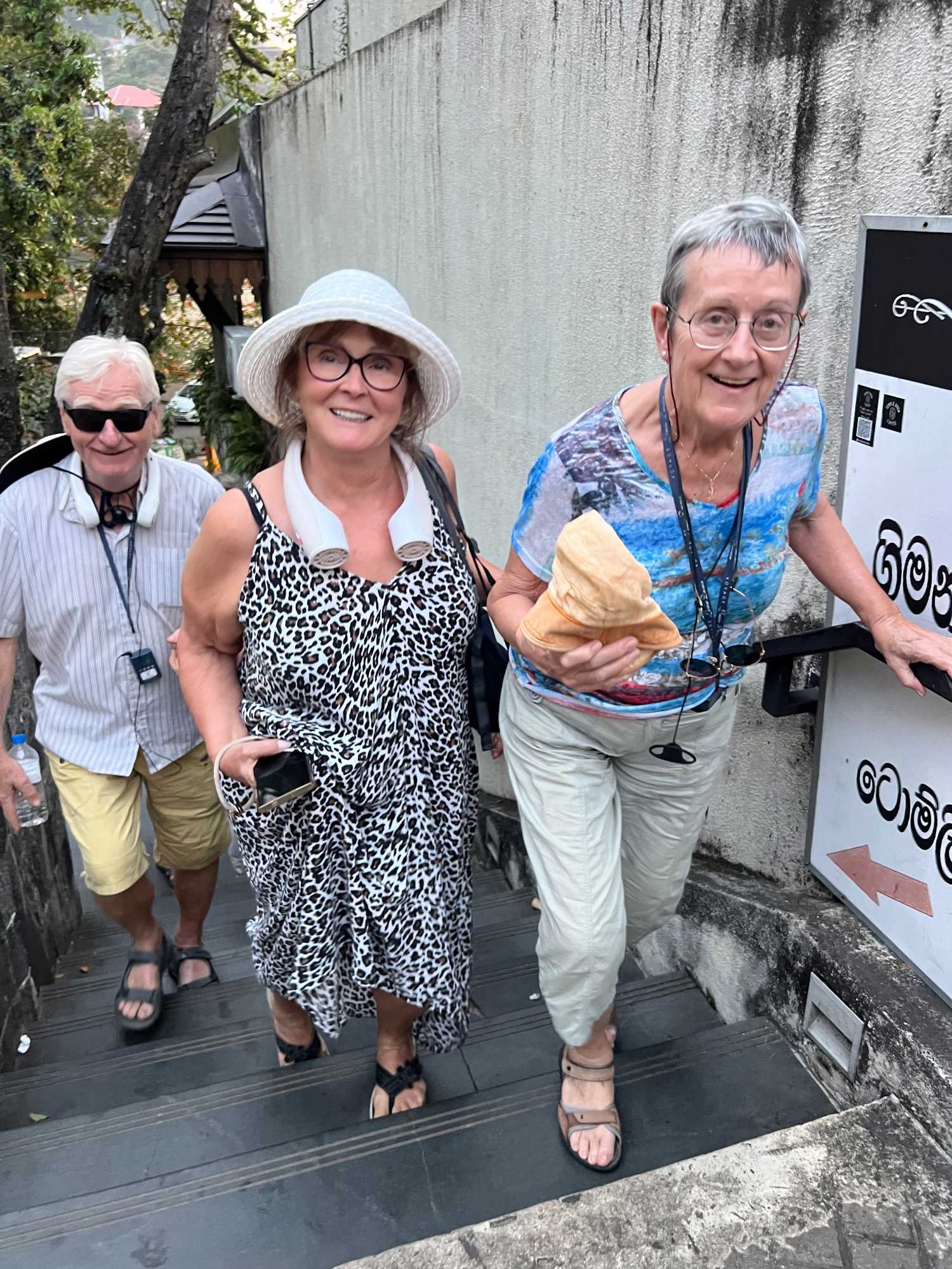 Après un nourrissant petit-déjeuner pris à l’hôtel, Jaya nous demande d’être prêts à 8h30 ce matin afin d’assister à la cérémonie au Temple de la Dent sacrée. Notre guide fait un travail remarquable pour nous permettre de découvrir toutes les richesses de son pays. Le Temple de la Dent sacrée (et non pas de la dent sucrée, comme je l’avais naïvement imaginé au départ… hihihi!) est l’un des sanctuaires les plus sacrés du bouddhisme. Il abrite la relique la plus précieuse du pays : la dent du Bouddha, symbole de légitimité pour tout souverain cinghalais. En pénétrant dans ses salles richement ornées, nous sommes frappés par la ferveur et le recueillement des fidèles. Classé au patrimoine mondial de l’UNESCO depuis 1988, ce temple accueille chaque année des milliers de pèlerins. Tous les bouddhistes sri-lankais se doivent d’y venir au moins une fois dans leur vie. Et nous avons l’impression qu’ils se sont tous donnés rendez-vous ce matin: c’est qu’il y en a du monde!!! Ce n’est pas un "bain de foule" que mes voyageurs ont pris, mais une "piscine de foule"! Michel a même ajouté un "spa de foule", tellement il faisait chaud parmi cette masse de fervents.
