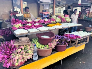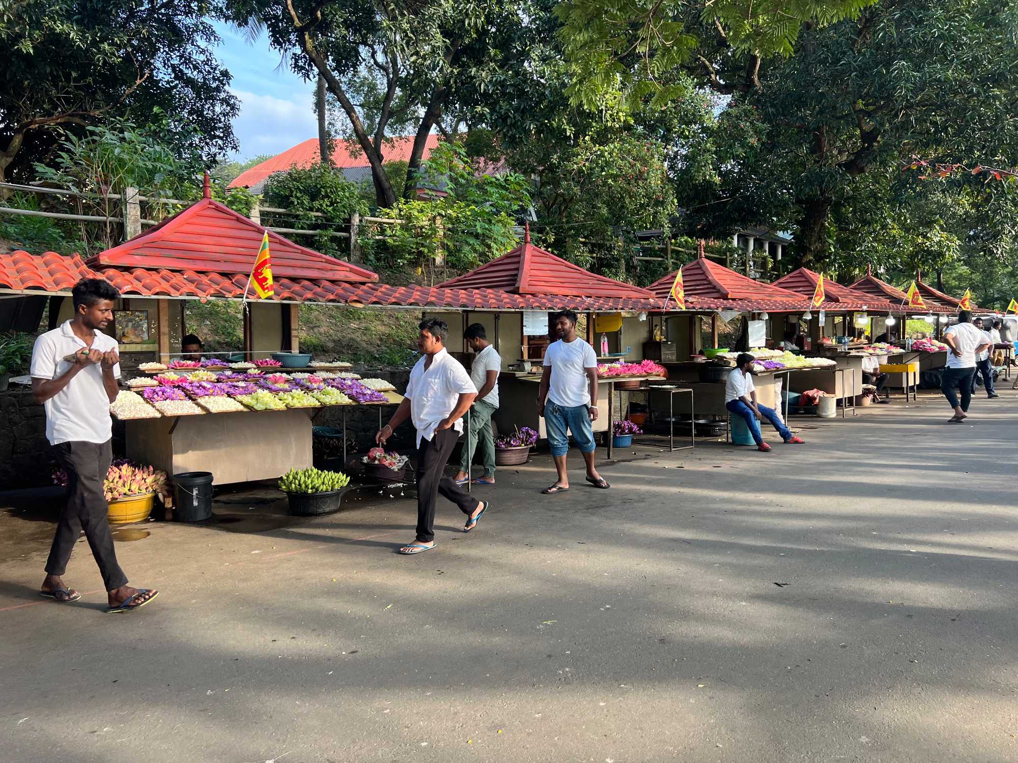 Par la suite, Jaya nous invite à une balade dans les rues de Kandy, ancienne capitale royale des Cinghalais. Située à environ 500 mètres d’altitude, blottie au creux de collines verdoyantes, la ville fut la dernière capitale à résister aux Britanniques jusqu’en 1815. Aujourd’hui, elle demeure un haut lieu culturel et spirituel. Nous débutons par la visite du marché local, véritable poumon de la ville, où s’entremêlent parfums d’épices, couleurs vives des textiles et artisanat typique.