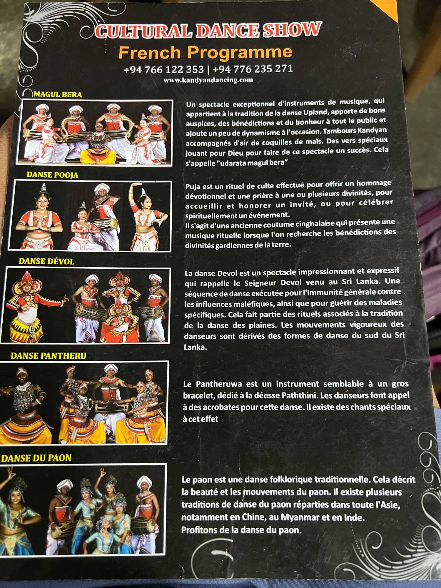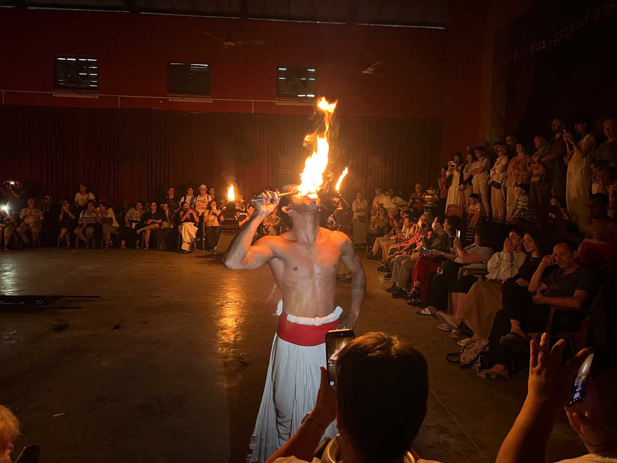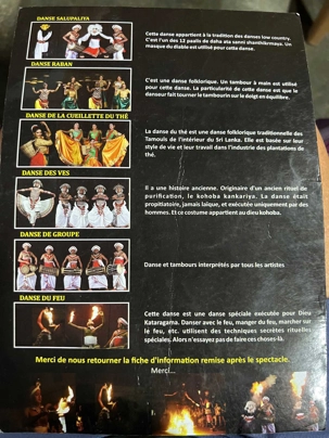 En fin d’après-midi, nous amenons nos voyageurs à une sortie culturelle : un spectacle de danses traditionnelles provenant de toutes les régions du Sri Lanka. Le spectacle est professionnel, rythmé et passionnant. Tout le groupe a adoré. Le fait d’avoir rencontrer le danseur ce matin nous a fait d’autant plus apprécier le spectacle.