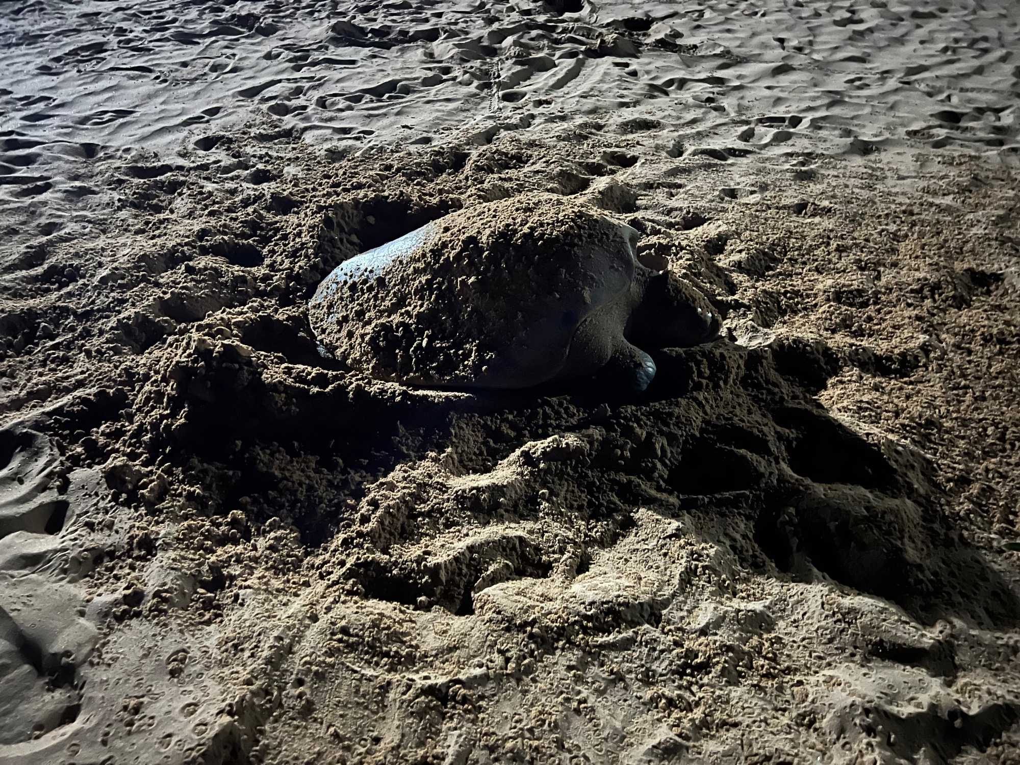 En soirée, lors d'une marche sur la plage, j'ai suivi une trace jusqu'à... une grosse tortue! Wow! Quelle surprise!