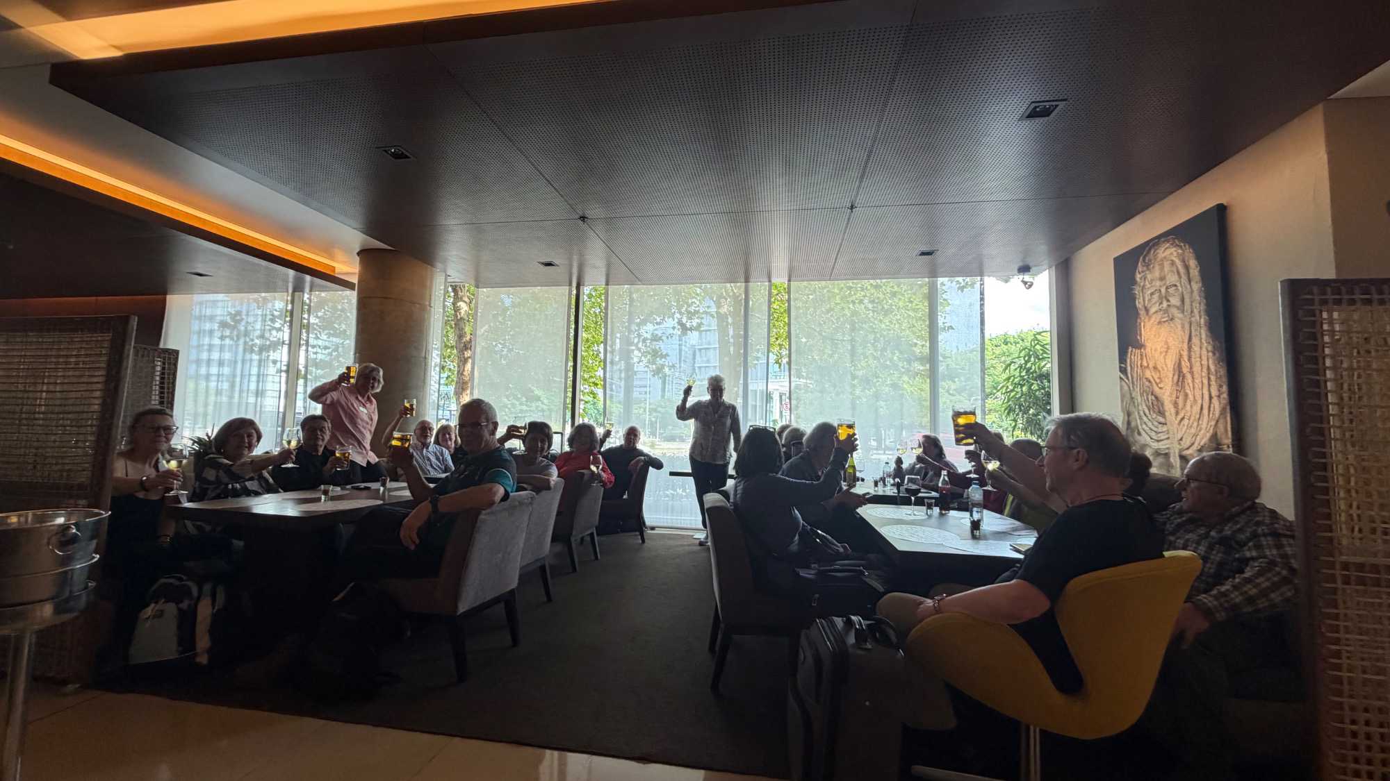 Dès notre arrivée, les voyageurs se sont installés confortablement dans un petit salon pour un apéritif bien mérité. Au menu : un délicieux Malbec argentin et de savoureuses empanadas, gracieuseté de Mme Louise Drouin.Après un si long voyage, tous étaient ravis de se retrouver enfin ensemble, de bavarder et de faire plus ample connaissance. Quel bonheur de les voir déjà si animés, souriants, et heureux de partager ce premier moment convivial en Argentine!