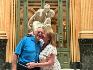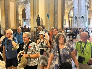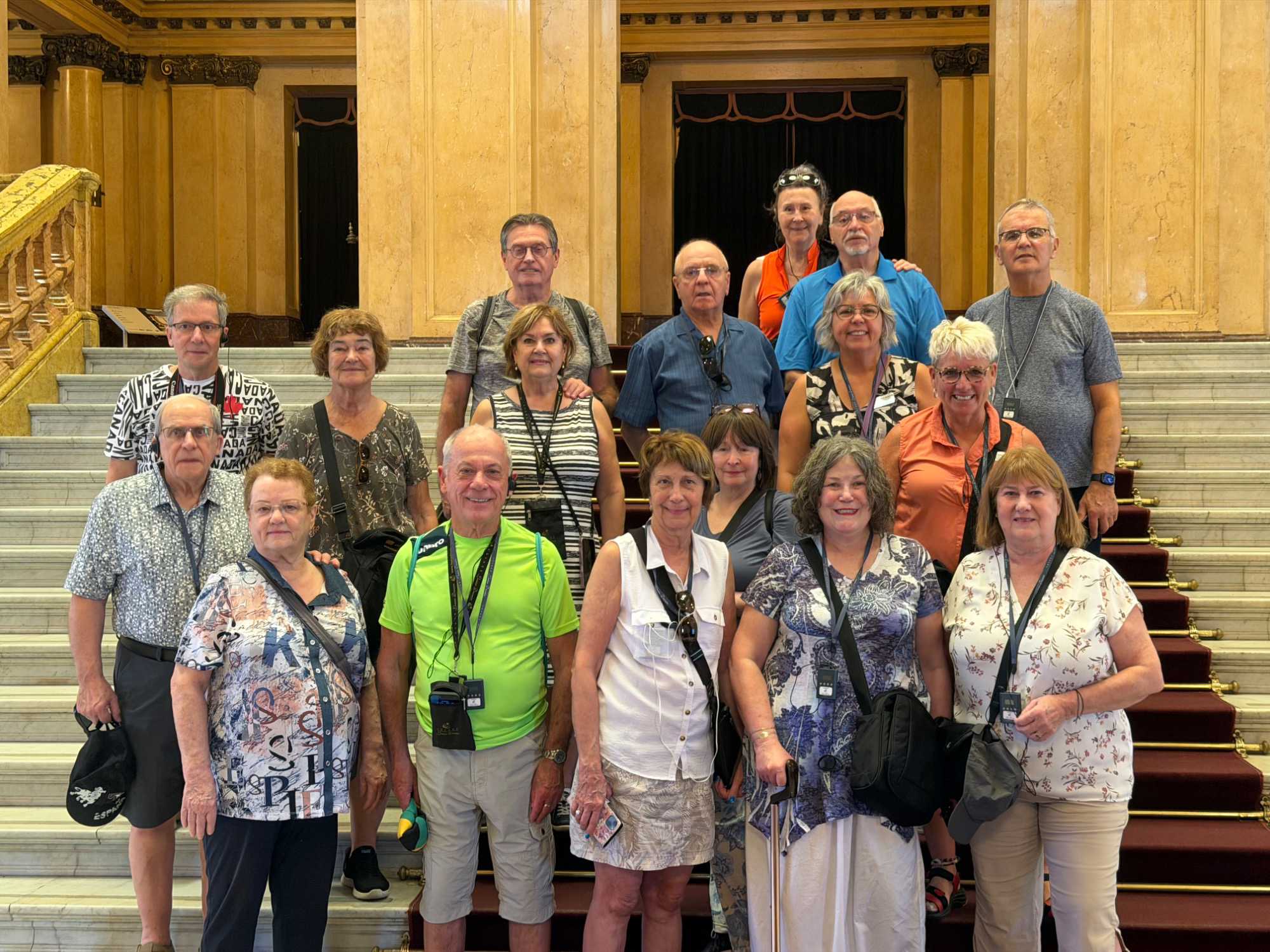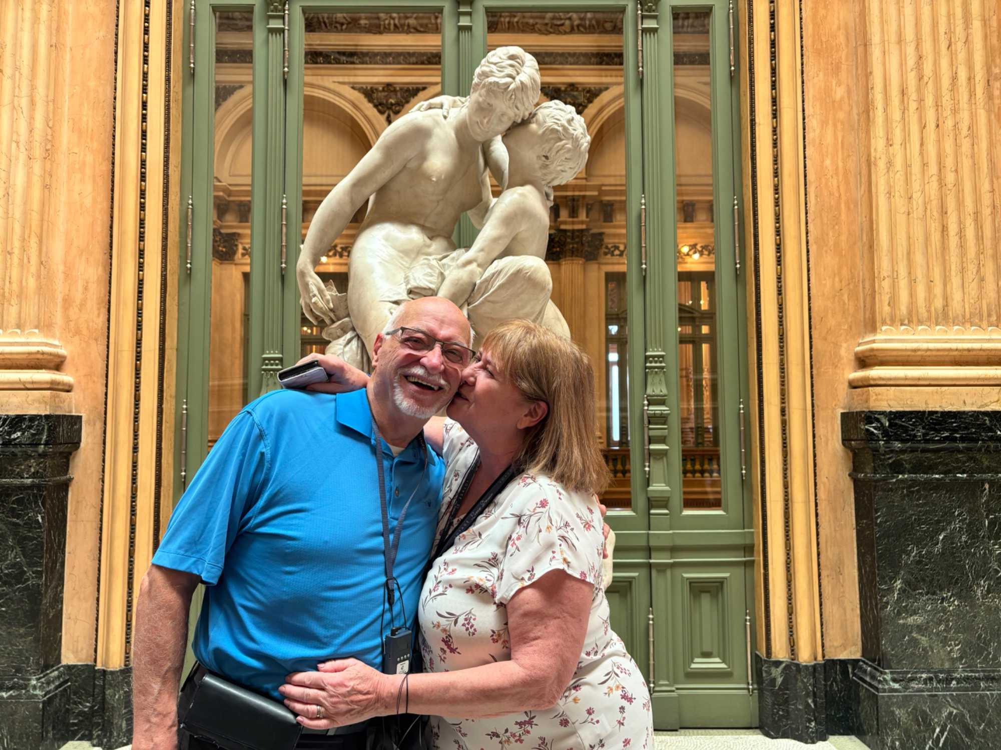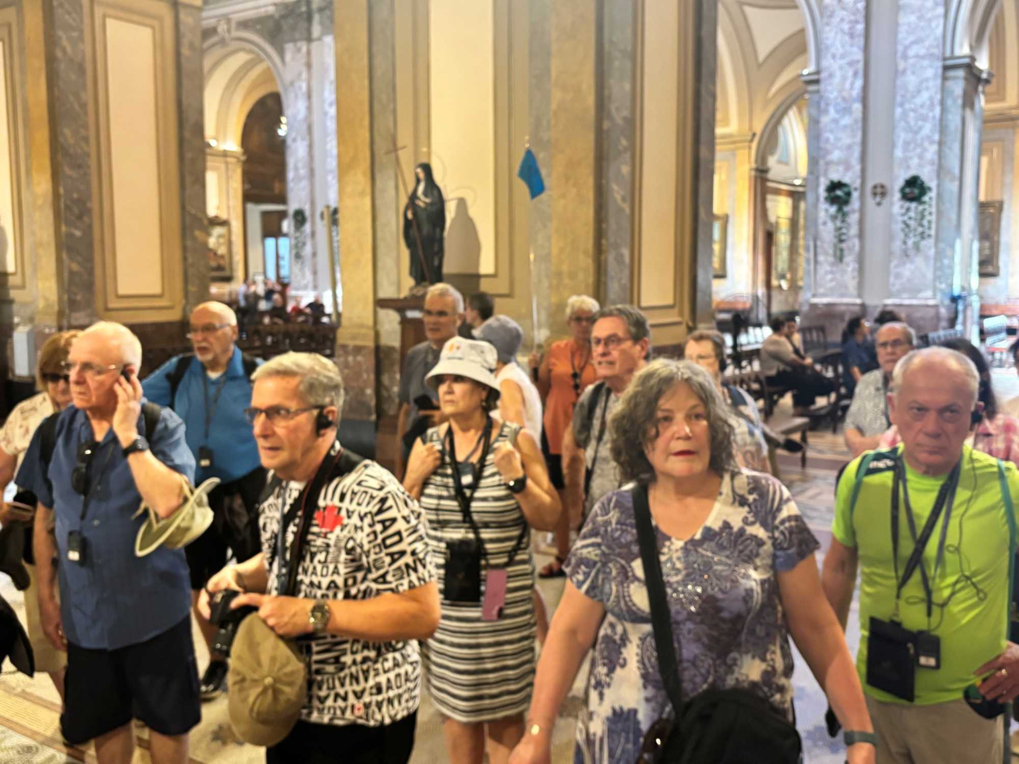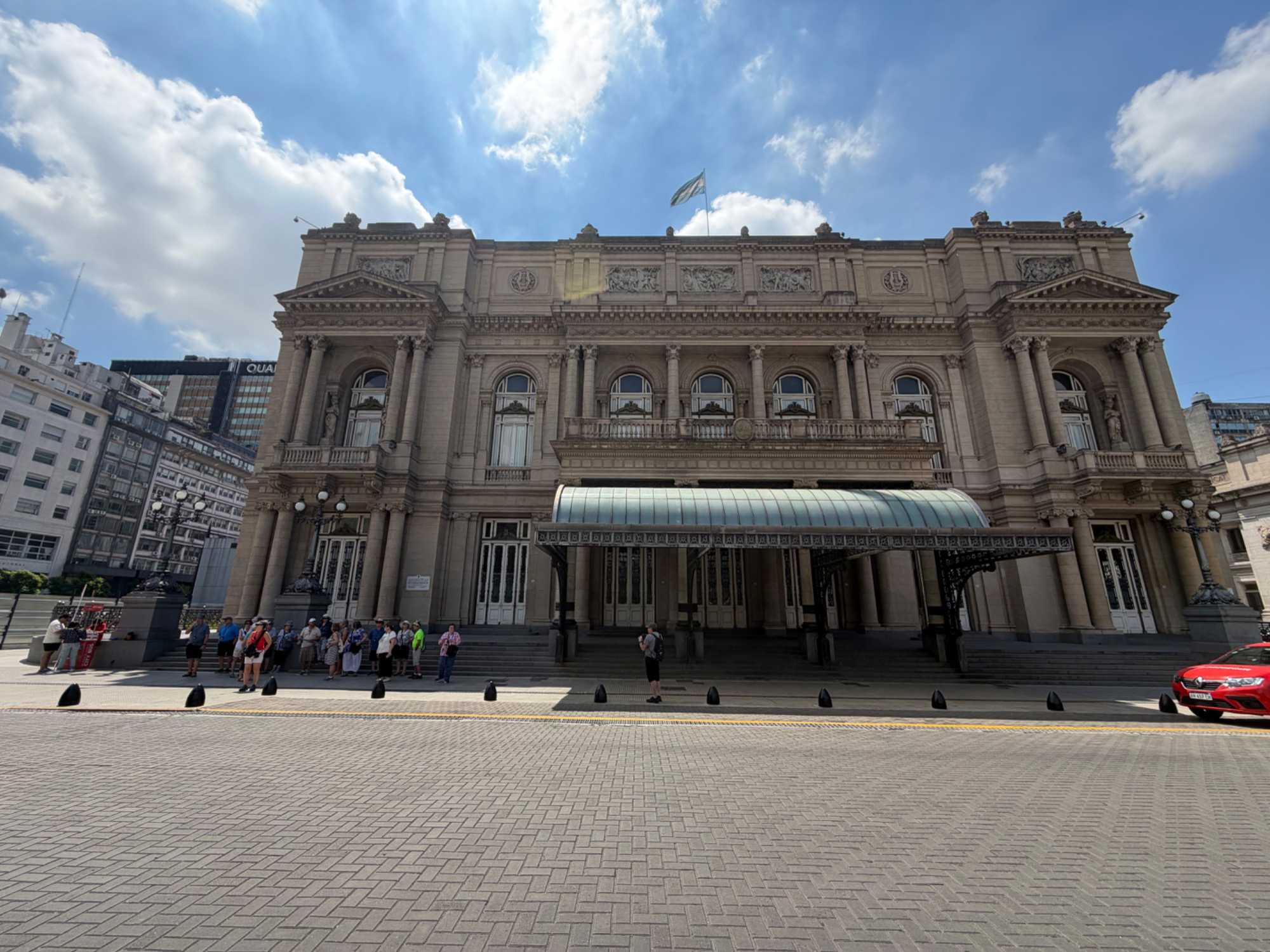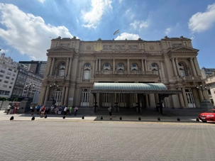 C’est sous le soleil franc du midi portègne que notre groupe s’avance vers le Teatro Colón, porté par cette douce effervescence typique de Buenos Aires à l’heure du dîner. Autour de nous, les employés sortent des bureaux, les kiosques servent des empanadas brûlantes, et l’odeur du café fraîchement torréfié flotte dans l’air. Malgré le brouhaha de la ville, une excitation tranquille s’installe parmi les voyageurs : nous allons pénétrer au cœur de l’un des théâtres les plus prestigieux au monde.