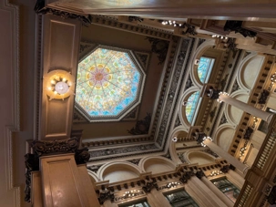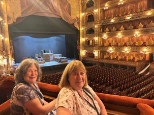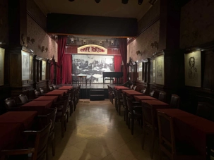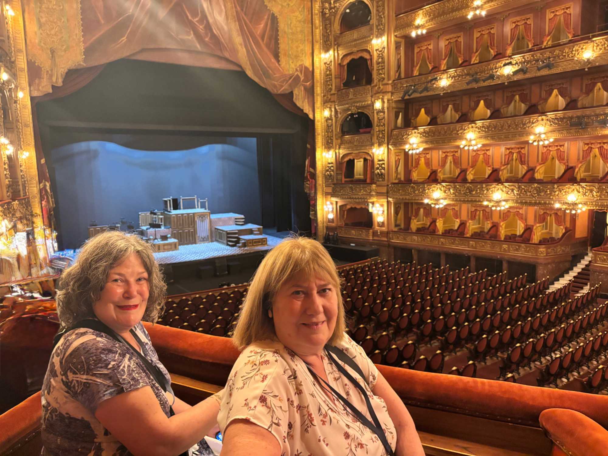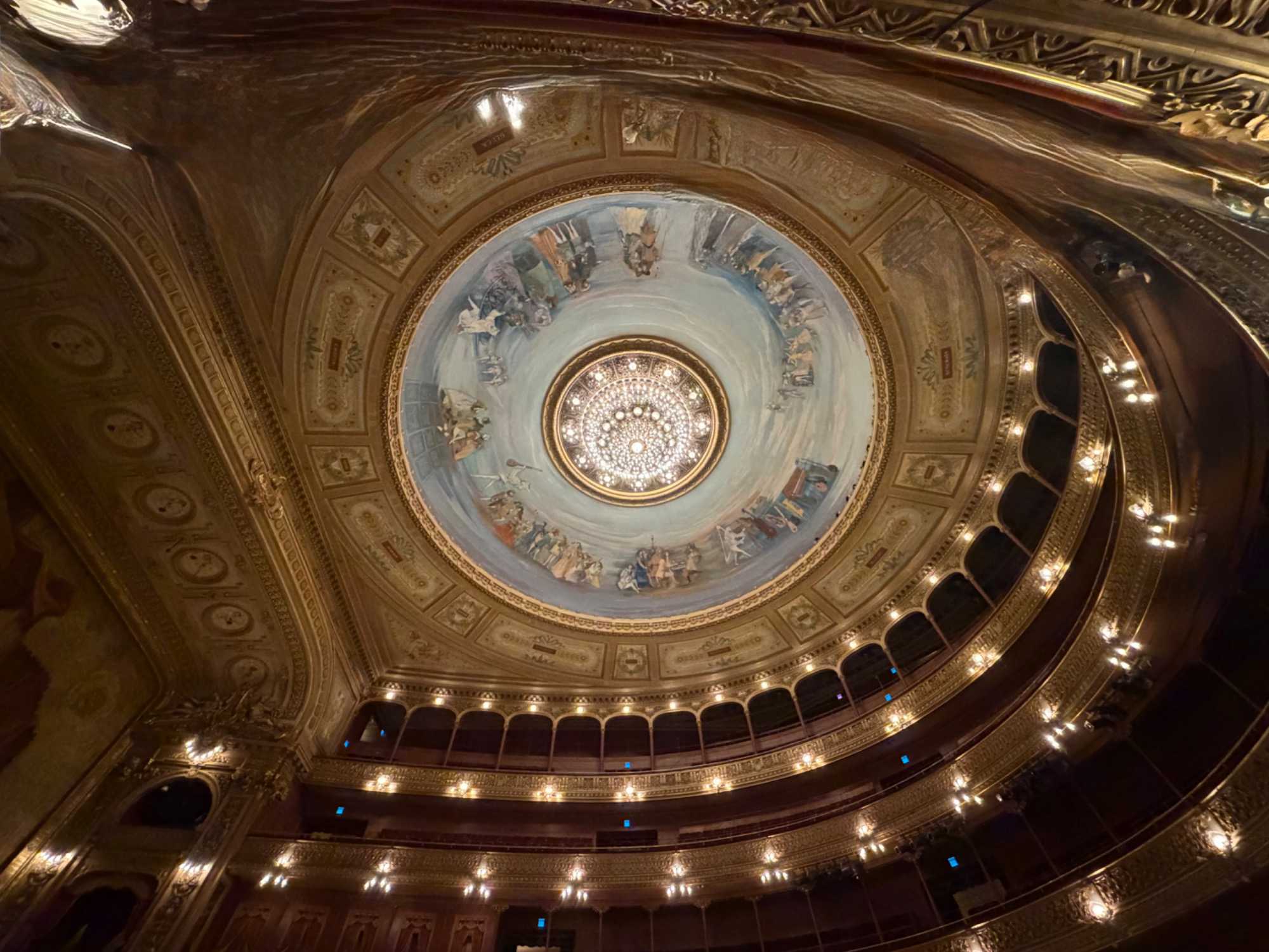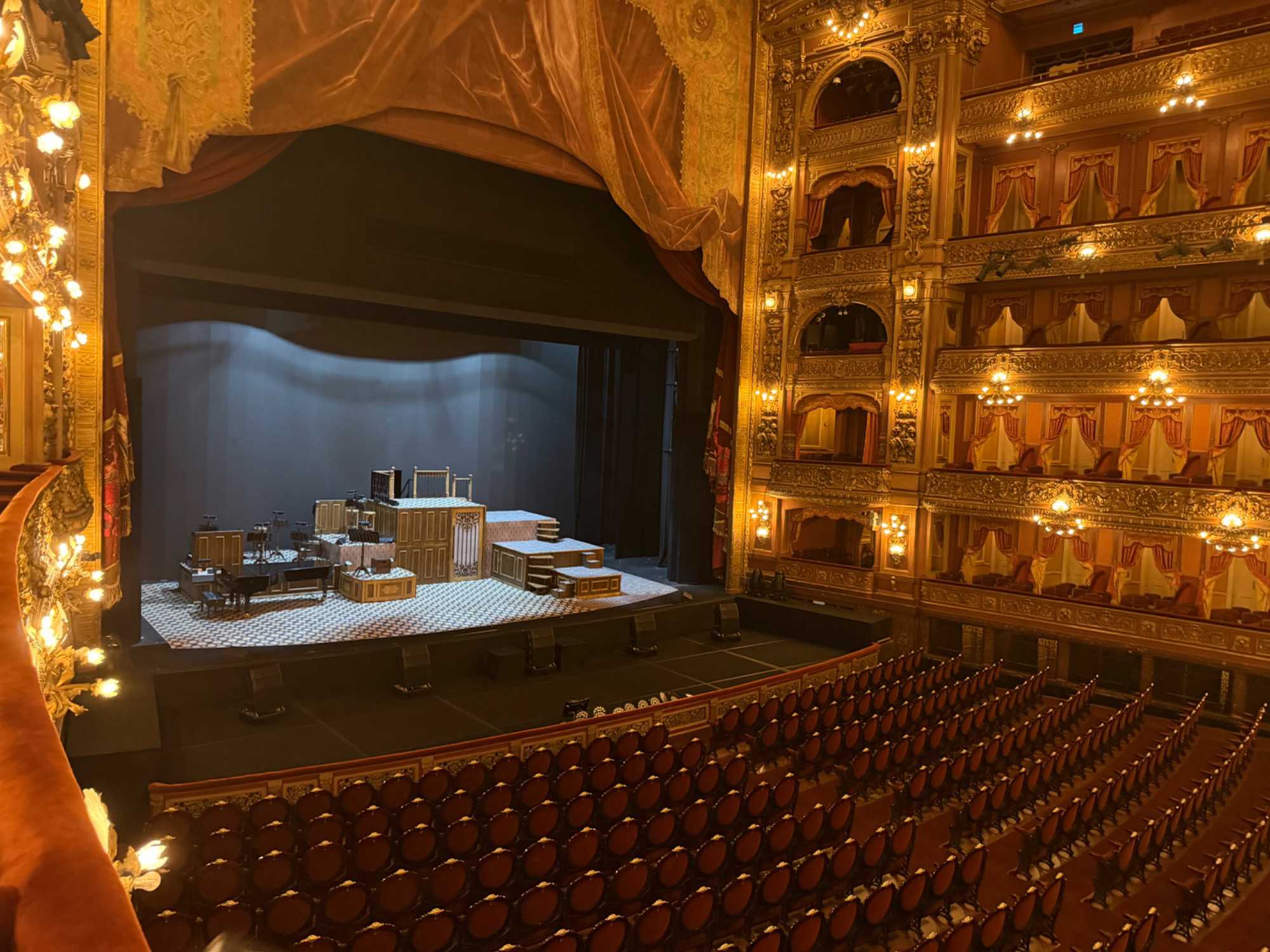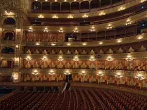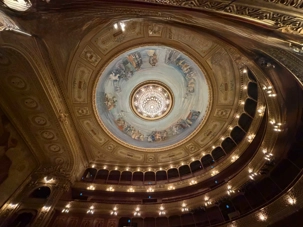 Nous avançons et, d’un coup, la grandeur nous enveloppe. Les balcons superposés, la coupole peinte, le rideau rouge monumental… tout respire la grandeur d’un autre siècle. On imagine les soirées où l’orchestre accorde ses instruments, la salle plongée dans l’ombre, les murmures qui courent jusqu’à ce que la première note éclate comme un éclat de lumière.