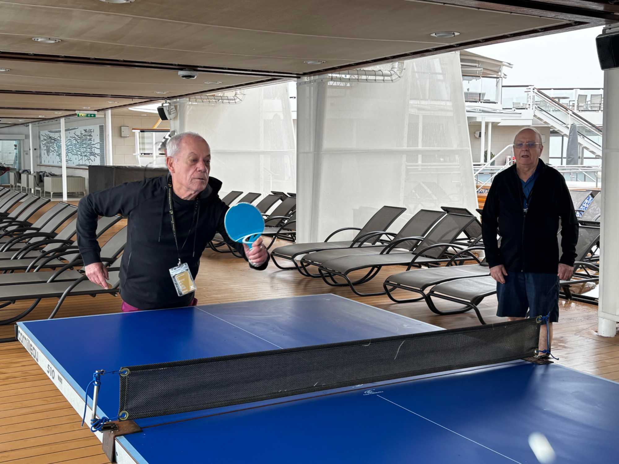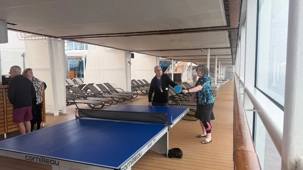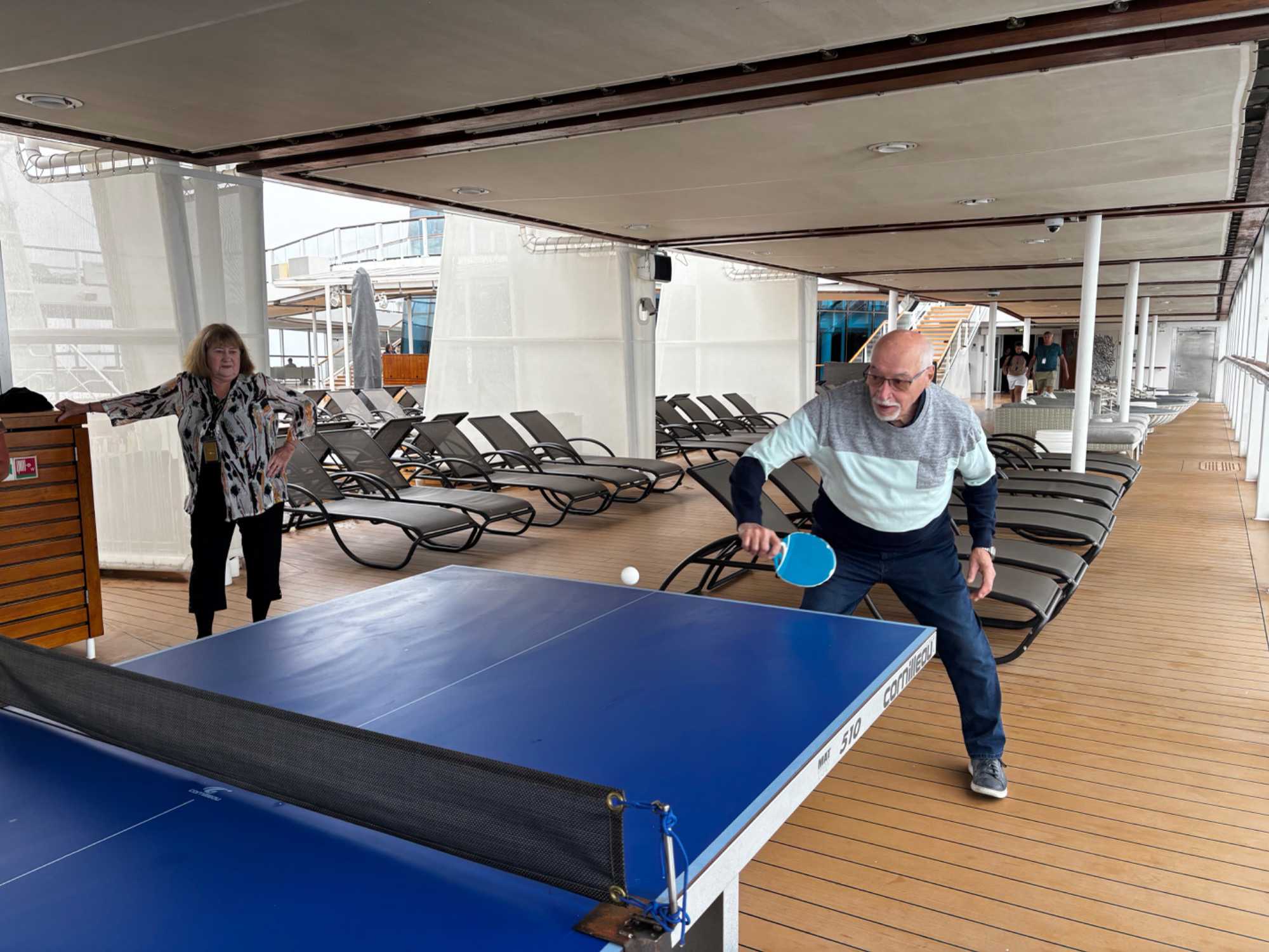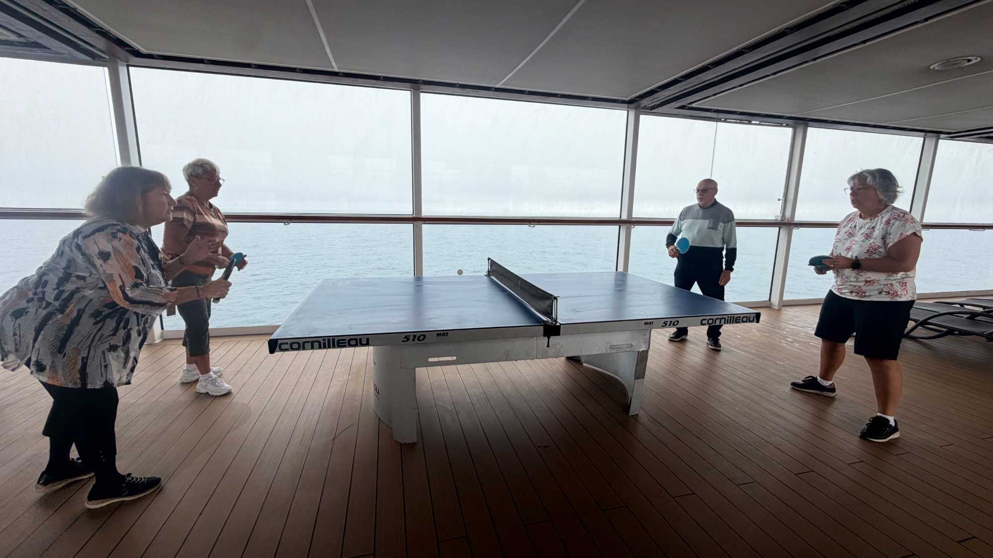 La balle fuse d’un côté à l’autre dans un rythme joyeux et un peu chaotique, typique d’une partie improvisée entre voyageurs. Un smash manqué provoque un éclat de rire général, une balle effleurée roule jusqu’au mur, et un joueur, trop confiant, annonce qu’il « maîtrise totalement la situation » juste avant d’envoyer la balle hors de la table.