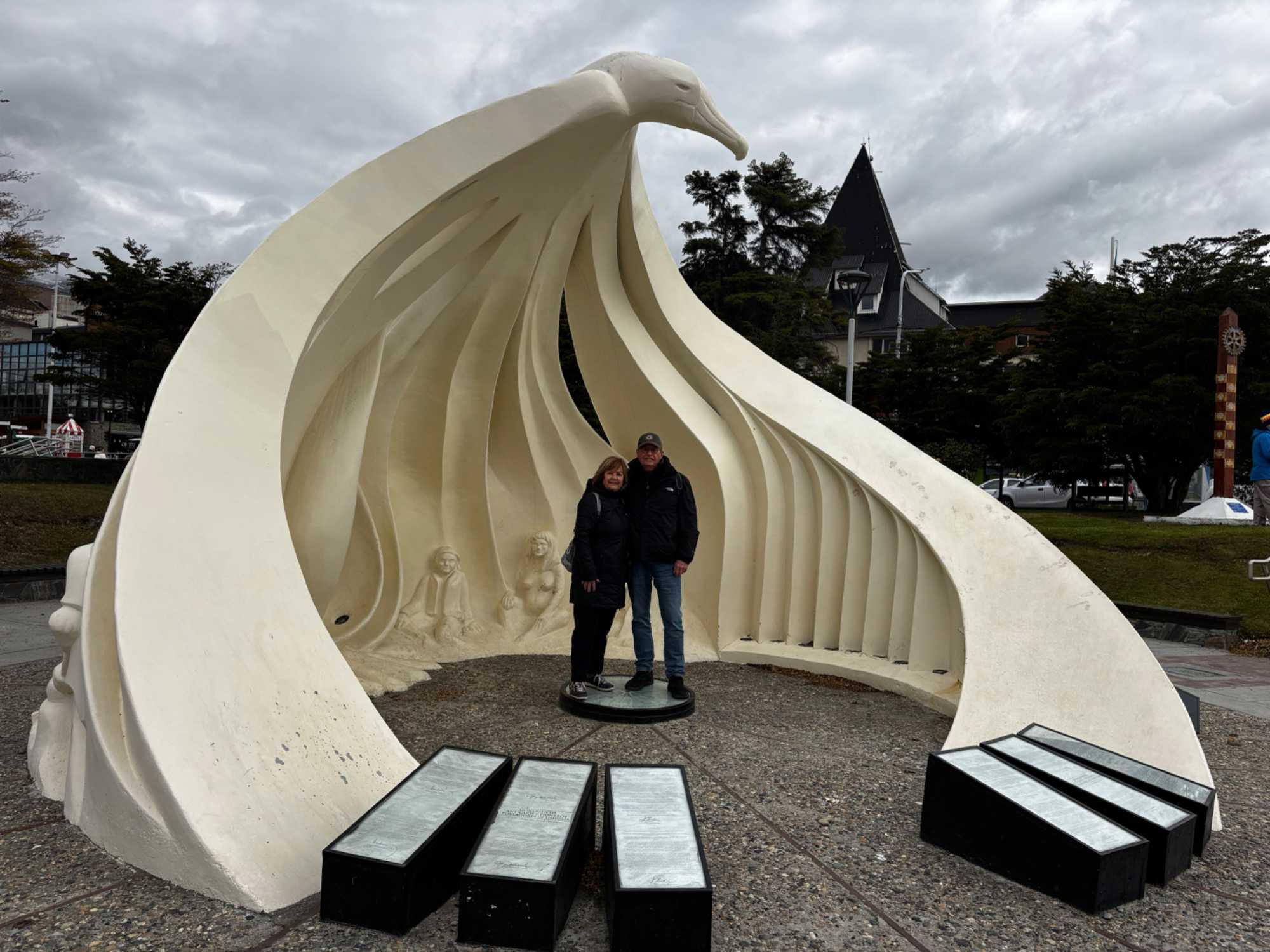 Ce matin, nous sommes partis à la découverte d’Ushuaia, cette ville mythique du bout du monde. Premier arrêt, près du port d’Ushuaia, on trouve une grande sculpture moderne représentant un oiseau blanc stylisé, souvent perçu comme un aigle ou un albatros. Ses ailes ouvertes en métal clair évoquent la liberté, le vent du sud et le lien profond entre Ushuaia et les oiseaux marins qui survolent le canal Beagle. Cette œuvre rend hommage aux grands oiseaux australs, notamment l’albatros, symbole de résilience et de navigation dans ces terres extrêmes. Placée face à la mer, elle donne l’impression de prendre son envol, portée par les rafales qui descendent des montagnes.C’est un endroit parfait pour une photo et pour expliquer au groupe l’importance de la faune ailée dans cette région du bout du monde.