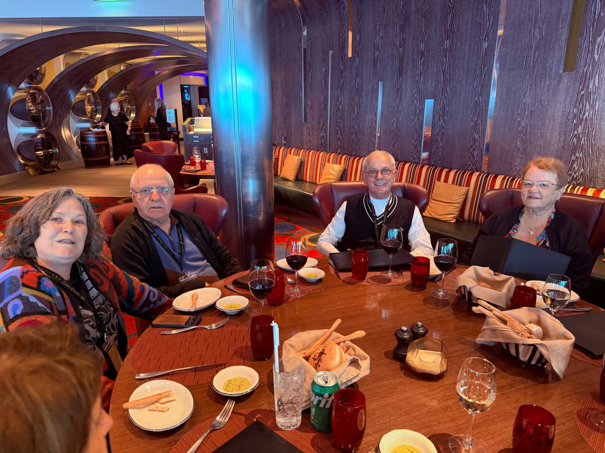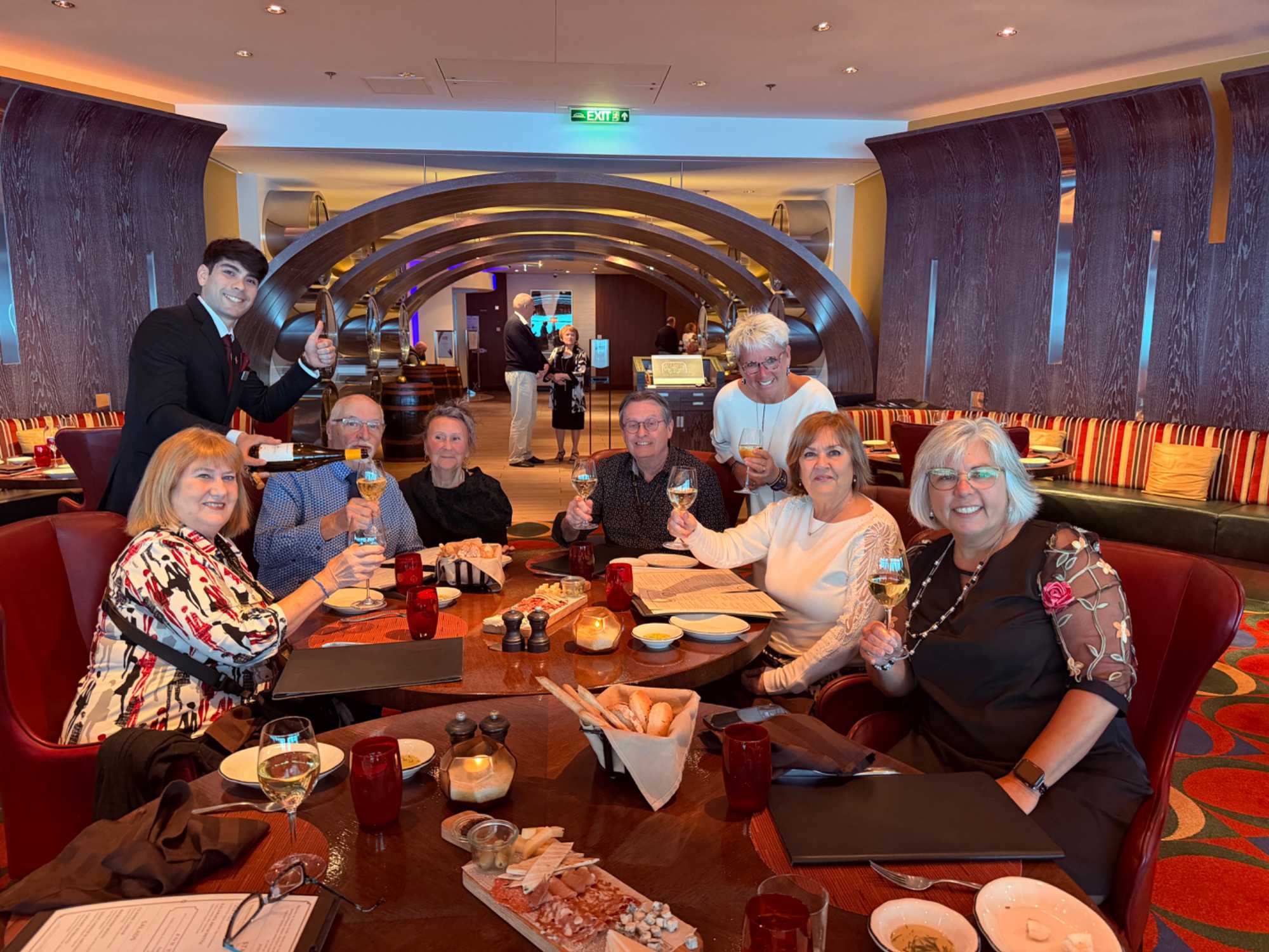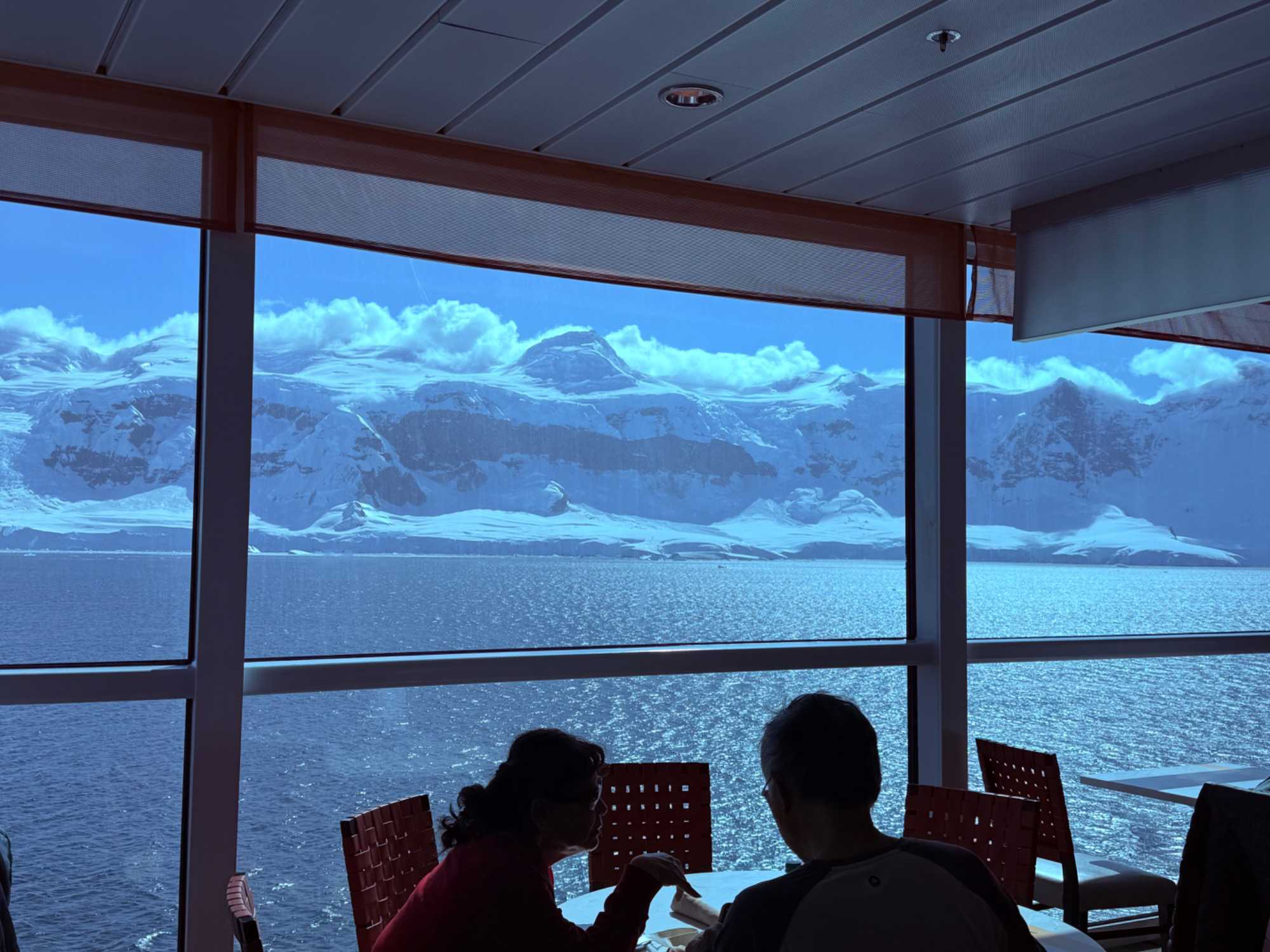 Notre 5 à 7, a lancé la soirée sur une note festive. Nous avons ensuite poursuivi avec un délicieux souper au Tuscan Grill, où tous les voyageurs ont participé avec enthousiasme. Grâce aux immenses fenêtres qui offrent une vue à 180 degrés, nous avons pu continuer d’admirer les glaciers qui défilaient lentement, baignés par la lumière unique de l’Antarctique.
