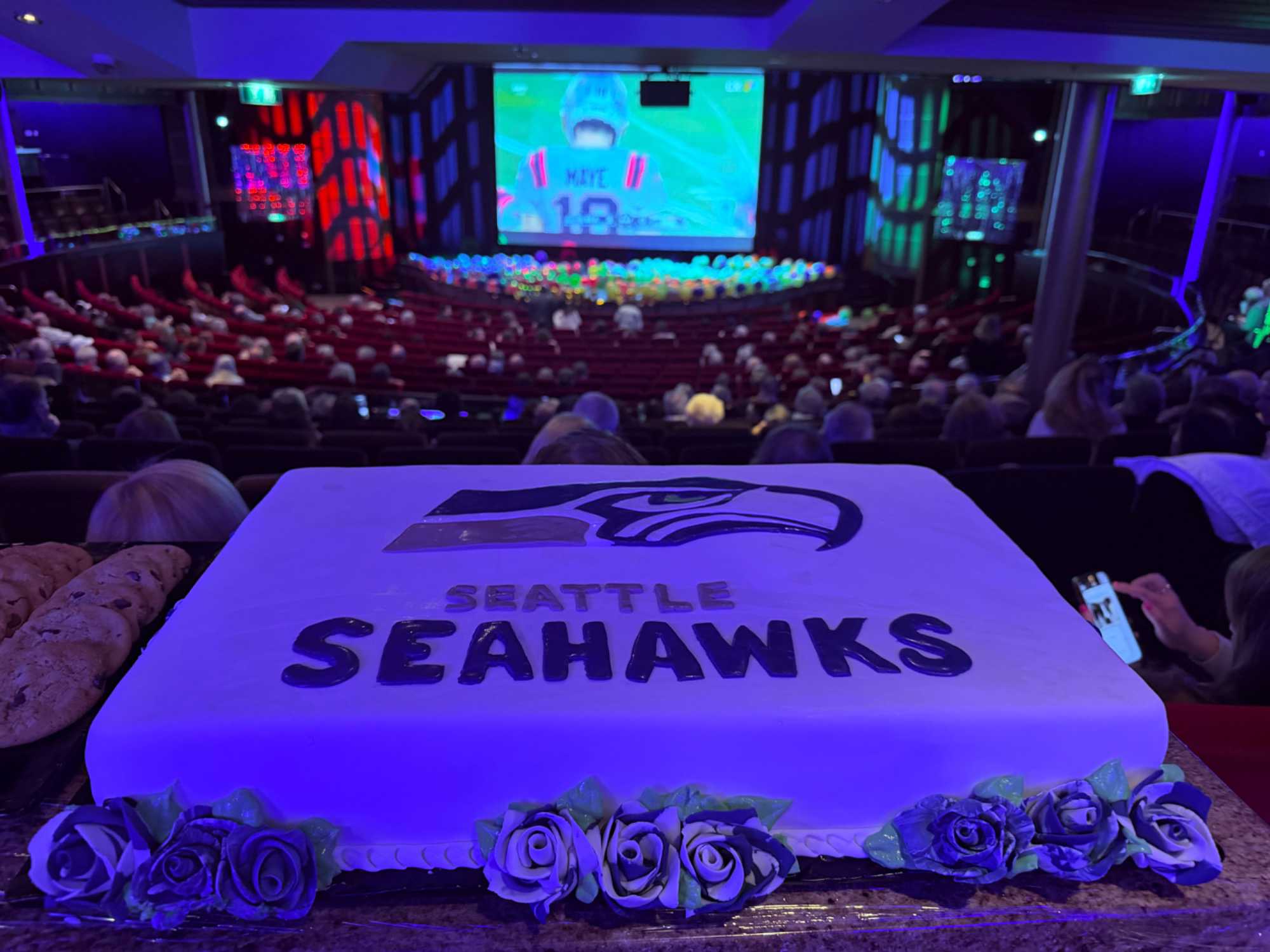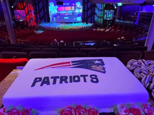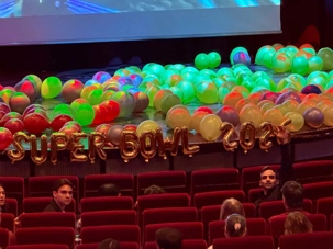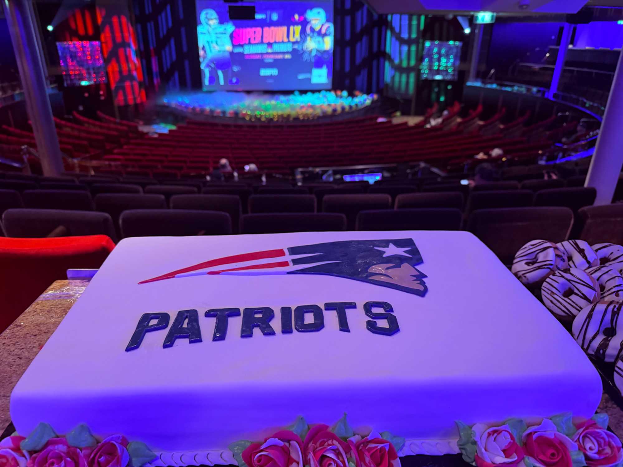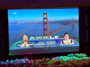 Les tables débordaient de classiques du Super Bowl : ailes de poulet, mini-burgers fumants, nachos garnis, hot-dogs façon stade, etc. Le théâtre brillait d’un côté aux couleurs bleu et rouge des Patriots, de l’autre aux verts et bleus électriques des Seahawks.