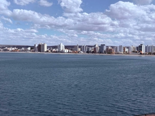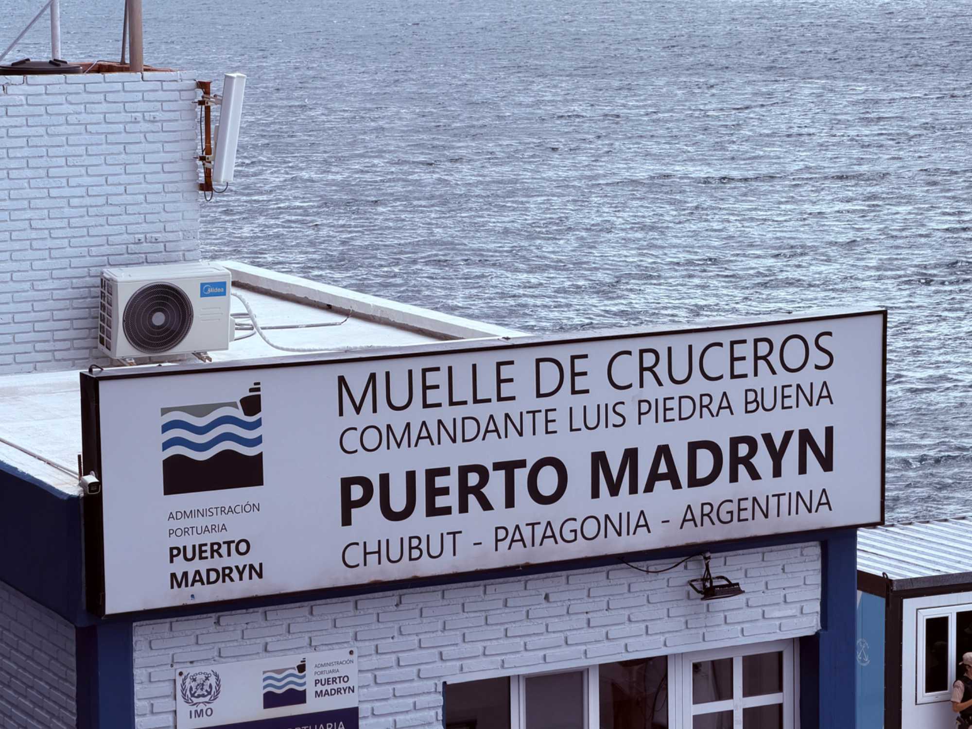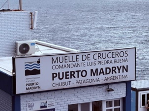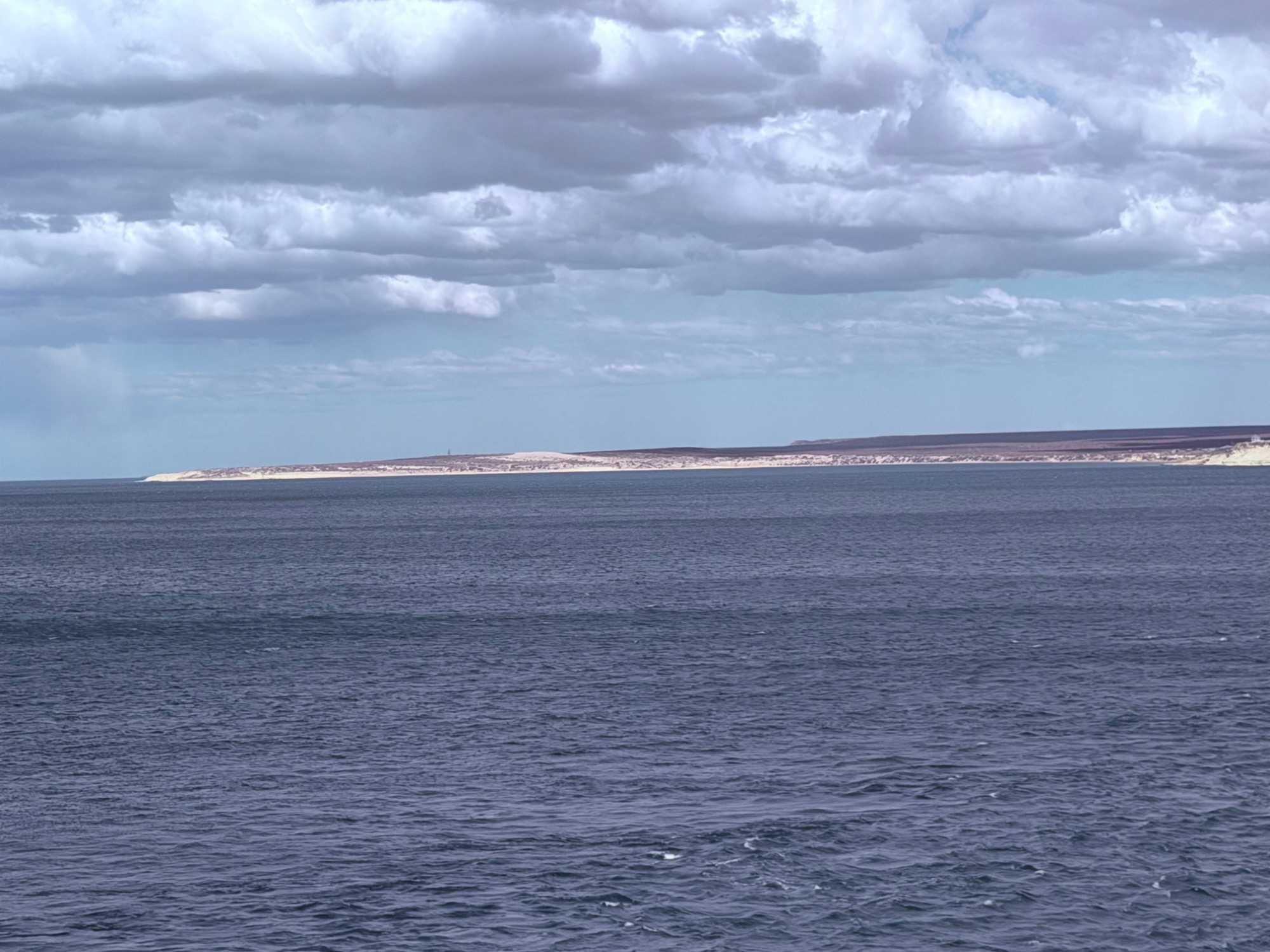 Au petit matin, le navire s’approche lentement de Puerto Madryn, et la silhouette de la côte patagonienne se dessine dans une lumière dorée. La ville apparaît comme une longue bande claire au bord de l’Atlantique, entourée de collines arides et de cette lumière si particulière qui annonce la Patagonie. L’air est plus sec, un peu plus chaud.
