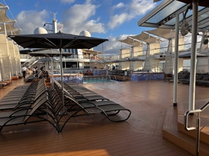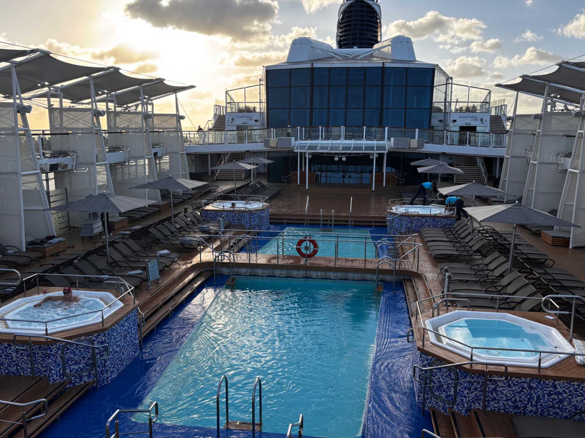 En sortant du Solarium, l’ambiance change complètement. Le pont extérieur s’anime autour des piscines principales. La musique flotte dans l’air, les conversations se mêlent au clapotis de l’eau, et les serveurs circulent avec une aisance parfaite. On sent la vie du navire, cette énergie joyeuse qui accompagne les journées en mer.