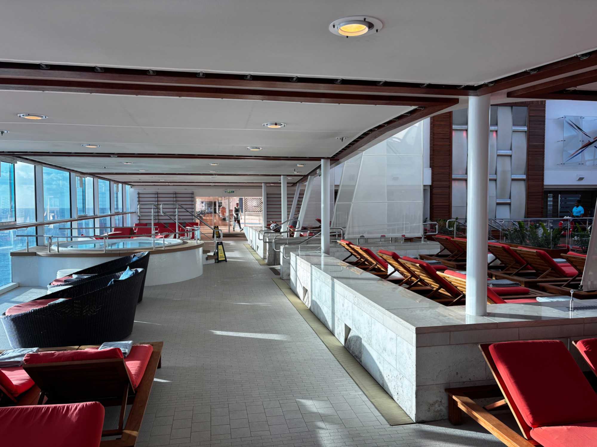 Reprenons notre visite virtuelle du Celebrity Equinox, comme si nous marchions ensemble à travers ses ponts, en laissant chaque espace se dévoiler avec son ambiance propre. En quittant les salons et les espaces publics, nous avançons vers l’un des lieux les plus appréciés du navire : le Solarium. Ici, tout est pensé pour la détente. La lumière est douce, filtrée par de grandes verrières, l’eau des bassins est chaude, et le murmure des fontaines crée une atmosphère presque méditative. C’est un refuge calme, un cocon où le temps semble ralentir.