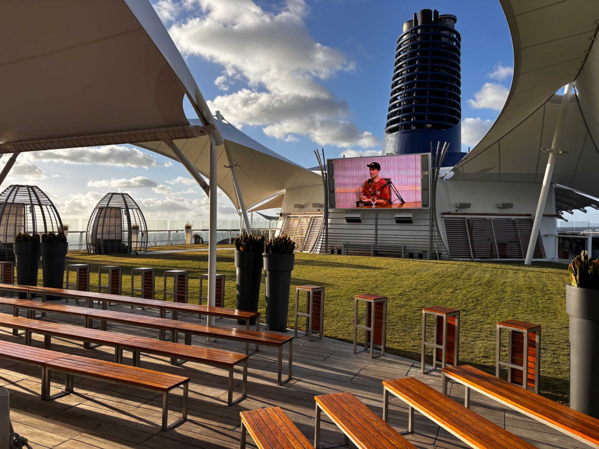 En continuant notre promenade, nous arrivons au Lawn Club, cet espace si particulier qui surprend toujours les voyageurs. Un vrai tapis de gazon naturel, en plein milieu de l’océan. On y marche pieds nus, on s’assoit dans un fauteuil, on regarde l’horizon… et on oublie complètement que nous sommes sur un navire. C’est un lieu simple, apaisant, presque irréel.