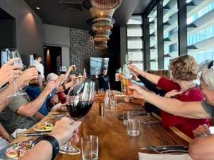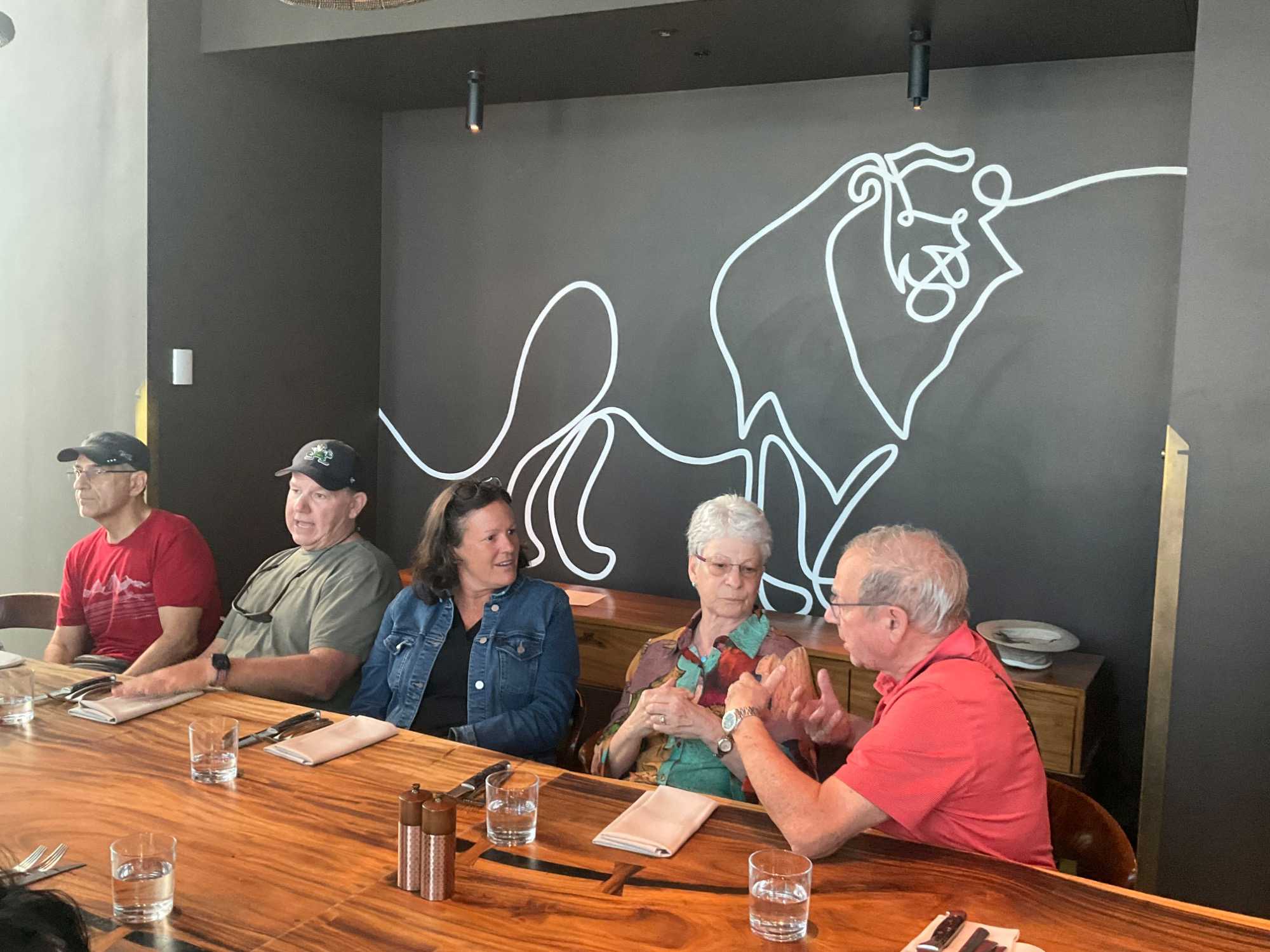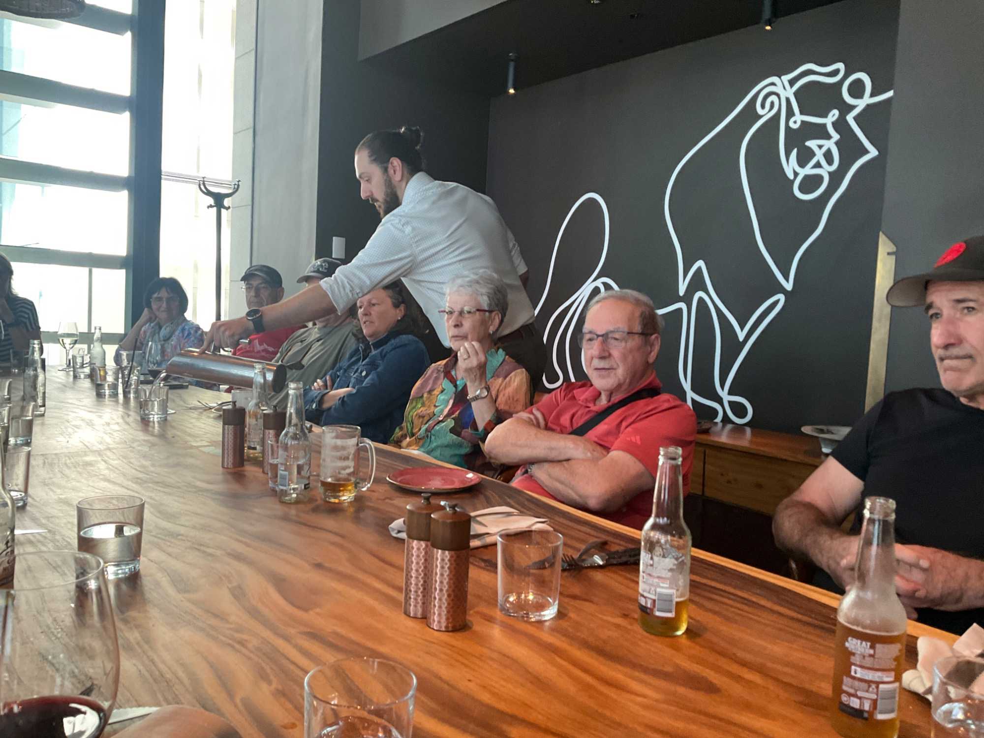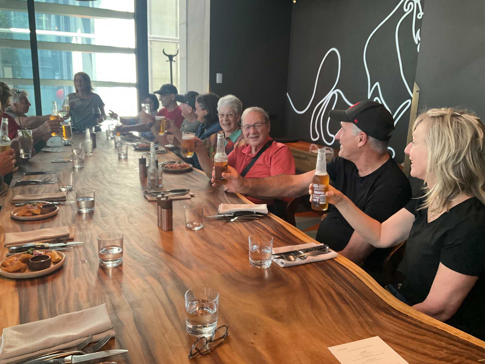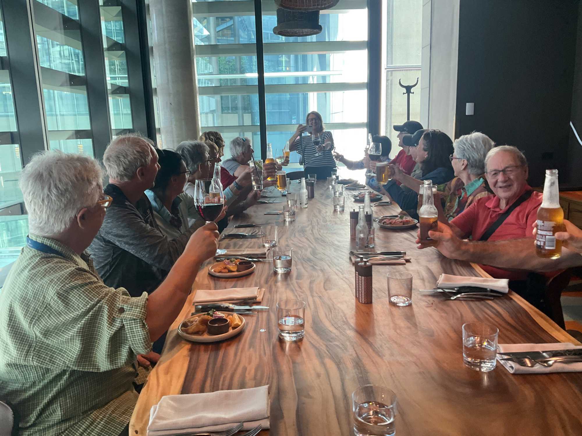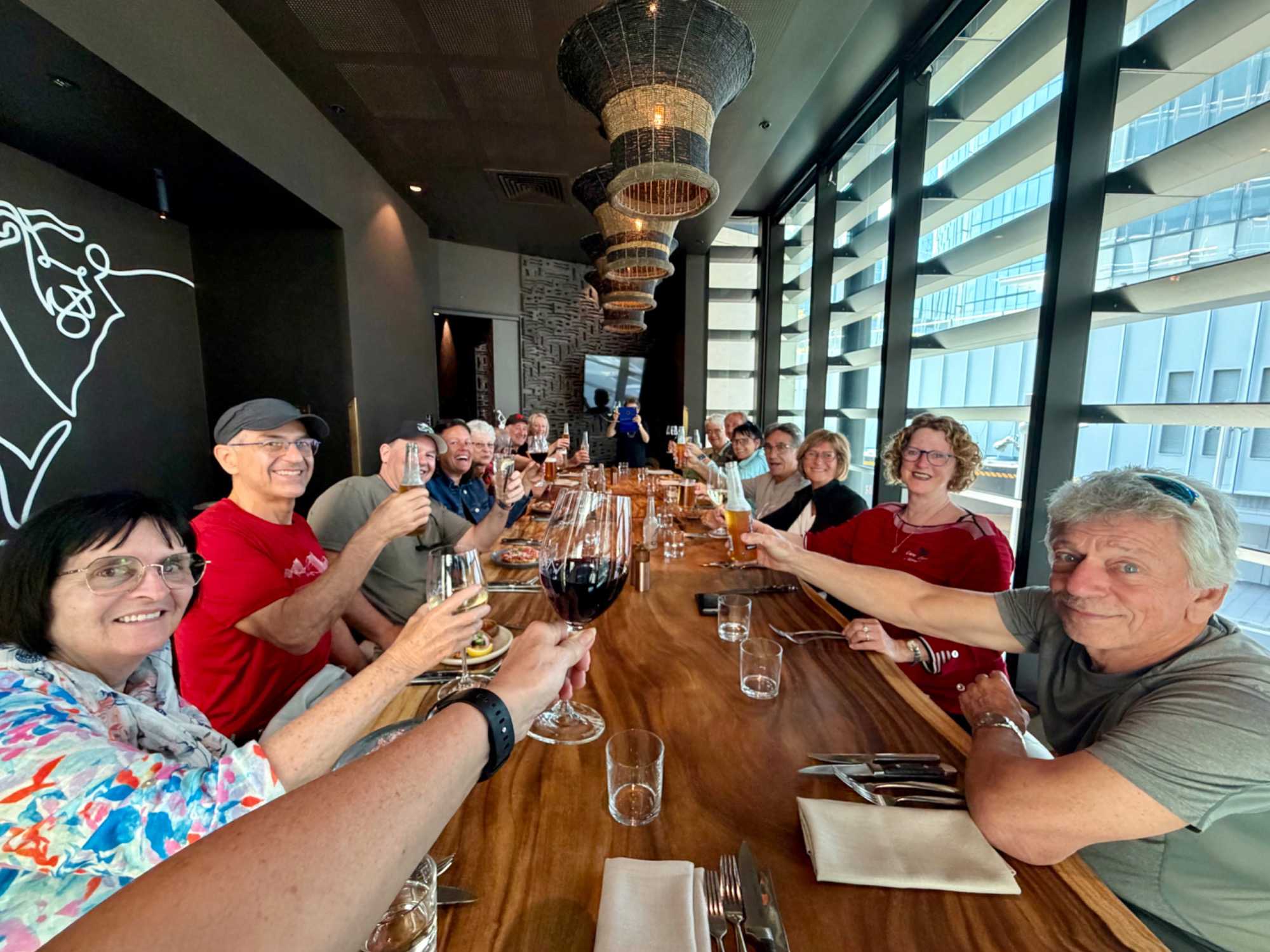 Cette ville, la plus la peuplée d’Australie dont l’air urbaine comprend une population de 5 000 000 habitants, est le plus important centre financier d’Australie et une destination touristique internationale. Mais avant d’aller plus loin, bien que nous ayons pris un déjeuner tardif dans l’avion, nous nous rendons au restaurant de The Meat and Wine Barangaroo. Le décor nous épate dès notre entrée. Les odeurs titillent nos papilles. On nous a réservé ‘le Salon le Lion ‘’ que pour notre groupe. Tous les mets sont exceptionnels, dans la présentation et bien sûr, les saveurs. Des steaks grillés au BBQ d’une tendreté à se rouler par terre, des brochettes de poulet présentées… à la verticale sur un support. Et j’allais oublier les calamars frits en entrée et les bruschetta qui auraient pu à elles seules faire preuve d’un repas complet. Et dire que certains se sont rendus à la crème brulée en s’excusant que ce diner des dieux leur servirait également de souper…et ce fut le cas pour la majorité d’entre nous.
