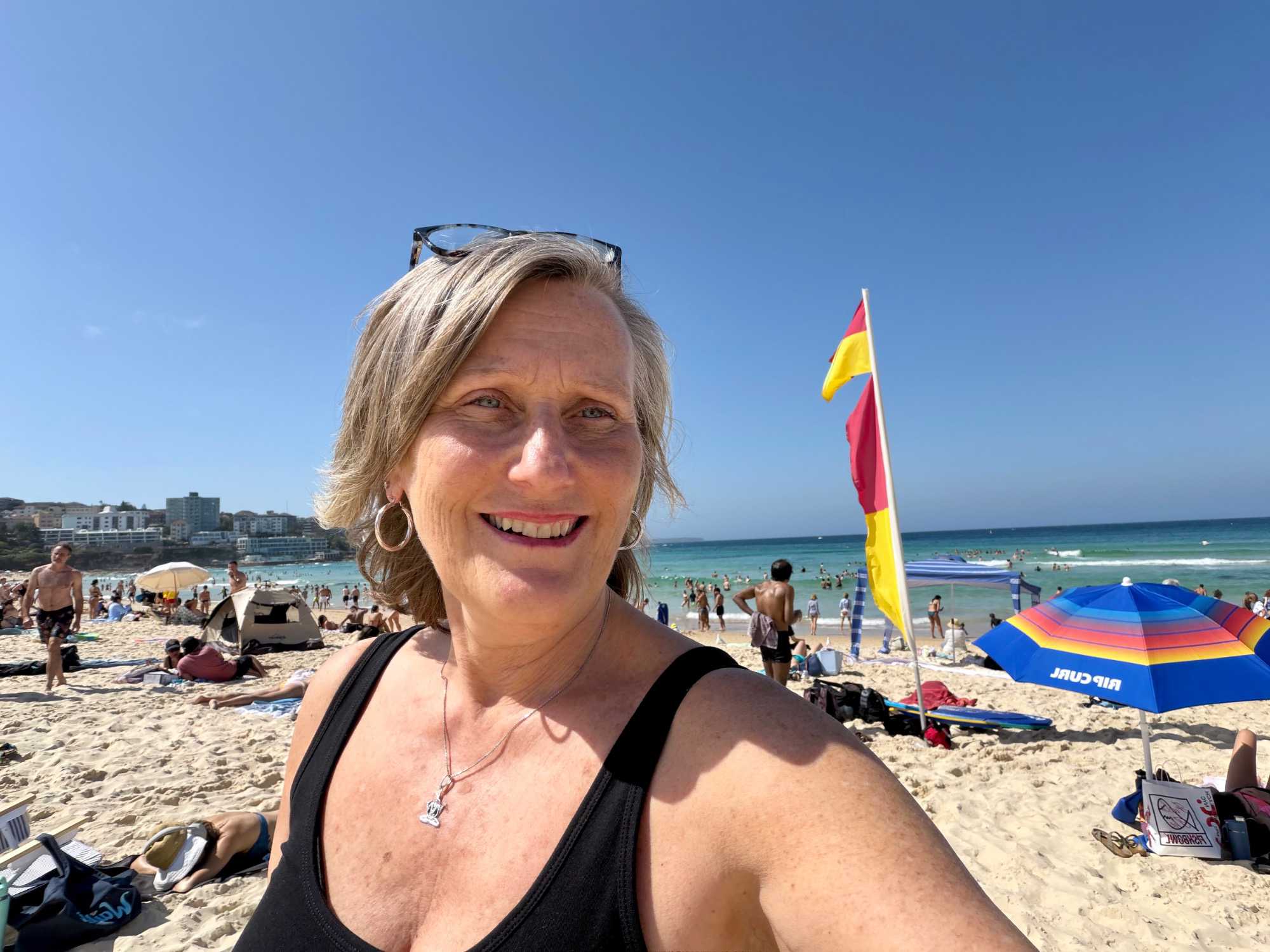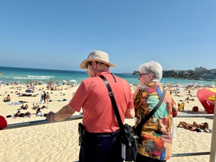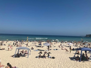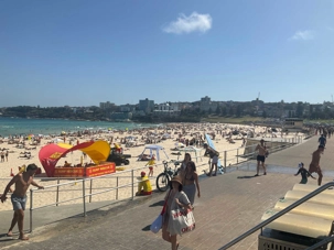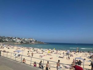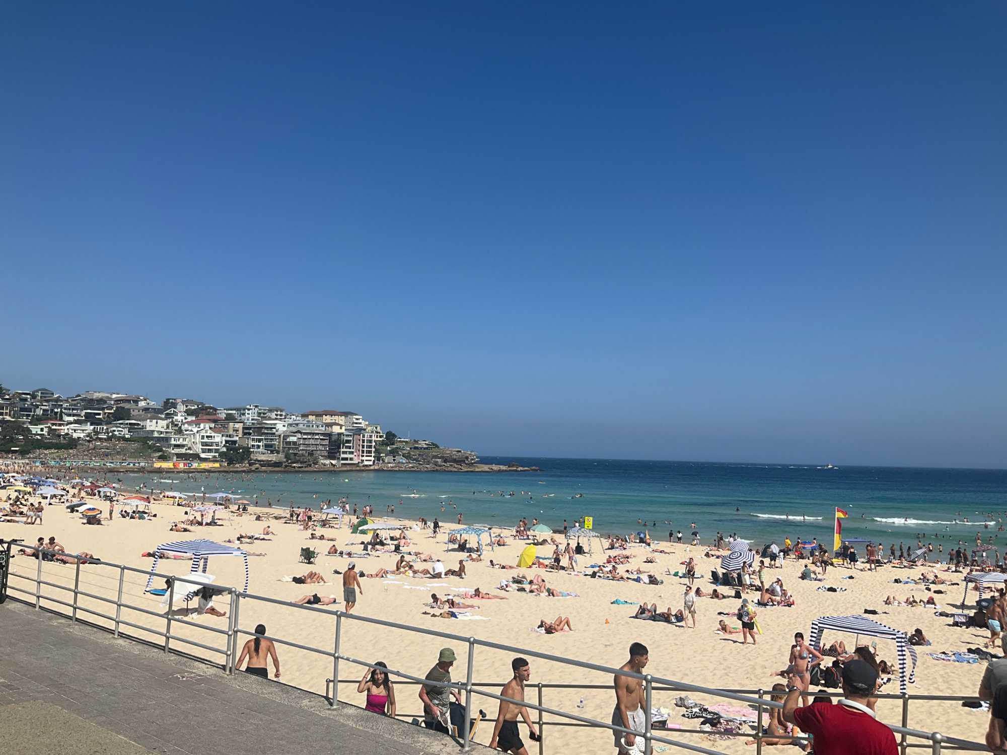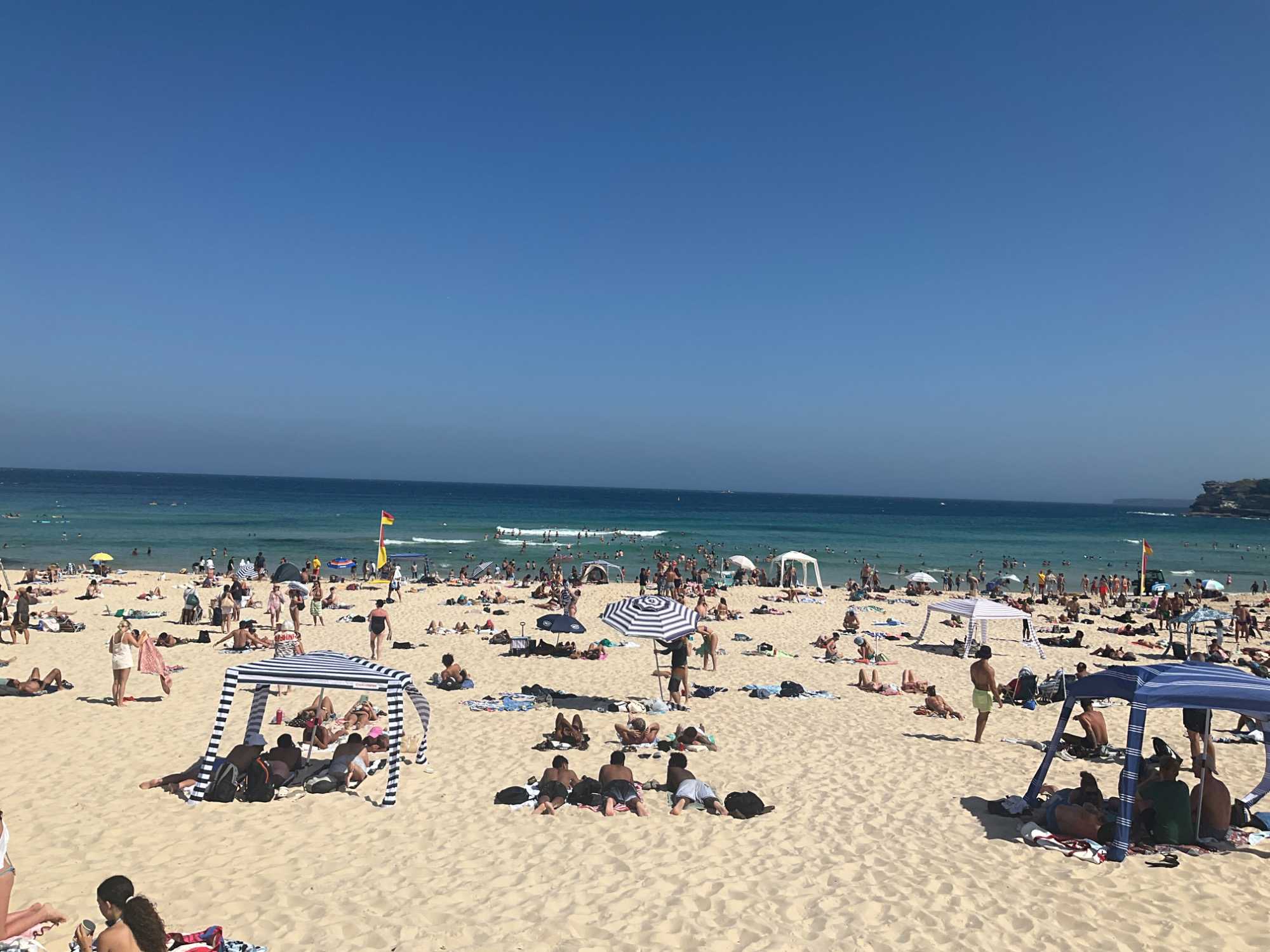 Piuis direction vers ce qui fait la renommée de la ville Bondi Beach. Je vous rappelle qu’ici nous sommes samedi. On a l’impression que tous les habitants de la villes s’y sont donnés rendez-vous, une immense plage bondée de jeunes en maillot dont les parties couvertes du corps …sont moins nombreuses que celles exposées hihi! Que de belles silhouettes un peu partout avec toute cette jeunesse mais nous, on n’a plus 20 ans, plutôt trois fois qu’une. Mais attention, toutes les générations sont ici bien présentes pour profiter des chauds rayons de l’été. L’endroit fait la joie des surfeurs à certains postes spécifiques. Bondie a également fait parler d’elle en Amérique pas plus tard qu’en janvier dernier avec l’attentat terroriste qu’elle a subi faisant 16 morts et de nombreux blessés. Nous nous en sommes souvenues lors de notre passage sur le petit pont. Quel bel endroit pour profiter de la mer même si parfois les requins s’y aventurent. Heureusement, les premiers sauveteurs en mer datent ici de 1903 et on les voient bien présents avec les drapeaux qu’ils positionnent pour délimiter les espaces de baignade.