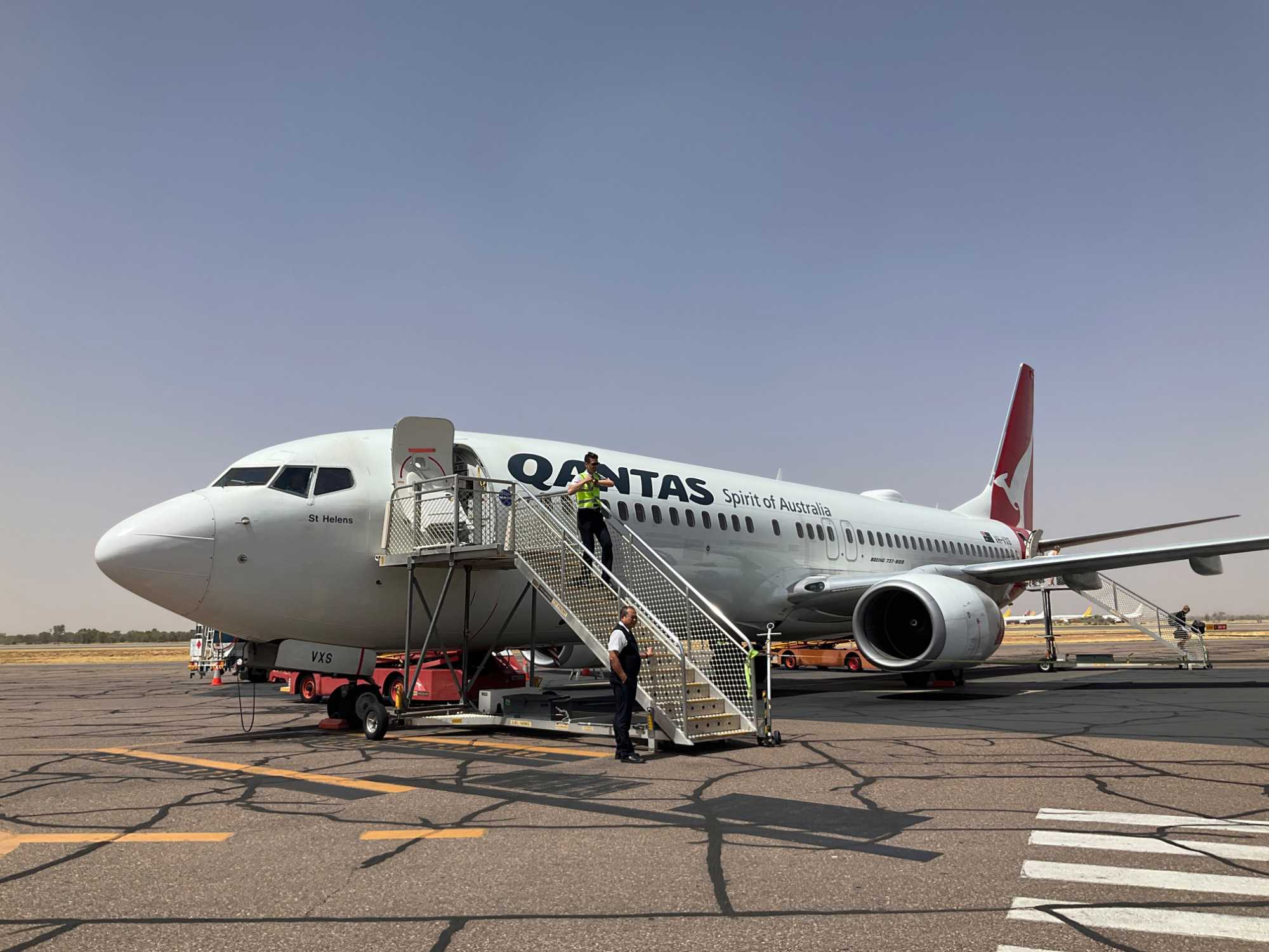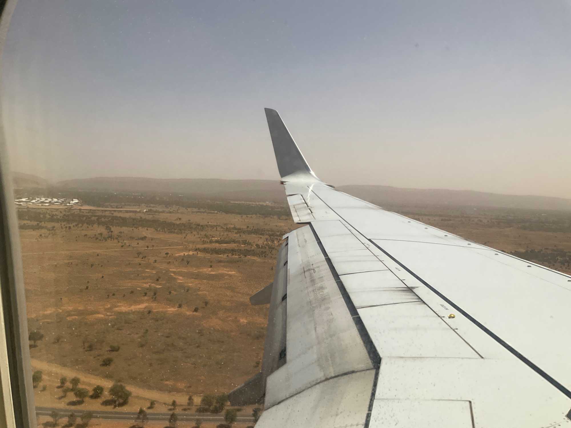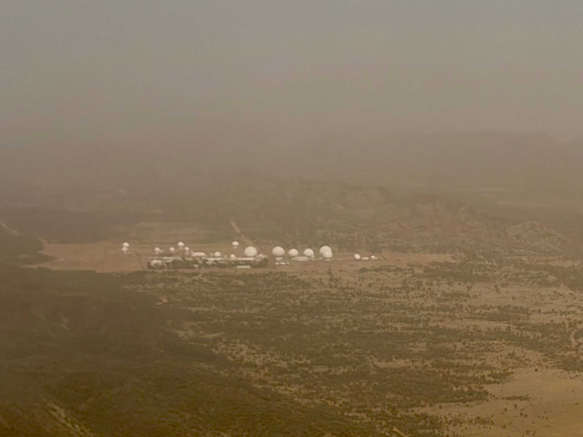 La journée commence par un bon petit ‘’gros’’ déjeuner à notre hôtel Pullman de Sydney. Quelle bonne idée d’avoir choisi un hébergement tout près de l’aéroport ce qui nous permet de relaxer un peu plus, enfin peut-être pas beaucoup plus car nous avons rendez-vous dès 7:15, on s’ennuyait de prendre l’avion hihi. On a rencontré notre nouveau guide, André qui nous accompagne pour 9 jours. Il nous amène donc à l’aéroport en 10 minutes. Aujourd’hui pour faire changement, on volera avec Qantas…la compagnie d’aviation (Queenslandand Northern and Territory Aerial services). L’avion mets deux heures et demi pour se rendre à destination. Lorsque les nuages se dispersent, on voie d’abord les terres divisées en rectangles puis, apparaît les terres rouges. Vous ai-je dit que nous allions dans la région appelée…le Centre Rouge? En fait c’est un désert rouge car il n’y a pratiquement pas d’habitations sur plus de 1000 kilomètres. Avant d’arriver à Alice Springs, du haut du ciel on a vu des dômes étranges concentrés sur un espace de terrain. Qu’est-ce que ça pouvait bien être. Dès ses premiers commentaires sur cette région de l’Australie, et spécifiquement sur les dômes, on voie que notre André a de l’expérience derrière la cravate. On l’aime déjà. Il nous explique que ces grandes sphères blanches protègent des satellites utilisées pour des activités de surveillance et de renseignements menées conjointement par l’Australie et les États-Unis car, loin des côtes on évite toute interception des signaux par des puissances étrangères. Chut, ne le dites à personne, on est tous dans le secret des dieux. On a l’impression d’être dans un film d’espionnage.