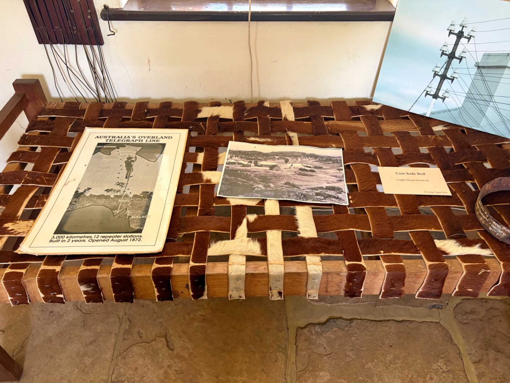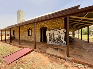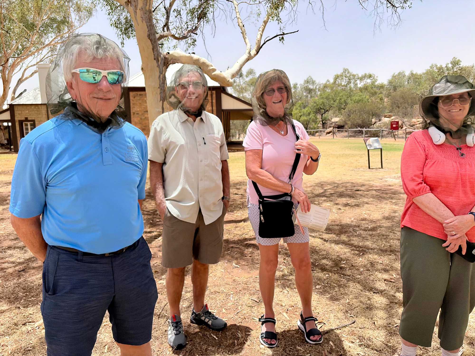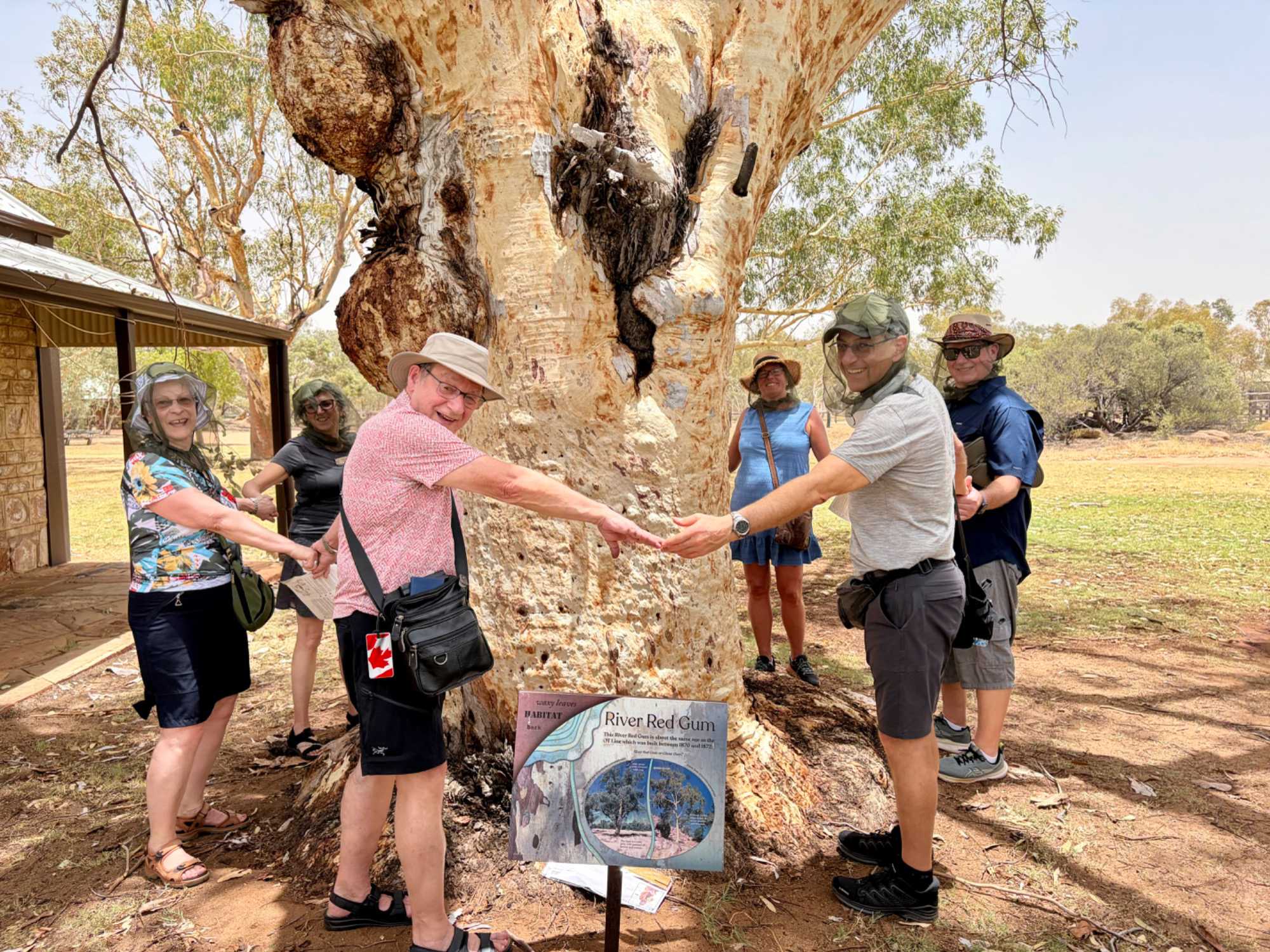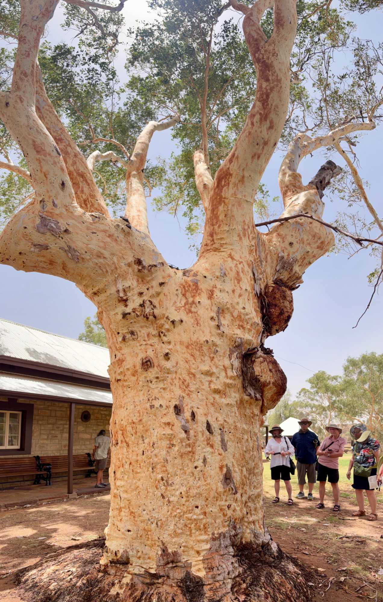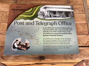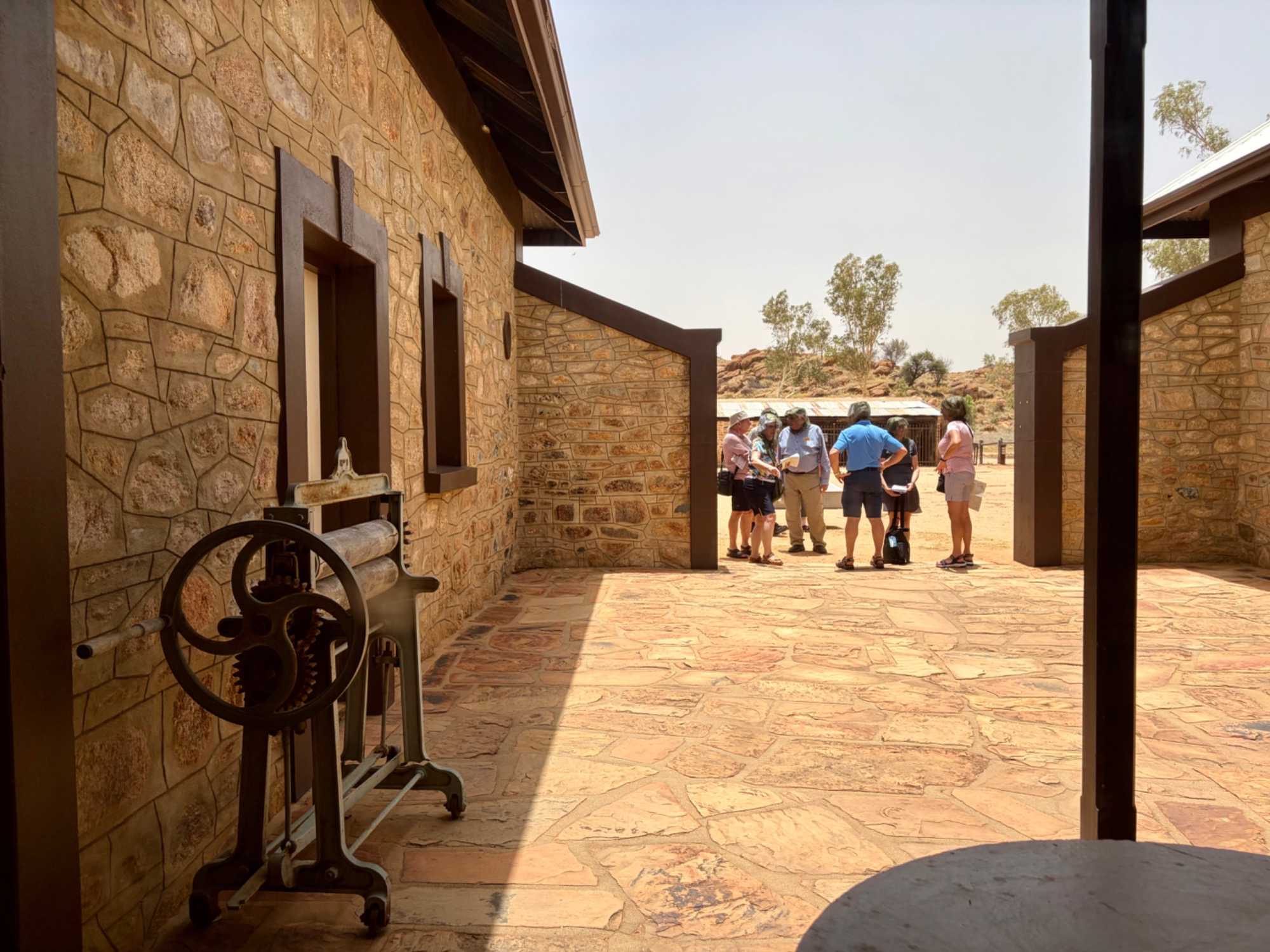 Nous nous sommes rendus voir le résultat des travaux de Todd c’est-à dire : la vieille station de télégraphe qui est devenue un petit musée prenant place dans l'ancienne station du télégraphe qui fut construite avec des pierres de la région. Les plus ‘’techniques’’ d’entre-nous, eurent la chance de démystifier les diverses difficultés de la pose de la ligne télégraphique dans les zones arides des lieux dans les années 1870. Imaginez; pas d’ordinateur pour tout calculer, quel génie on avait quand même en ce 19e s. Les différentes sections des bâtiments nous font revivre la vie sur ces lieux au milieu du 19e siècle: école, poste, chambre, cuisine et bien sûr la station elle-même de télégraphe, la seule dont ils en on fait un musée sur une vingtaine à travers l’Australie. Ici, tout à été redécoré de cette époque. Les immenses arbres d’eucalyptus nous ont également captivés. On reconnait bien l’odeur au simple toucher de ses feuilles. André nous apprend que seulement en Australie, il existe entre 700 et 800 espèces d’eucalyptus, pas mal non?
