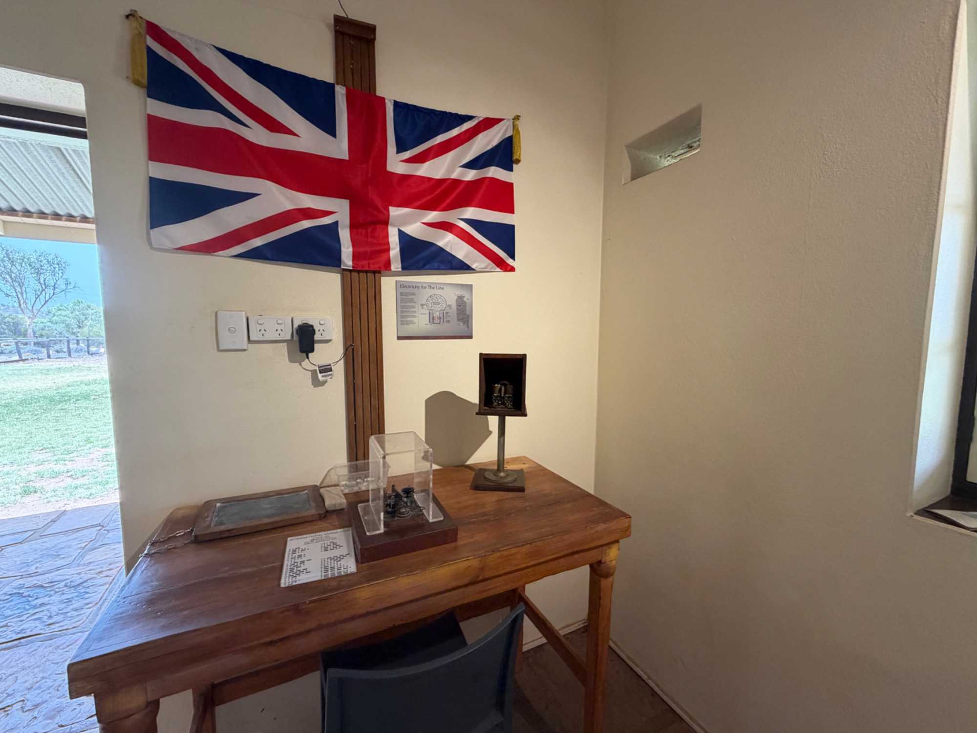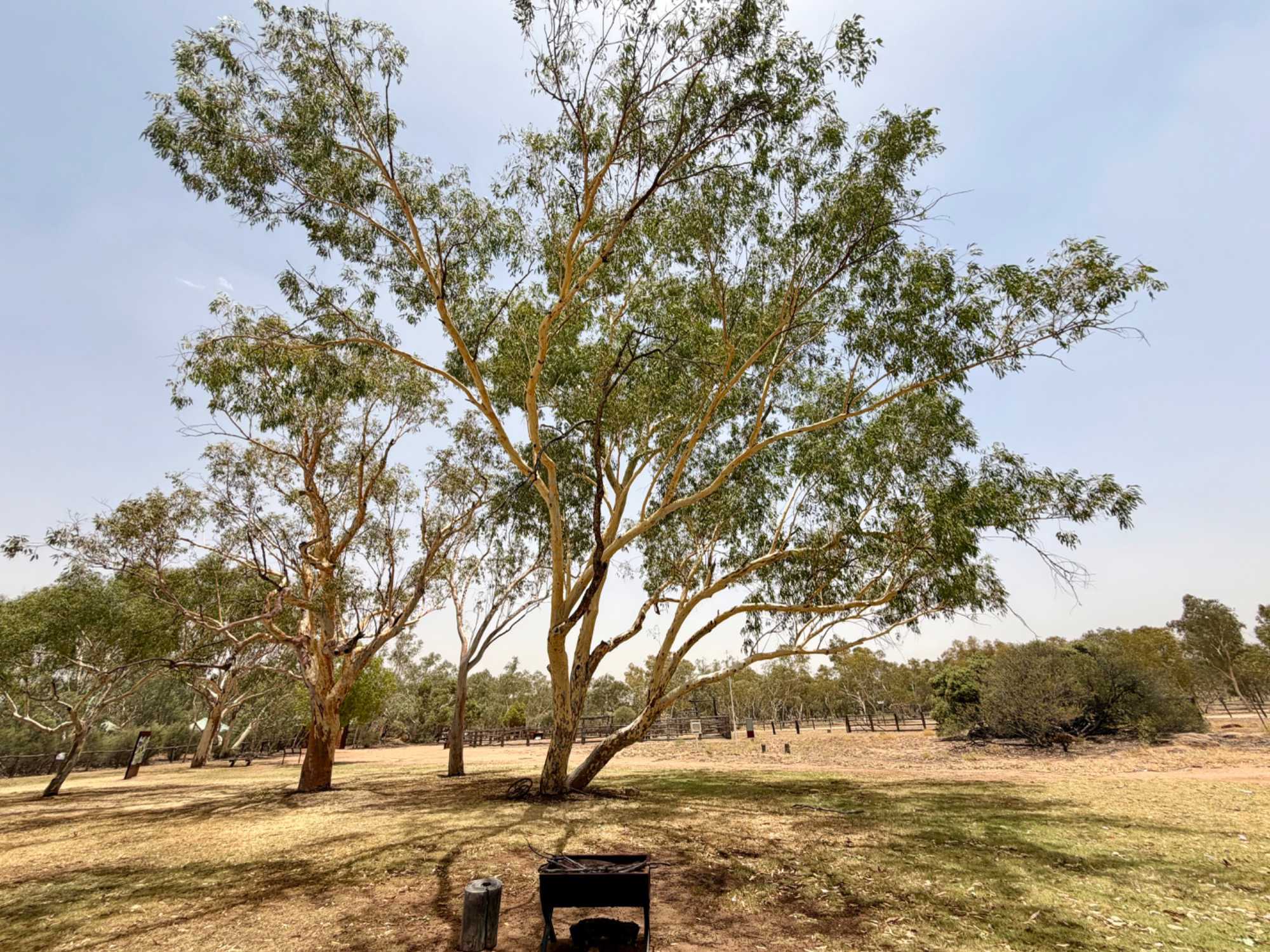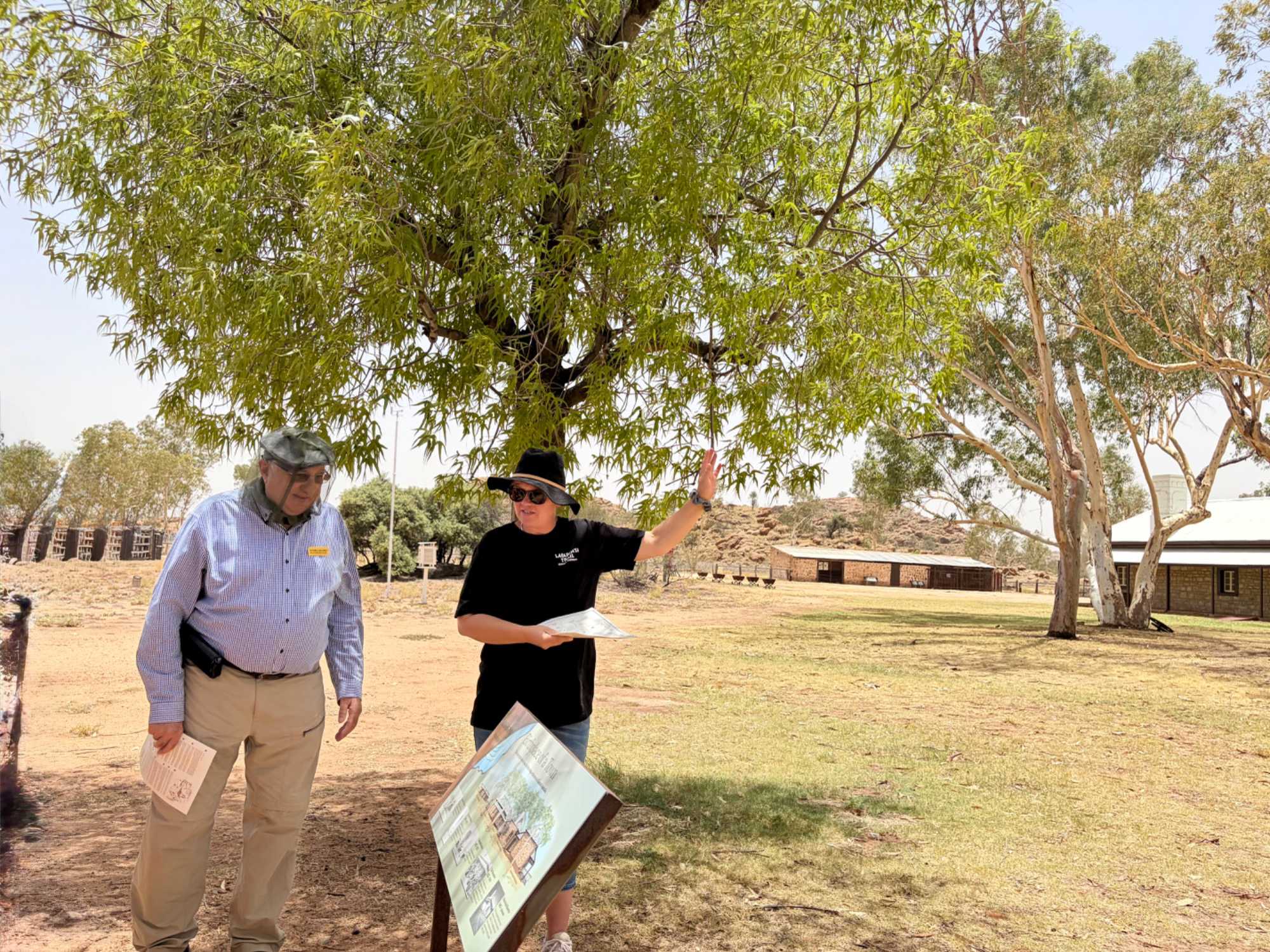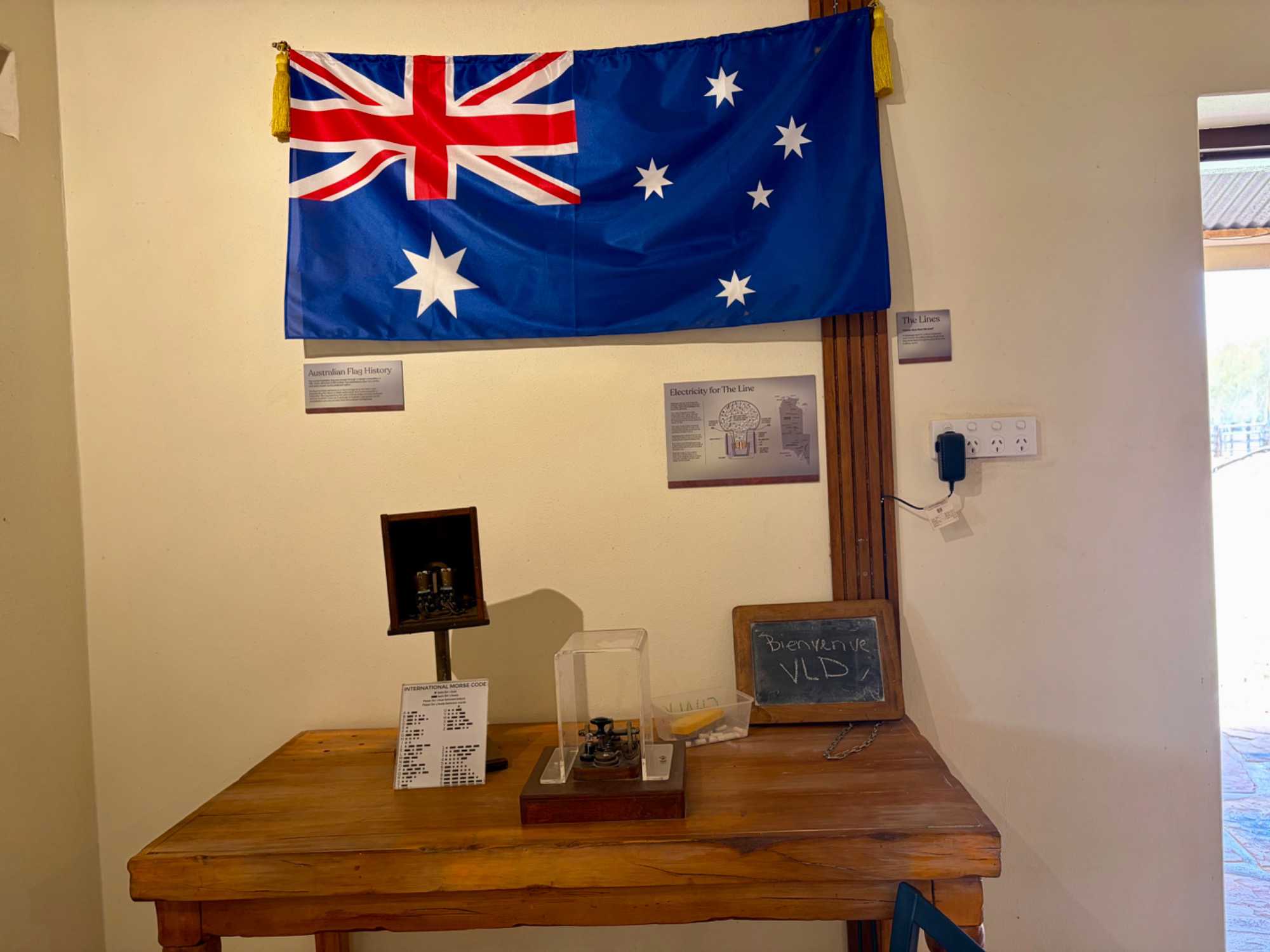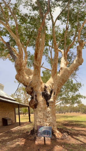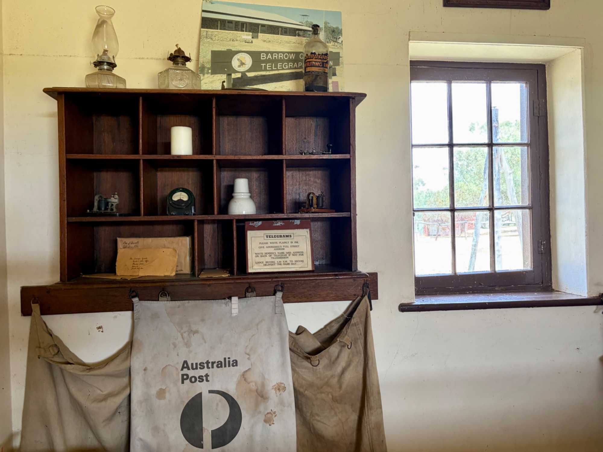 Nous nous sommes rendus voir le résultat des travaux de Todd c’est-à dire : la vieille station de télégraphe qui est devenue un petit musée prenant place dans l'ancienne station du télégraphe qui fut construite avec des pierres de la région. Les plus ‘’techniques’’ d’entre-nous, eurent la chance de démystifier les diverses difficultés de la pose de la ligne télégraphique dans les zones arides des lieux dans les années 1870. Imaginez; pas d’ordinateur pour tout calculer, quel génie on avait quand même en ce 19e s. Les différentes sections des bâtiments nous font revivre la vie sur ces lieux au milieu du 19e siècle: école, poste, chambre, cuisine et bien sûr la station elle-même de télégraphe, la seule dont ils en on fait un musée sur une vingtaine à travers l’Australie. Ici, tout à été redécoré de cette époque. Les immenses arbres d’eucalyptus nous ont également captivés. On reconnait bien l’odeur au simple toucher de ses feuilles. André nous apprend que seulement en Australie, il existe entre 700 et 800 espèces d’eucalyptus, pas mal non?