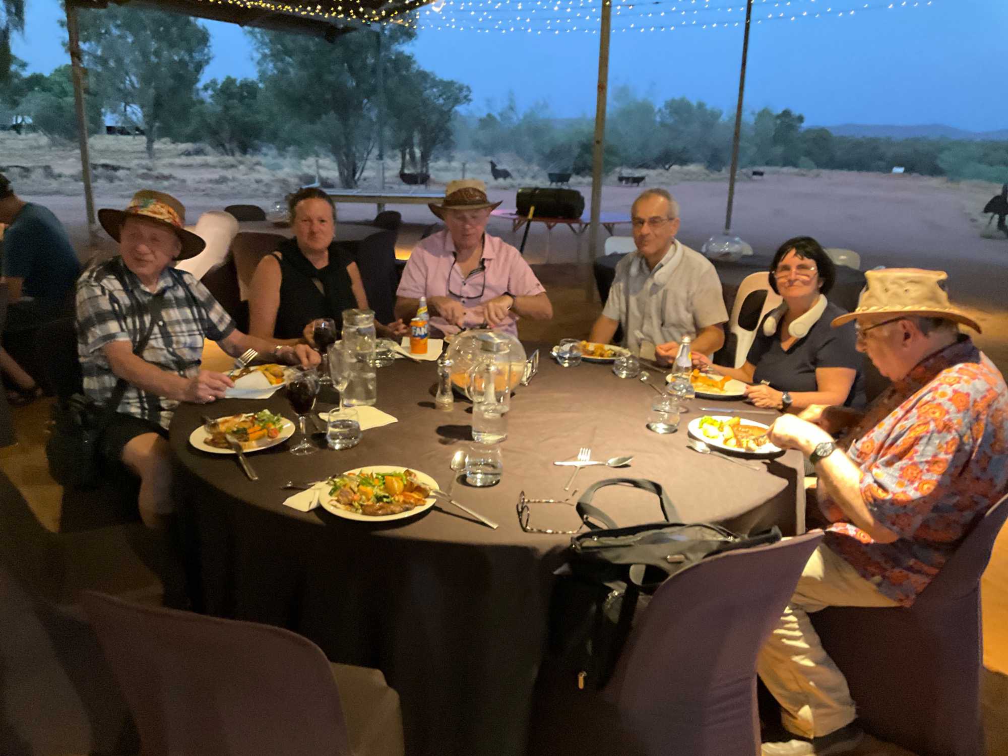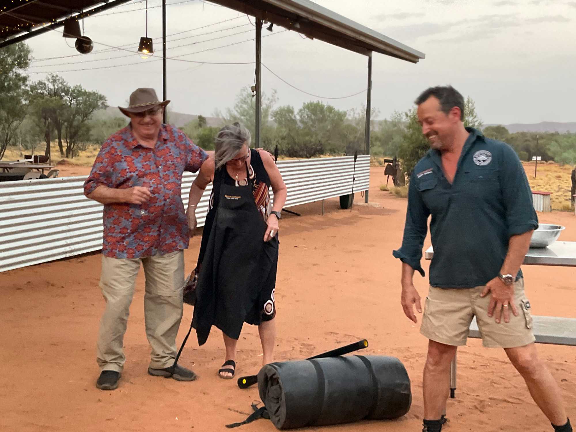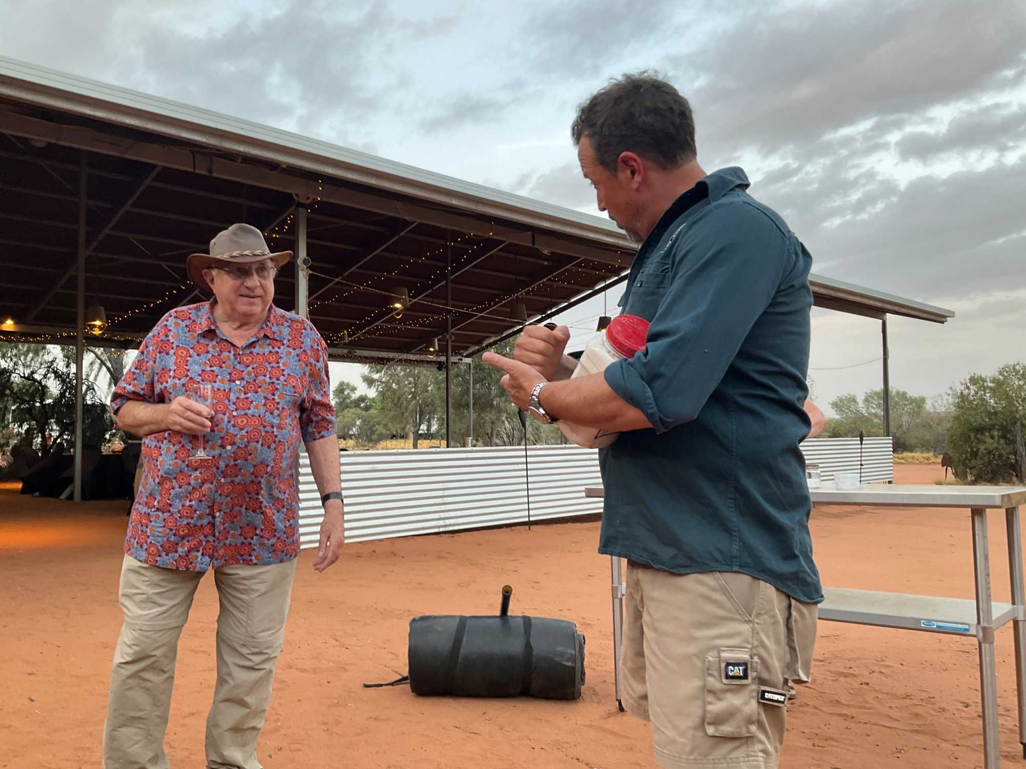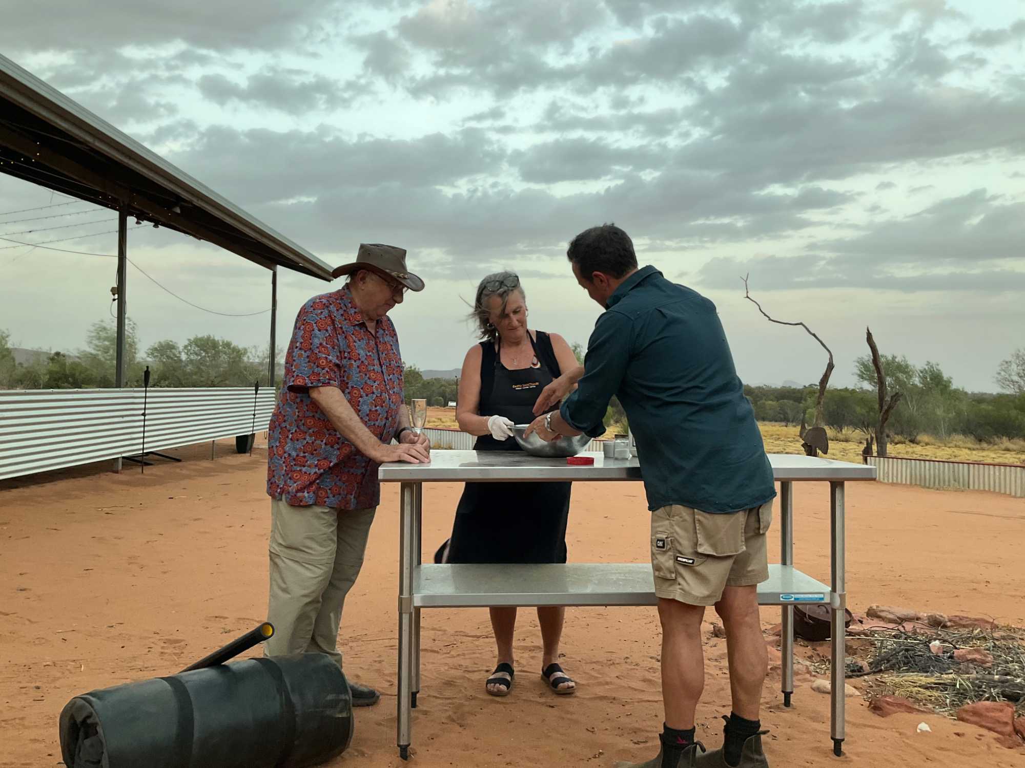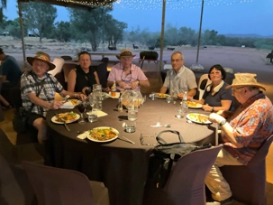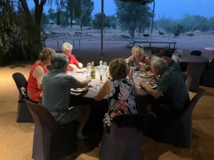 À une douzaine de kilomètres de notre hôtel mais en plein désert aride de l’Outback, se trouve un lieu étrange : Bienvenue au Earth Sanctuary « Spirit of the Outback » fondé en 1999, site unique et exceptionnel primé. Une famille, des frères, se sont installés ici, dans ce désert du centre rouge australien, il y a une vingtaine d’années. Ils ont créé cet espèce de sanctuaire qui offre un souper tout à fait hors de l’ordinaire au cours duquel écologie, culture et astronomie sont à l’honneur.Il est l'un des premiers sites neutres en carbone du Territoire du Nord. Lors du souper, tout au fond, les magnifiques monts MacDonnell (attention ne pas confondre ici avec MacDonald hihi!) dominait les lieux avec son ciel étoilé à couper le souffle. Nos hôtes nous ont captivés avec des récits passionnants sur l'écologie, la culture et l'astronomie locale. Notre collègue Josée a même servi de cobaye pour participer à cuisiner un pain avec leur recette particulière “dempa” ( d’inspiration aborigène) avec un ingrédient magique (de la bière ajoutée) que nous avons eu l’occasion de goûter en fin de soirée.