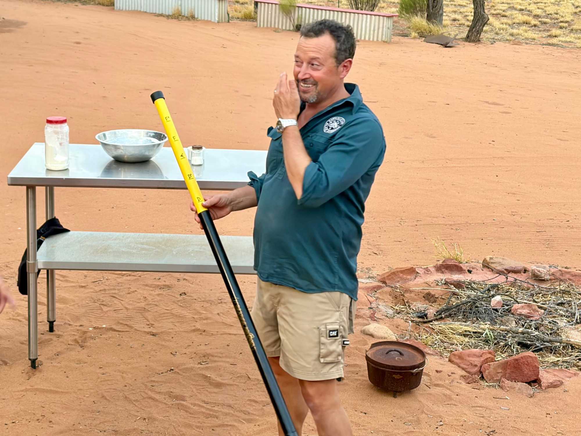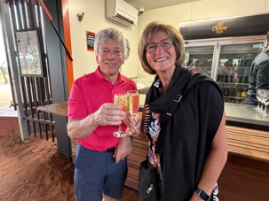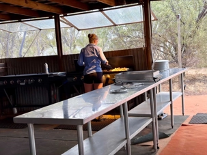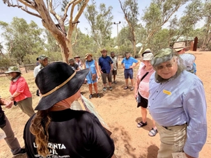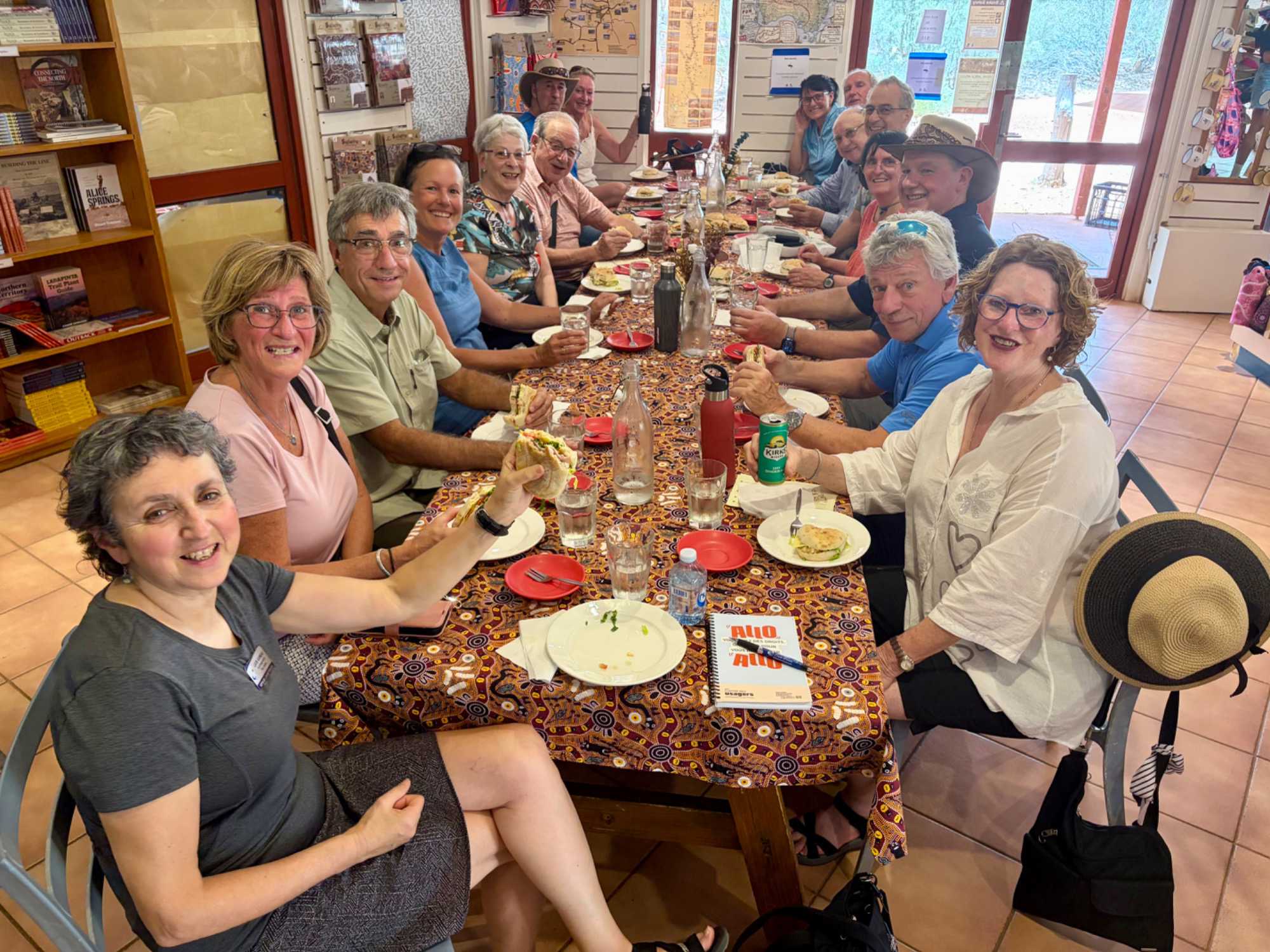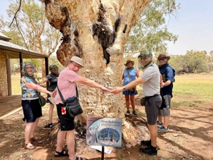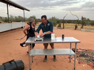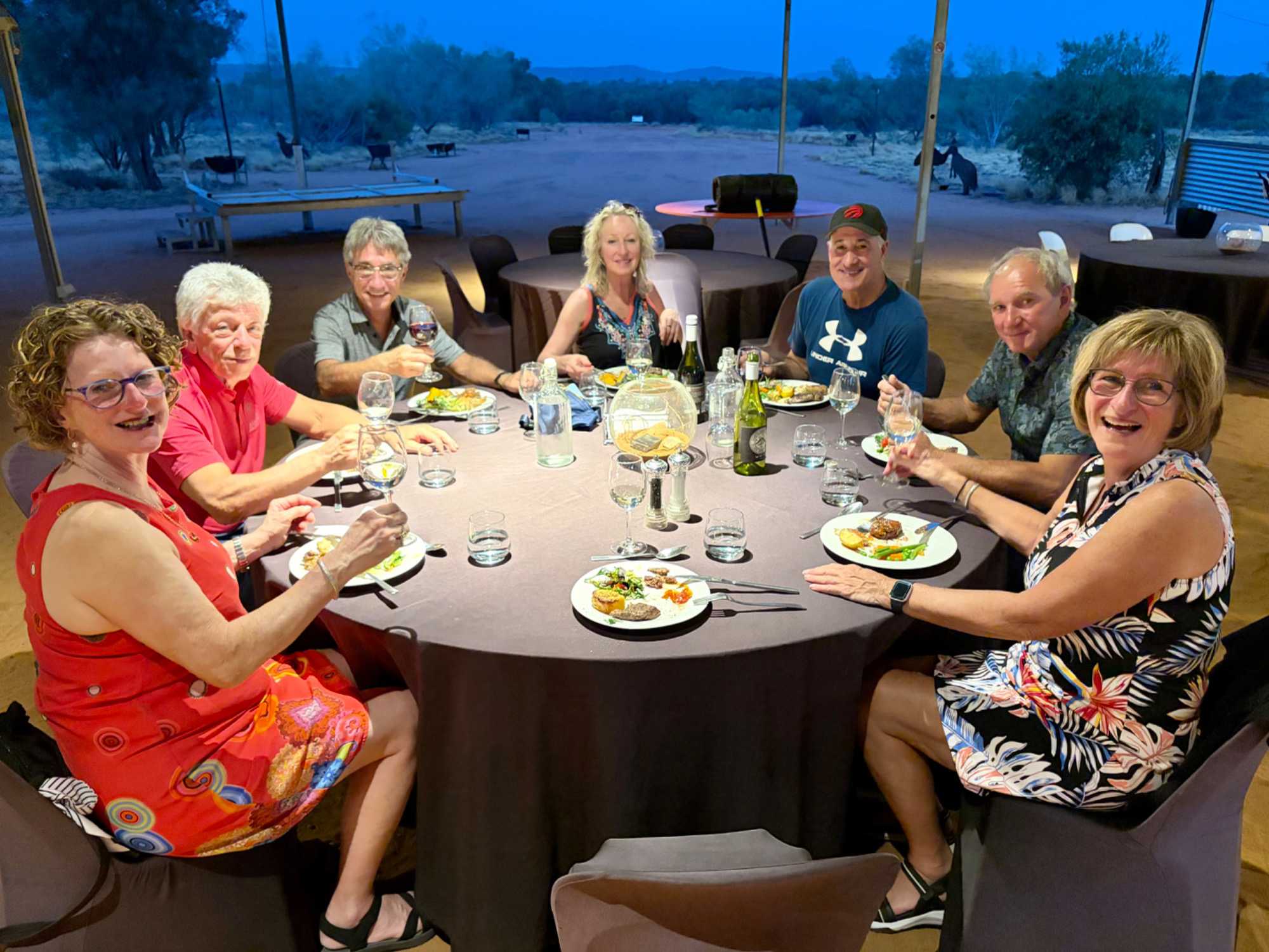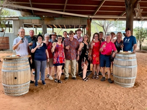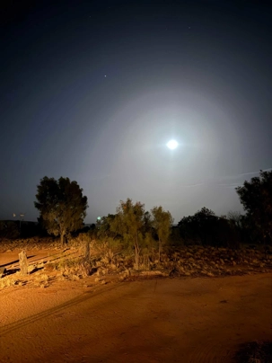À une douzaine de kilomètres de notre hôtel mais en plein désert aride de l’Outback, se trouve un lieu étrange : Bienvenue au Earth Sanctuary « Spirit of the Outback » fondé en 1999, site unique et exceptionnel primé. Une famille, des frères, se sont installés ici, dans ce désert du centre rouge australien, il y a une vingtaine d’années. Ils ont créé cet espèce de sanctuaire qui offre un souper tout à fait hors de l’ordinaire au cours duquel écologie, culture et astronomie sont à l’honneur.Il est l'un des premiers sites neutres en carbone du Territoire du Nord. Lors du souper, tout au fond, les magnifiques monts MacDonnell (attention ne pas confondre ici avec MacDonald hihi!) dominait les lieux avec son ciel étoilé à couper le souffle. Nos hôtes nous ont captivés avec des récits passionnants sur l'écologie, la culture et l'astronomie locale. Notre collègue Josée a même servi de cobaye pour participer à cuisiner un pain avec leur recette particulière “dempa” ( d’inspiration aborigène) avec un ingrédient magique (de la bière ajoutée) que nous avons eu l’occasion de goûter en fin de soirée.