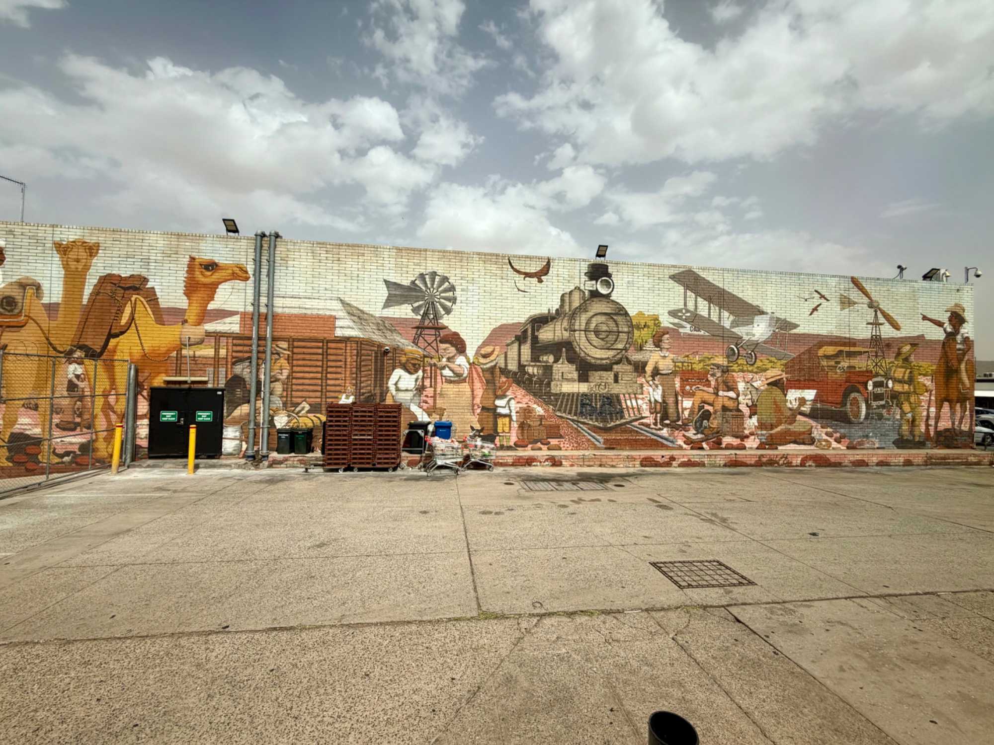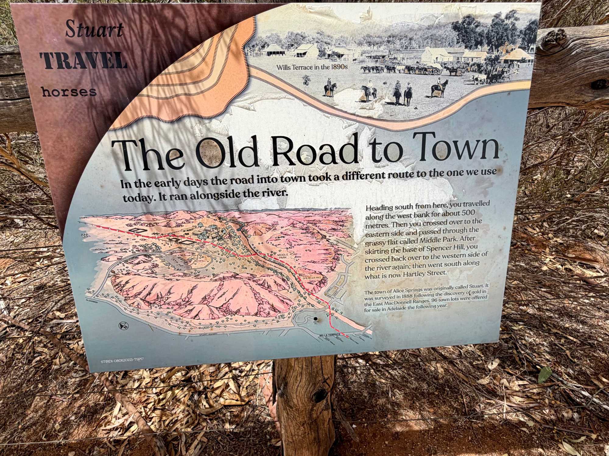 On comprend vite que nous sommes sur un territoire désertique par la chaleur qui entre partout sur nos pores de peau lors d’un arrêt à l’identification du nom de la ville où l’on a pris une photo à 38 degrés Celsius. Juste à côté une ligne de chemin relie Darwin et Adélaide.