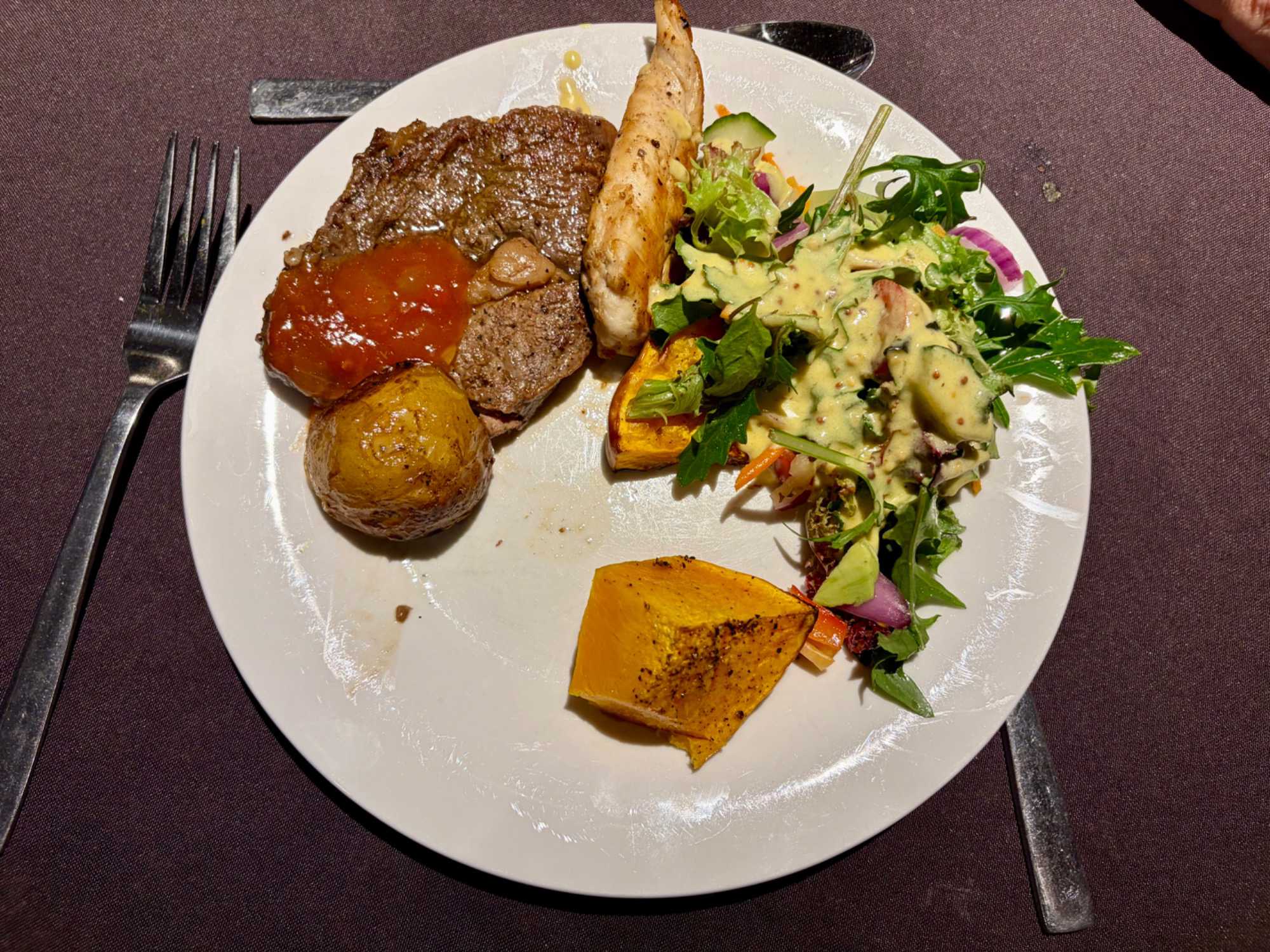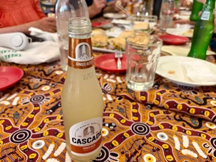 L’accueil était typiquement australien. Simple, humoristique et chaleureux. Bière locale, prosecco ou autre nous sont servis. Le buffet fut de type Bar-B-Q aux saveurs sauvages australiennes. Précédemment en entrées, de petits canapés inspirés de la cuisine australienne servis en plateau. Ici les viandes sont à l’honneur: saucisses, tendres lanières de poulet, et de succulentes entrecôtes de bœuf d'origine locale d'Alice Springs. Ce menu était accompagné de pommes de terre croustillantes, des petits pois et carottes vapeur, ainsi qu'une savoureuse sauce maison. Non non, vous avez commencé à lire, il vous faut également lire ce qu’on nous propose comme dessert : un pudding aux dattes maison, nappés de crème fouettée, de fraises et d'une onctueuse sauce caramel chaude. Pas mal non?