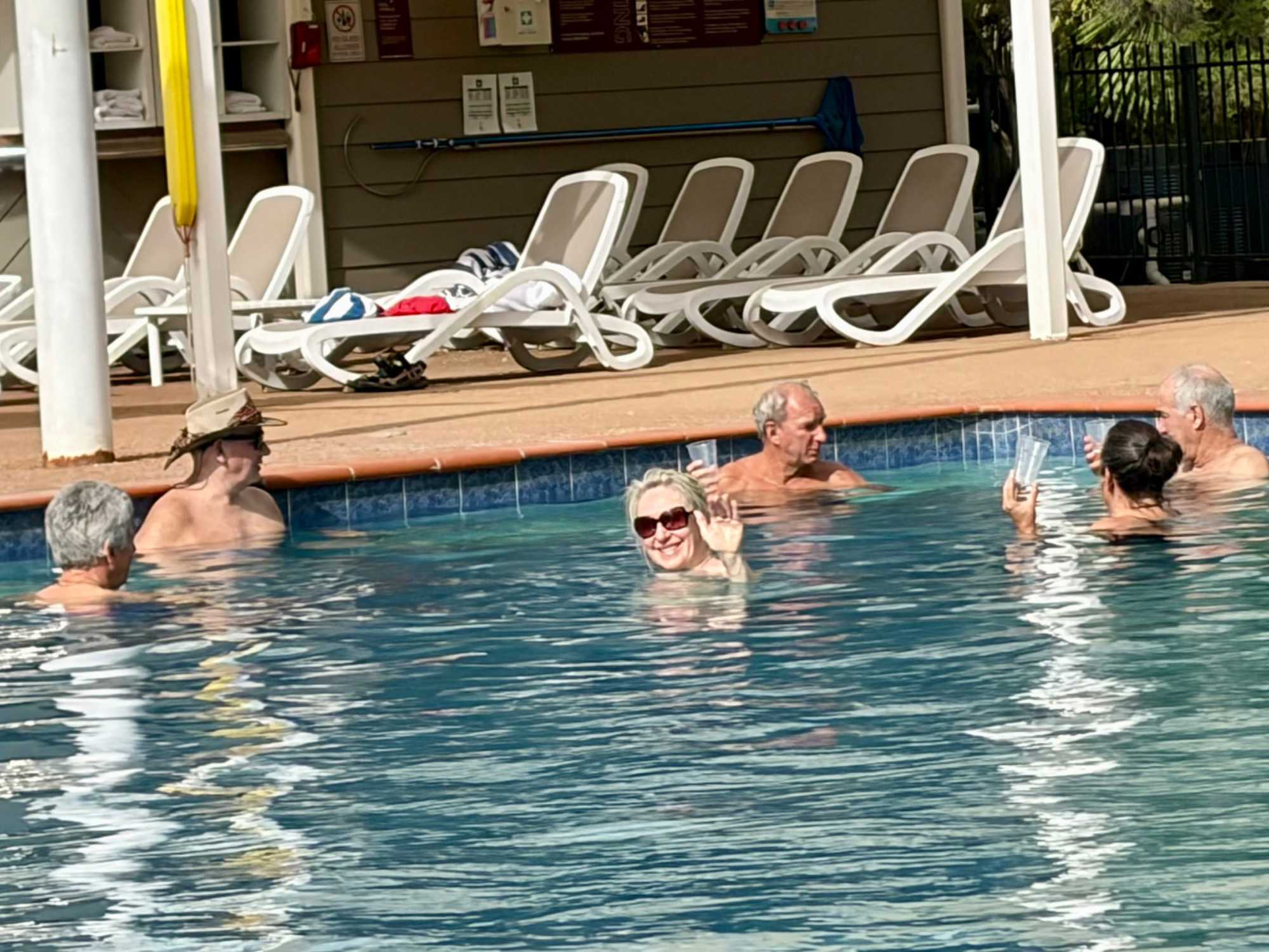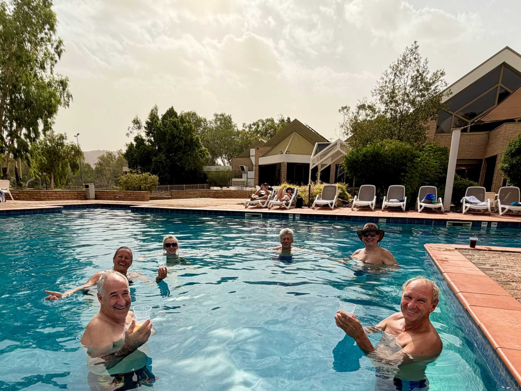 Un petit repos à notre Hôtel DoubleTree Hilton ont permis à plusieurs d’entre nous de se rafraîchir à la piscine avant d’aller à notre souper, un peu particulier, où les vêtements de plein air et …les chapeaux anti-mouches sont de mises, au cas où, même si ces insectes ne piquent pas.